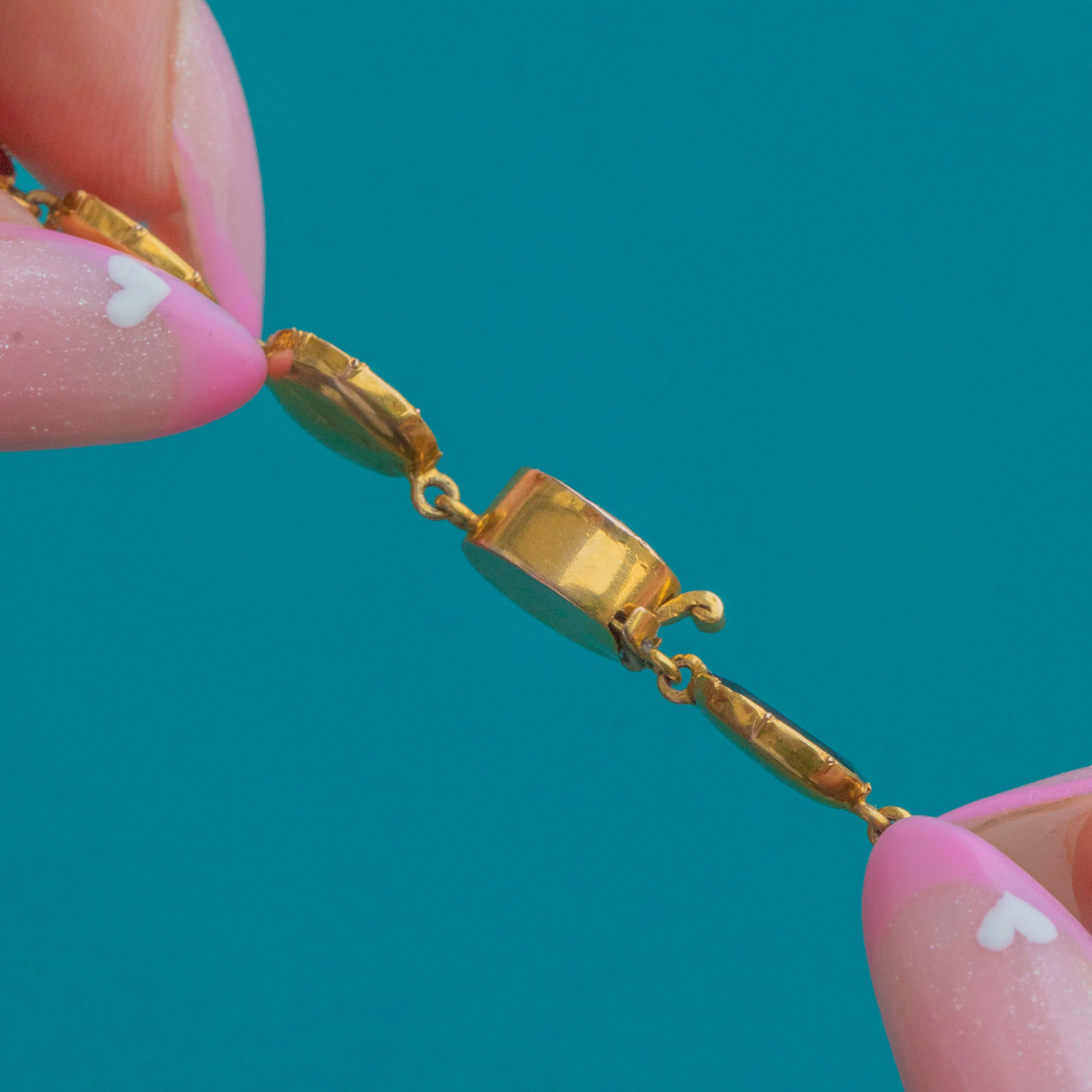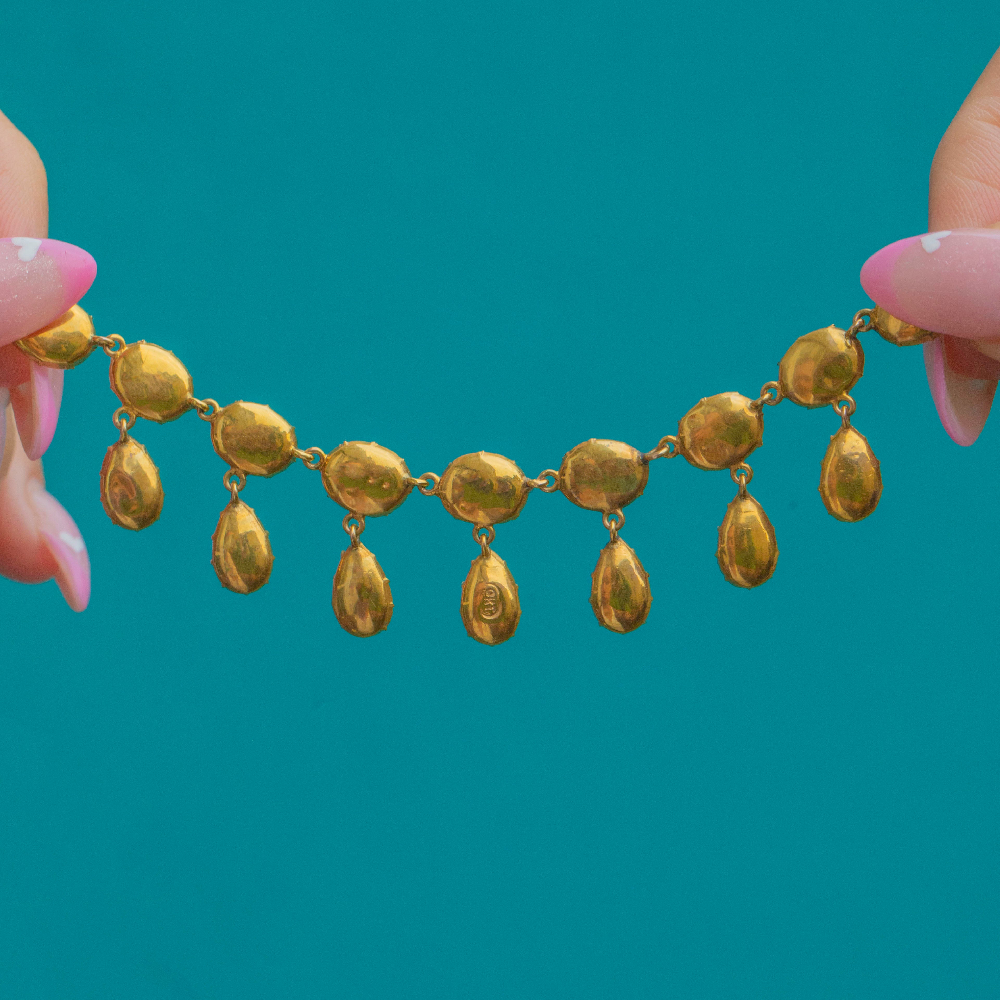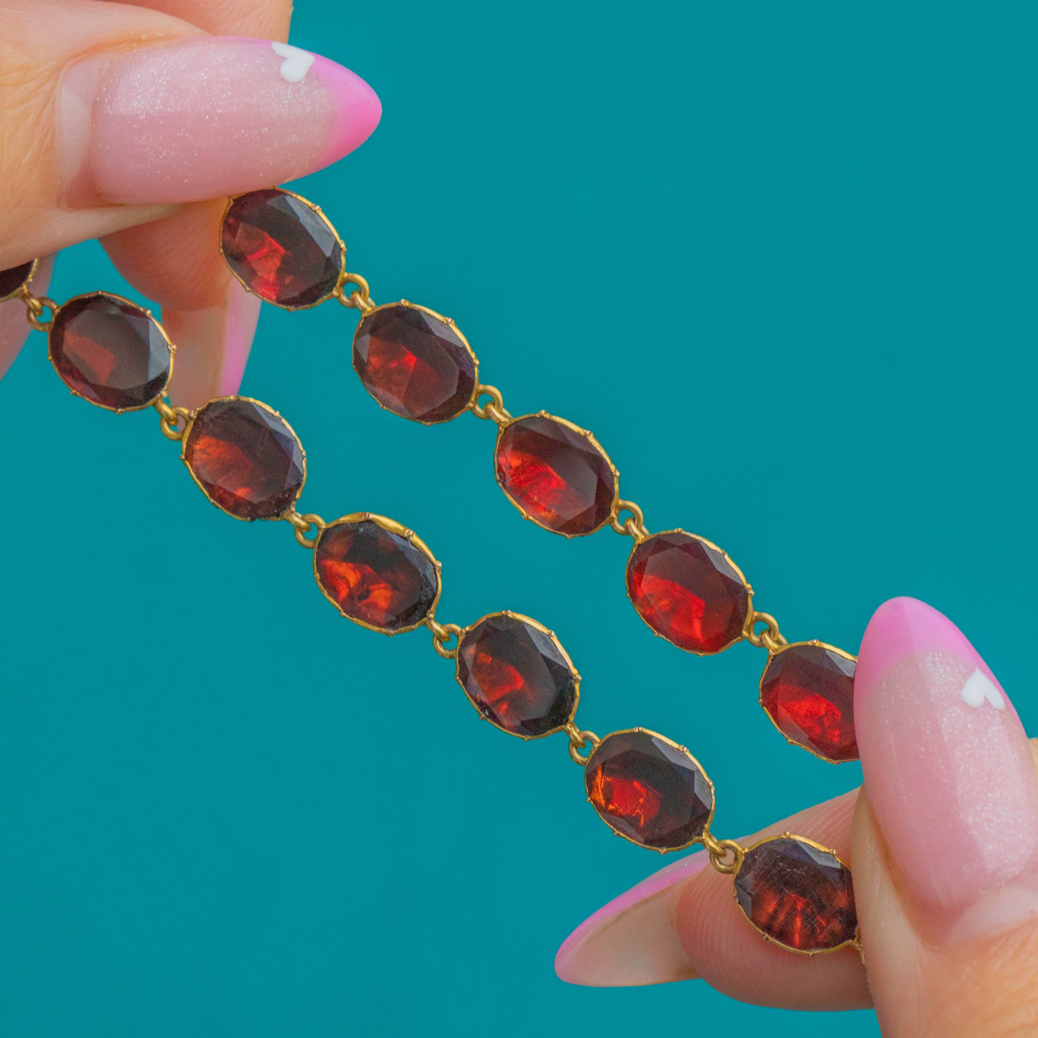 EXCELLENT: The Garnets are well matched in colour and condition with minimal surface wear. There is some gentle wear to the reverse of the necklace, commensurate with age, but the Gold is beautifully bright, the settings and clasp remain secure, and the domed Gold backs are smooth and beautifully tactile.