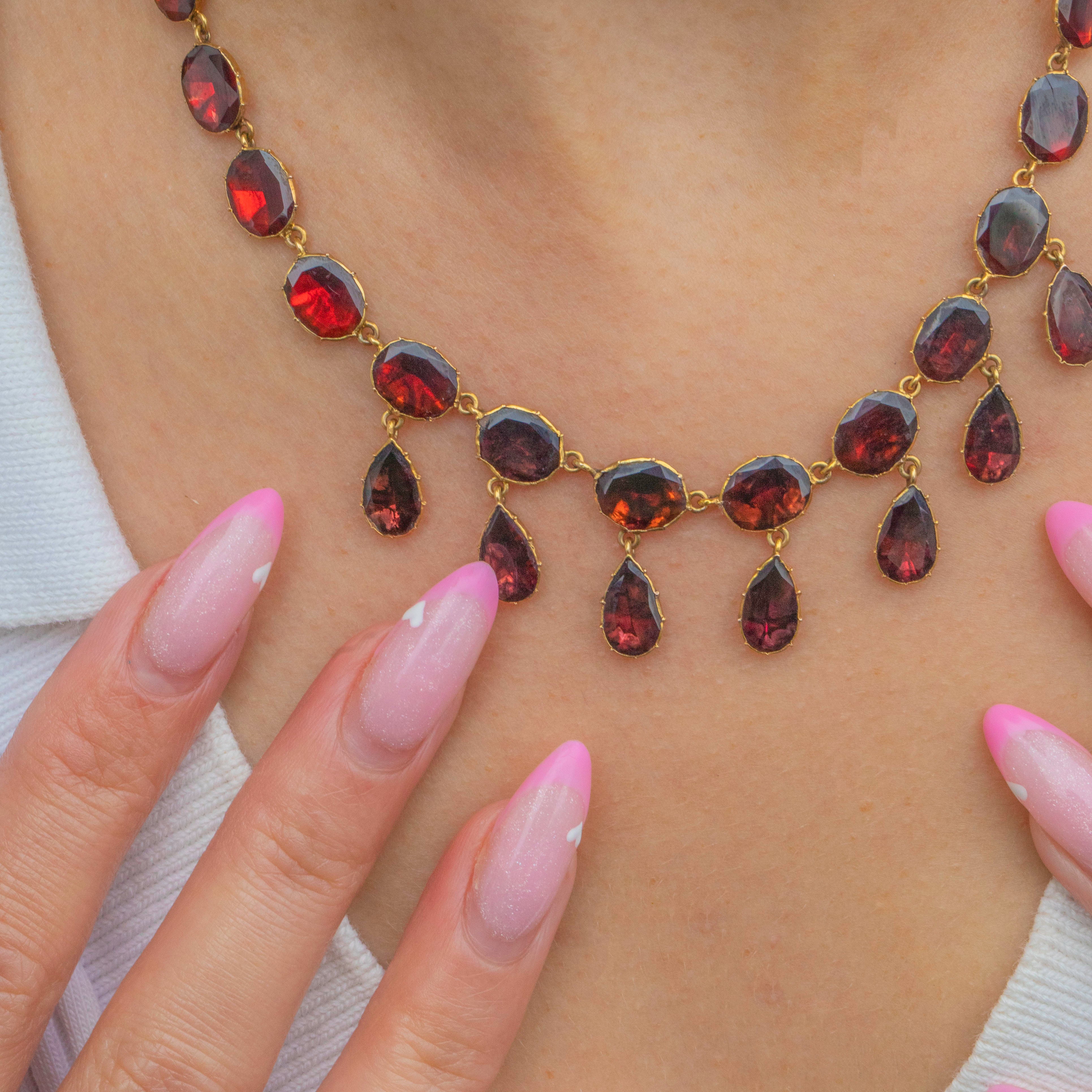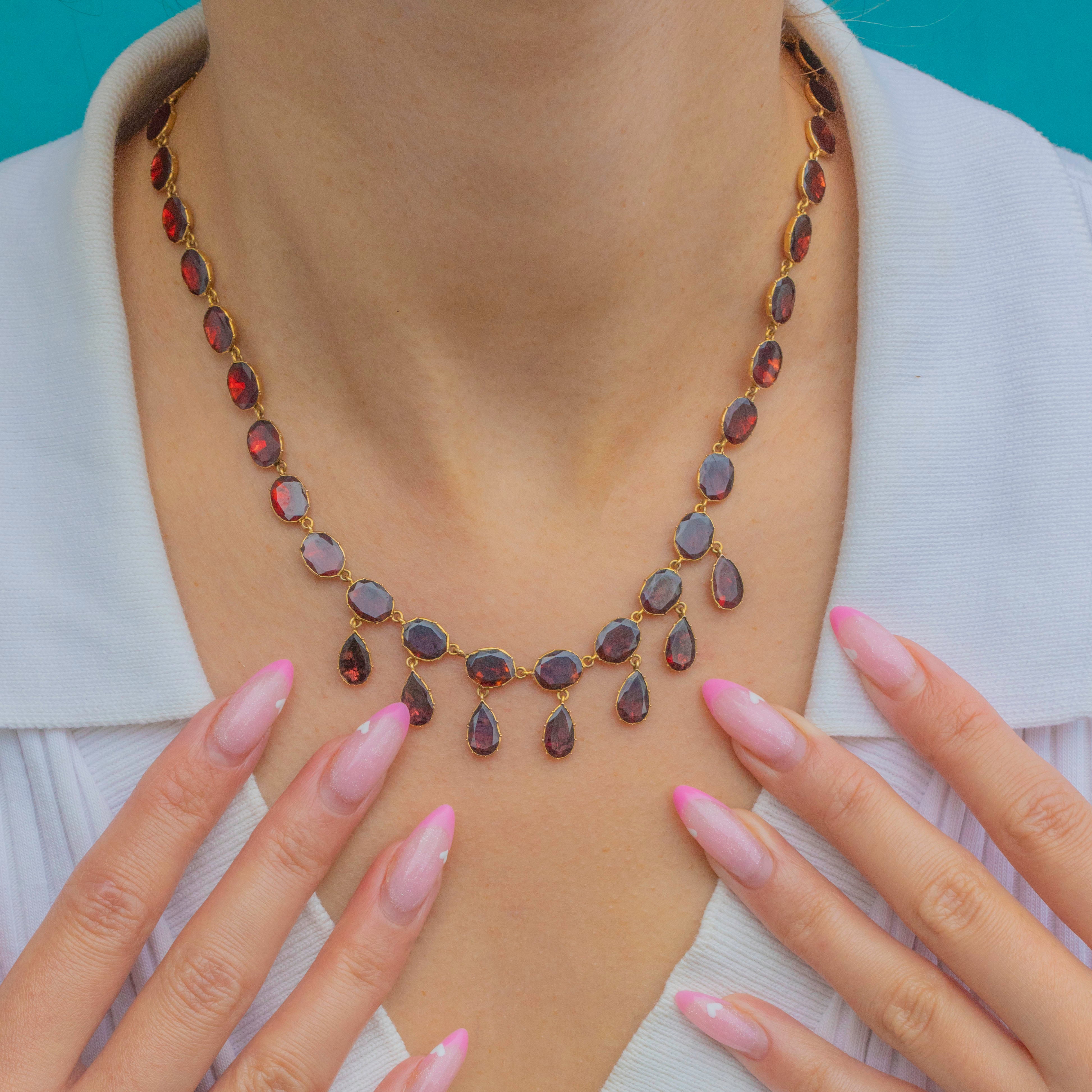 This exquisite Edwardian necklace features a continuous row of deep red flat-cut Garnets with a gorgeous fringe of cascading droplets... Totalling approximately 15.50 carats and set in rich 9ct Gold, each stone glows with warm crimson tones, arranged in an elegant tapering design that sits beautifully along the neckline.