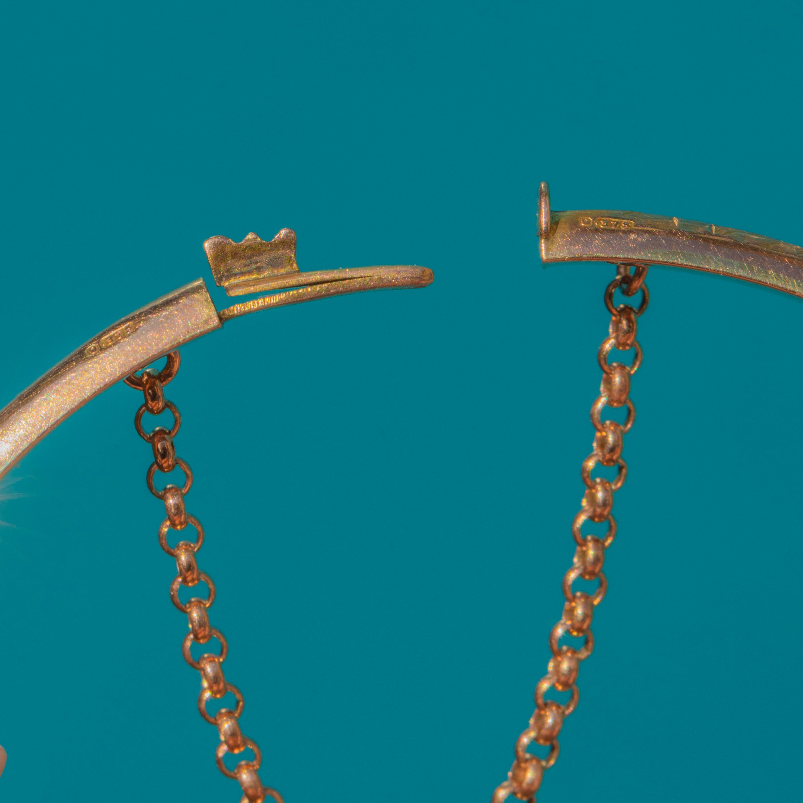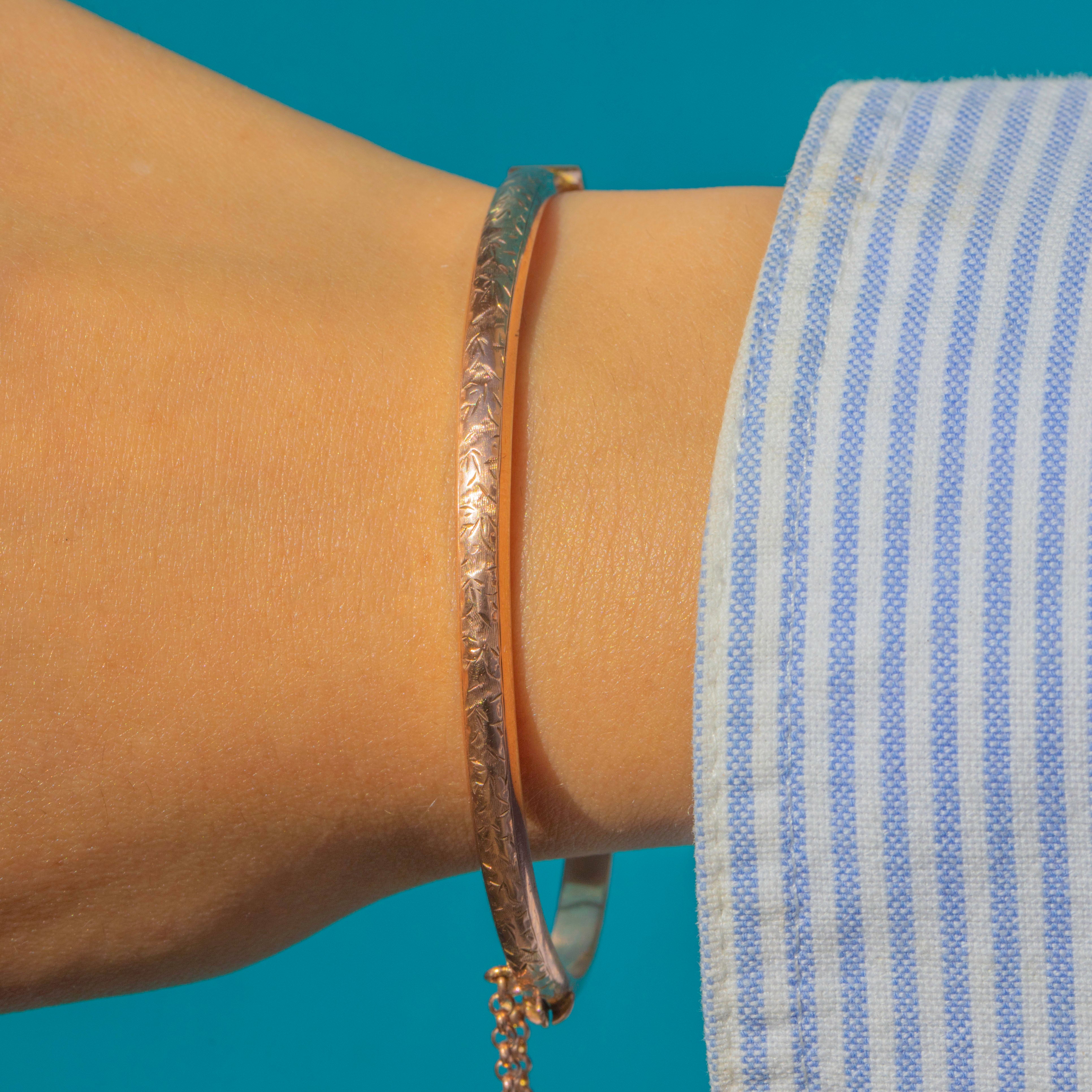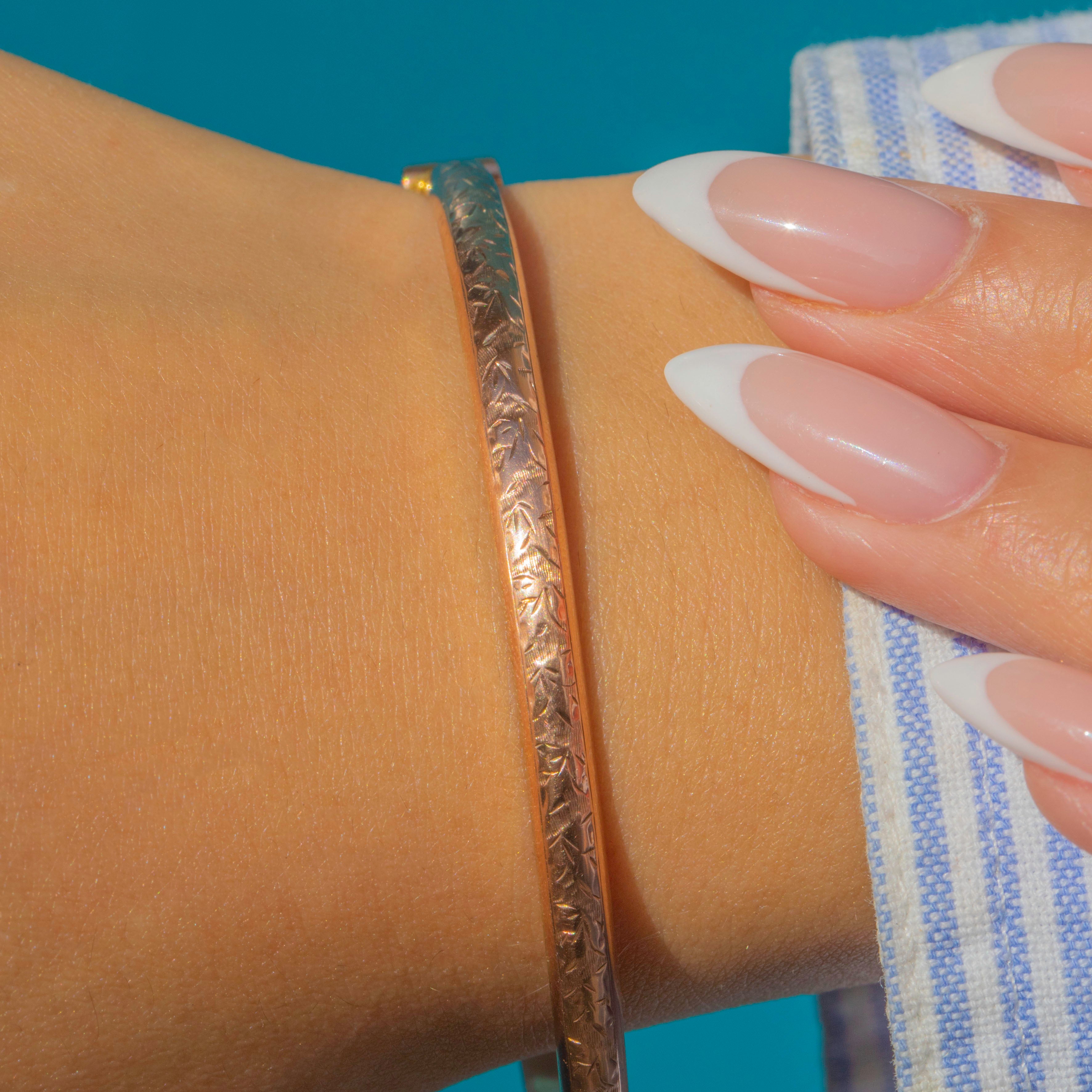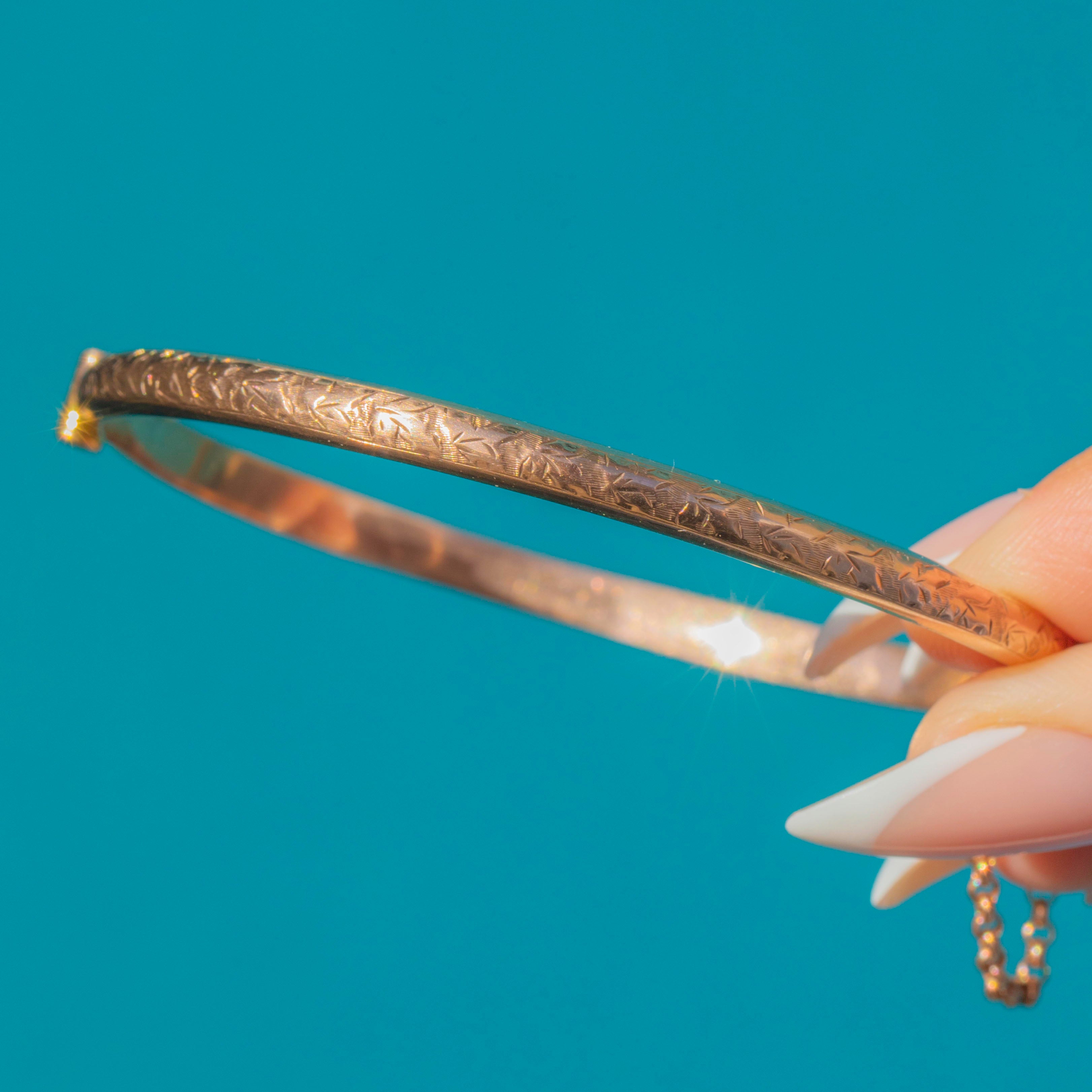 A refined Edwardian bangle in 9ct Gold, engraved all around with a crisp foliate (leaf) pattern. The slim 4mm profile stacks beautifully yet has enough presence to wear solo, and the hinge-and-clasp work cleanly for effortless, everyday use. Leaf motifs were popular in the era—traditionally a symbol of growth and renewal.