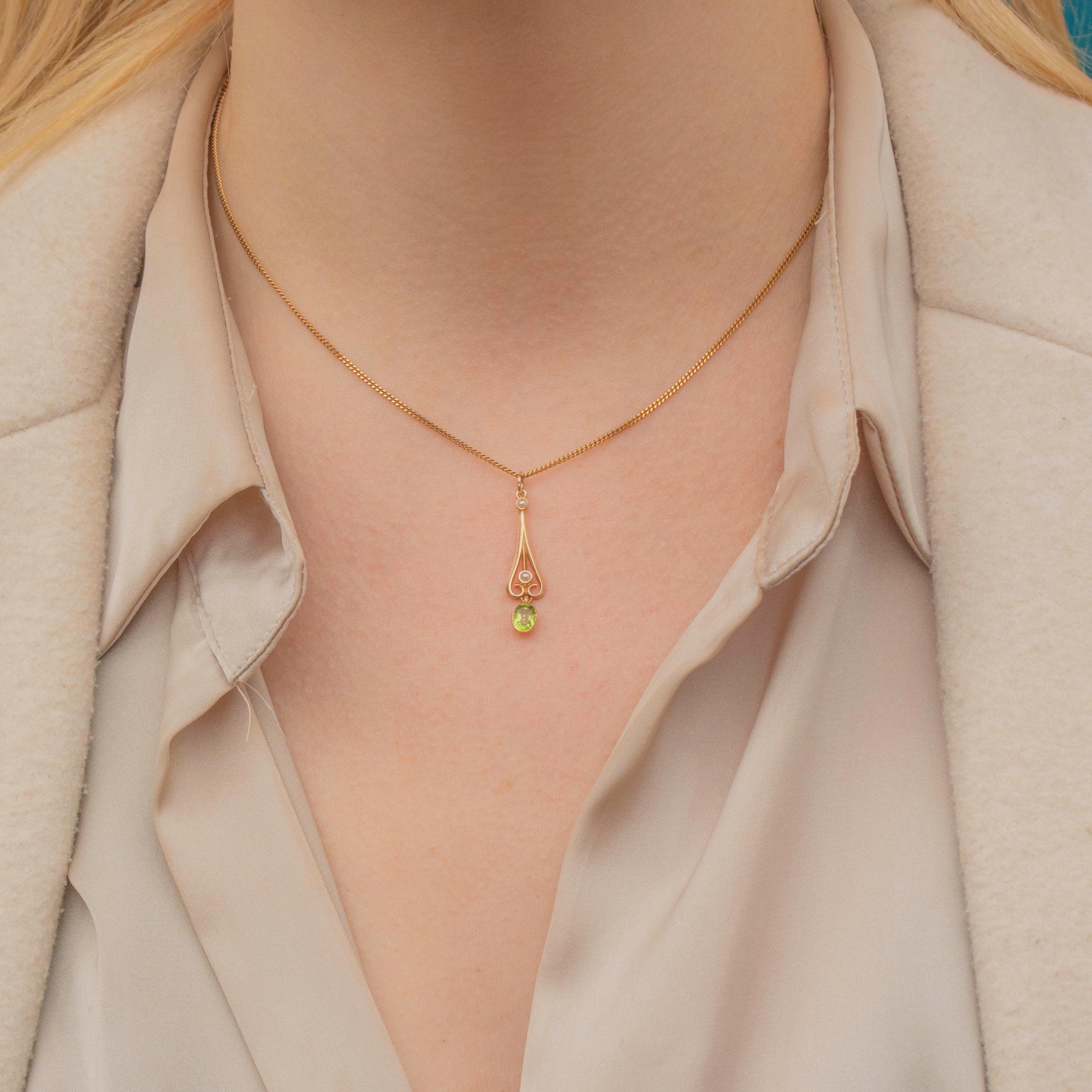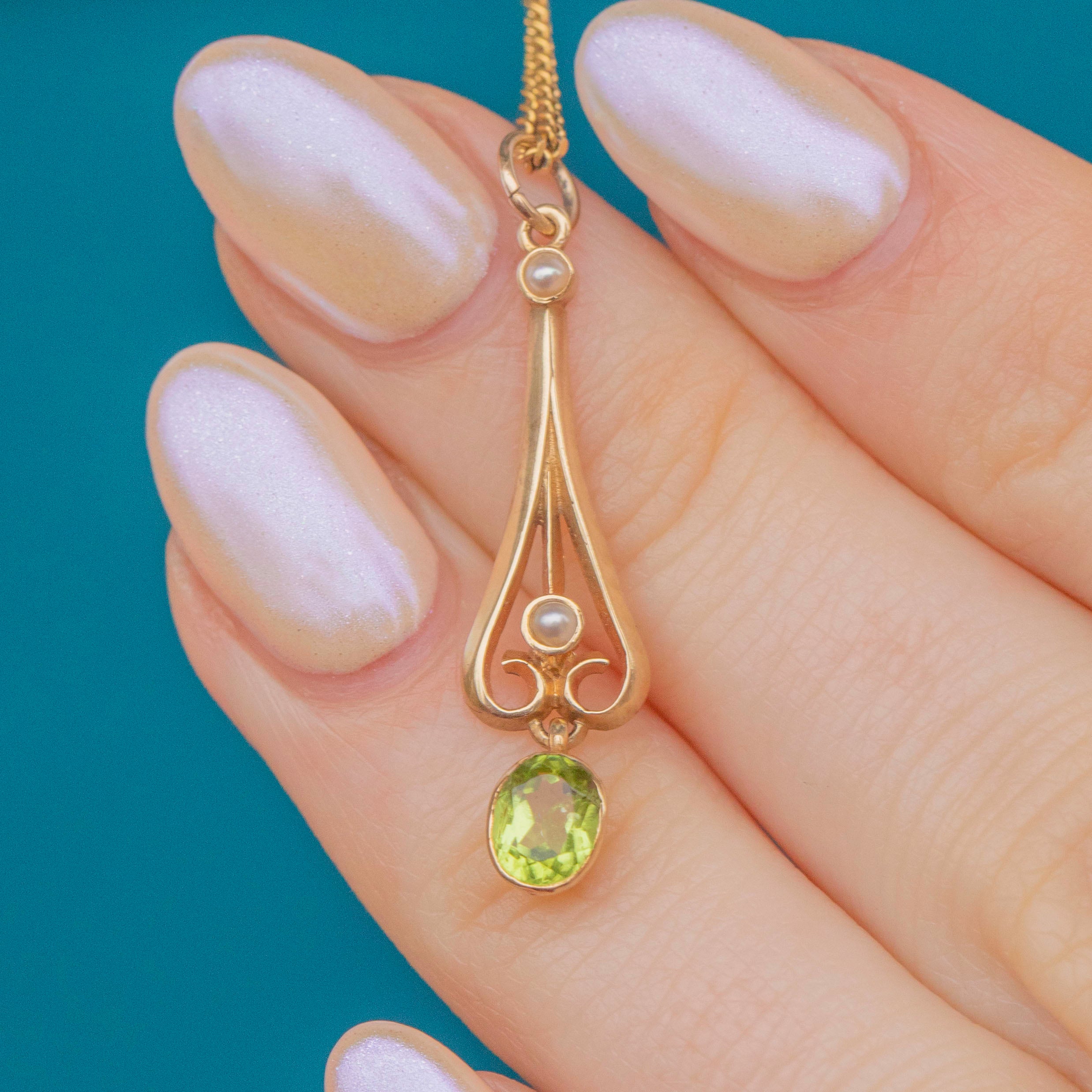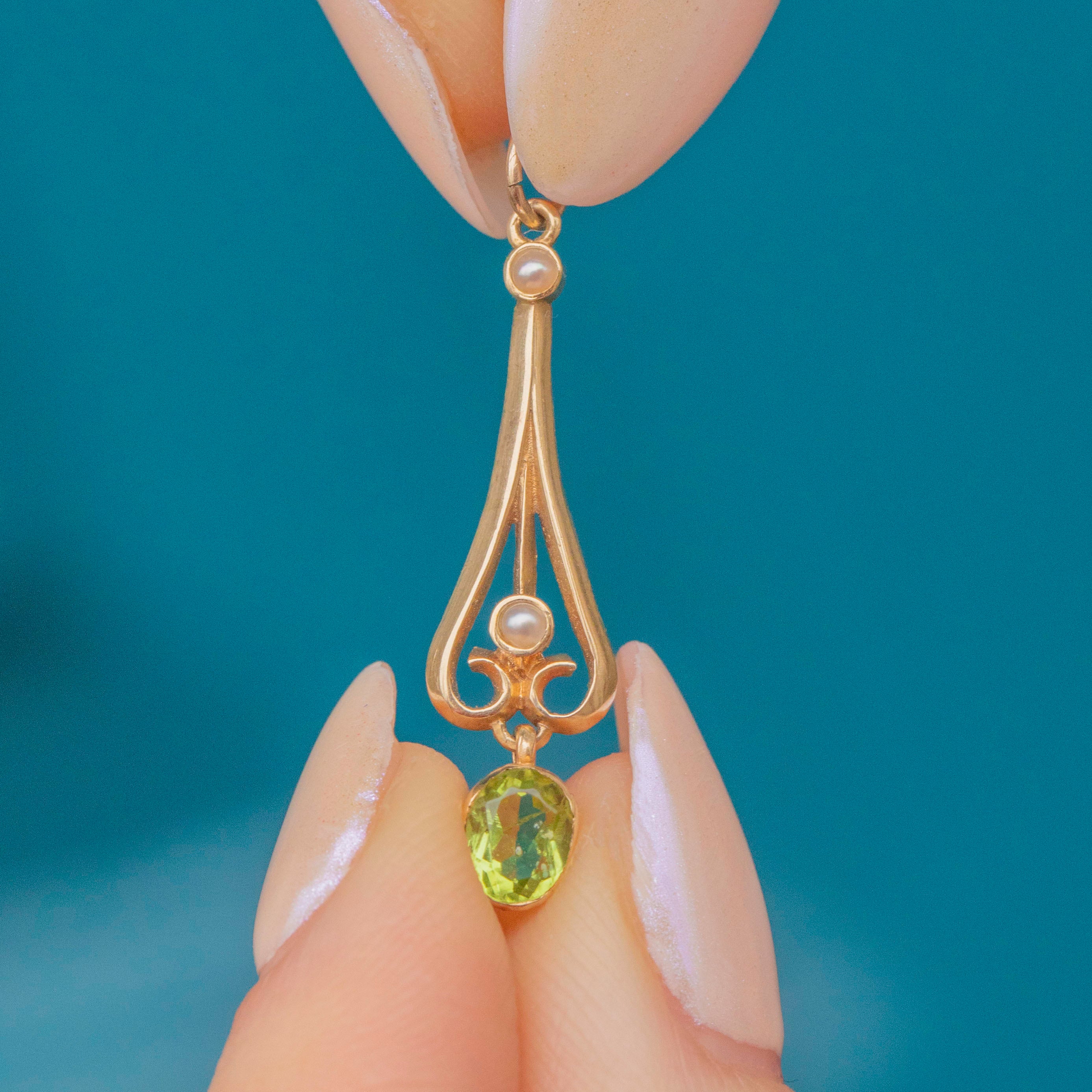 EXCELLENT. This Edwardian 9ct Gold Peridot and Pearl pendant is in excellent condition, with no visible signs of wear or damage. The gemstones are securely set, and the Gold retains her original lustre, making her a stunning piece ready to wear or gift.