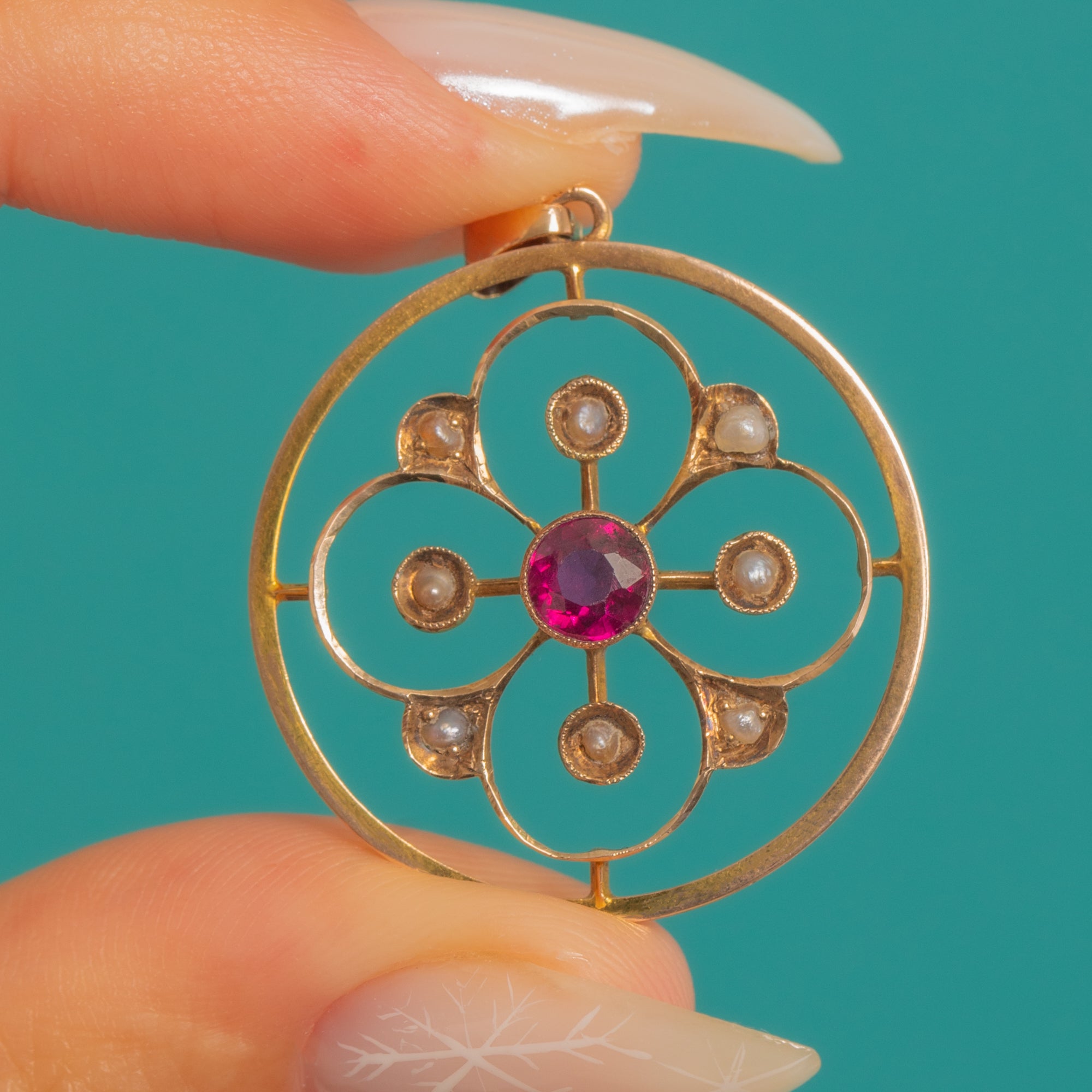 A luminous Edwardian circle charm in 9ct Gold, its airy openwork rosette centred by a vivid Pink Garnet and accented with pretty Seed Pearls. The floral motif sits within a smooth hoop, creating a delicate piece with effortless Edwardian poise.