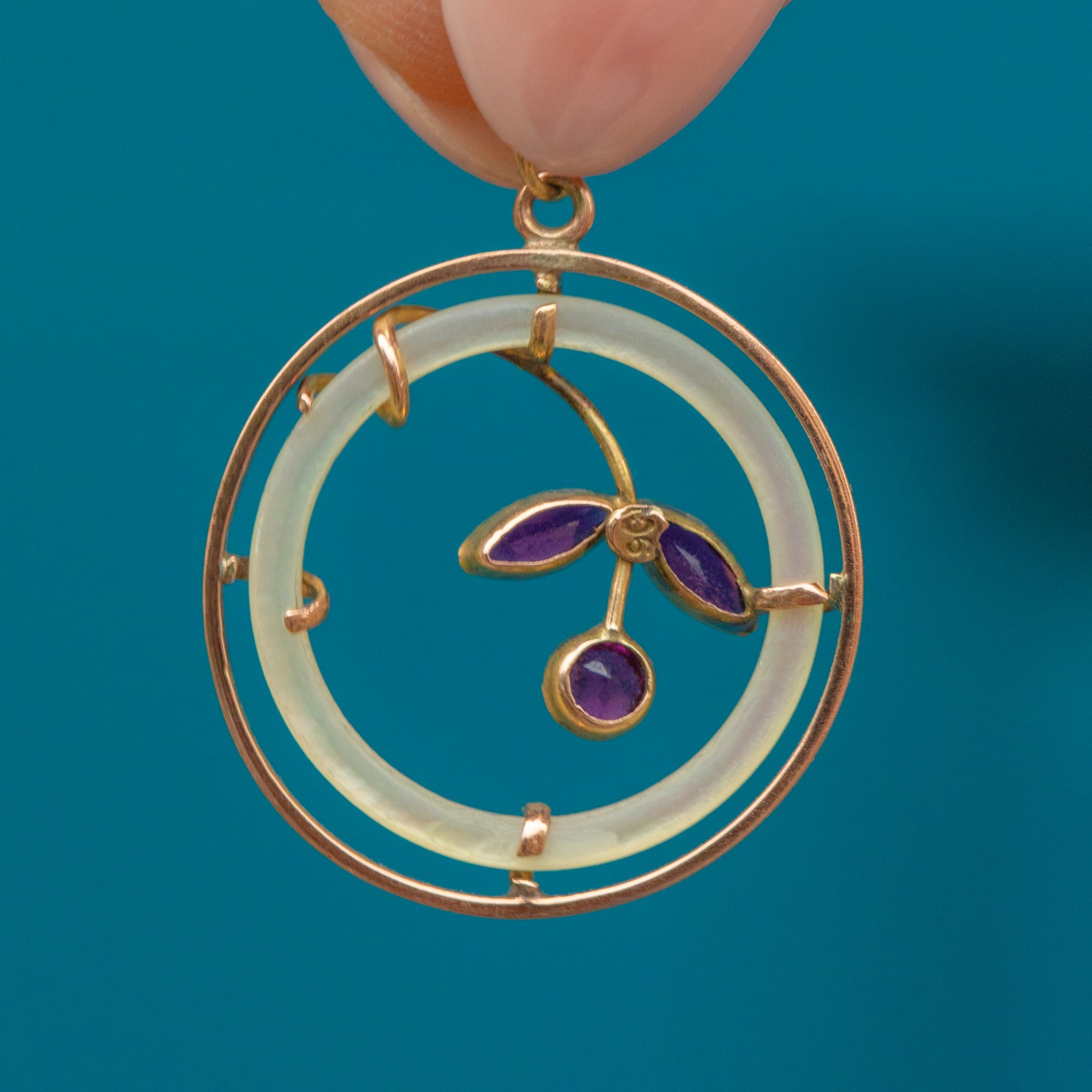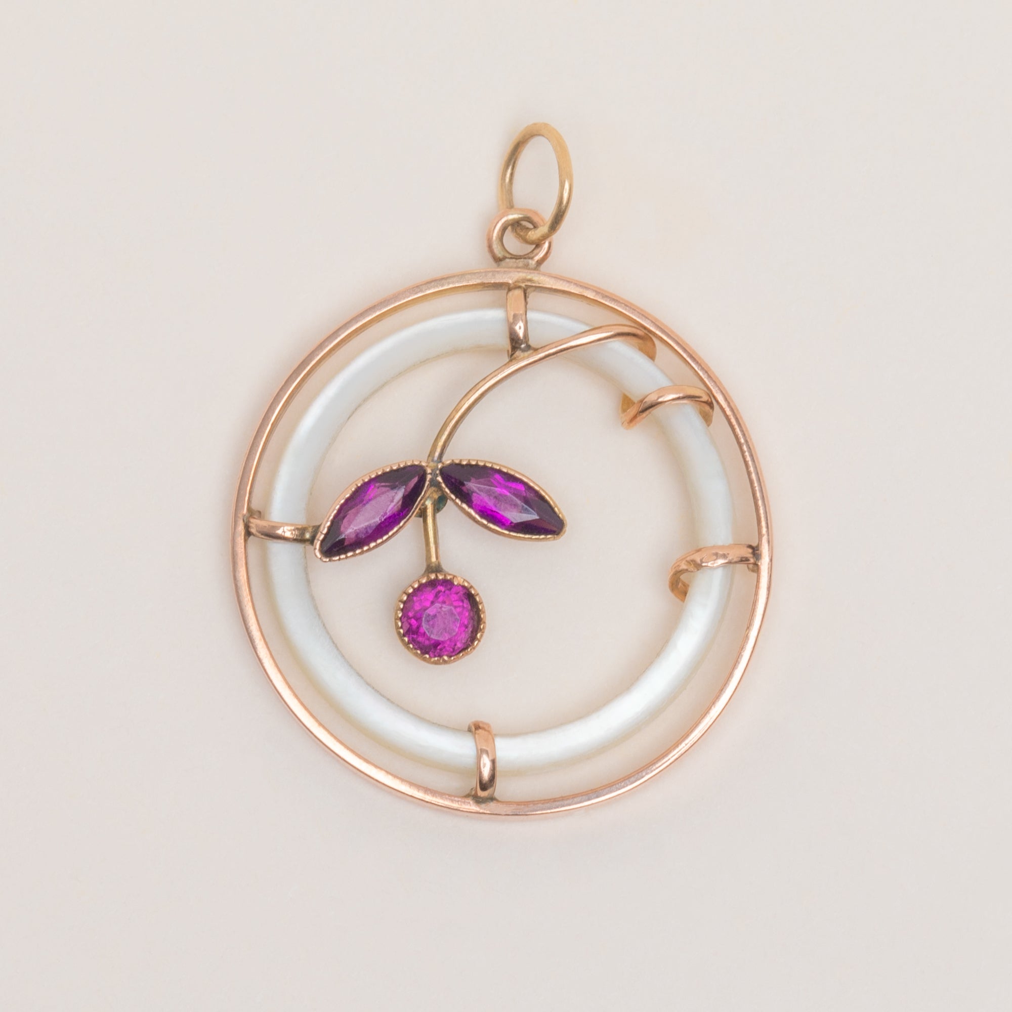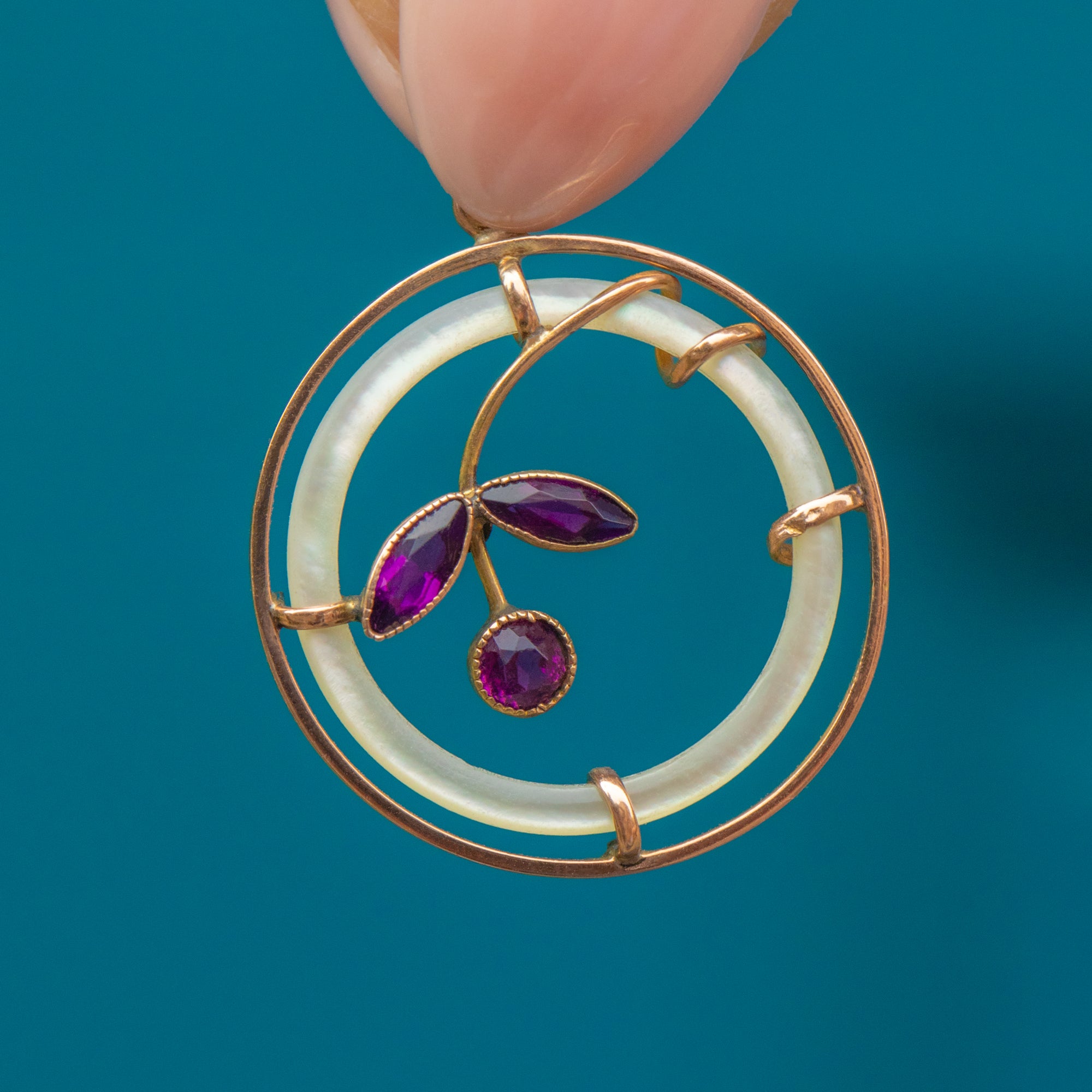 MATERIALS: Tests as 9ct Gold, Mother of Pearl, Amethyst Paste.