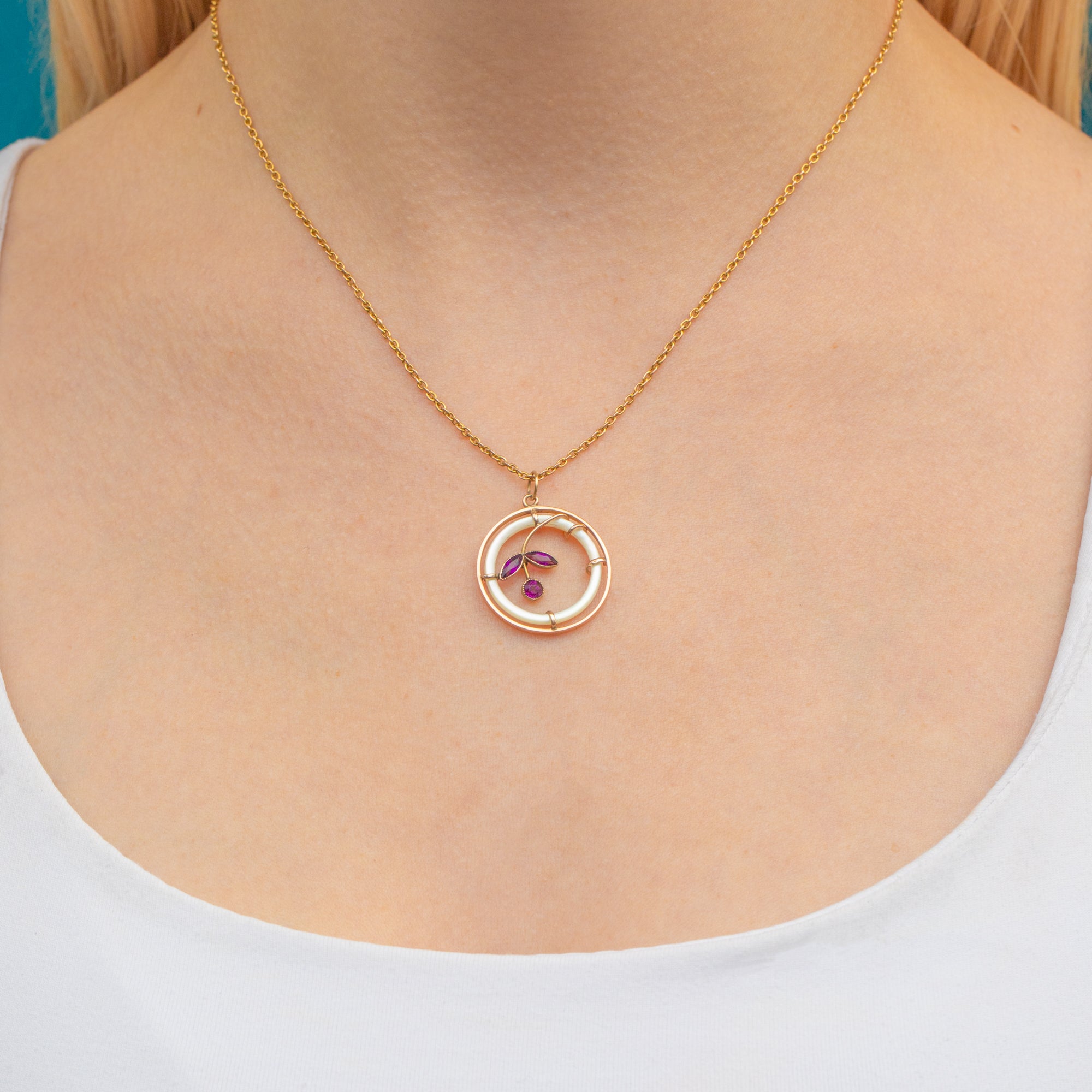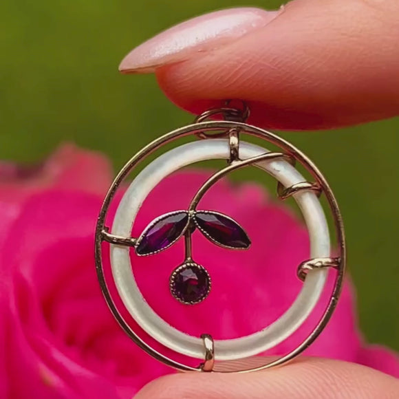 This Edwardian 9ct Gold Mother of Pearl flower pendant features a central circle of iridescent mother of Pearl, framing a delicate, regal purple Paste flower set in a rich 9ct Gold. The intricate golden flower motif arches inside the mother of Pearl like a graceful vine, creating a harmonious blend of elegance and artistry.
