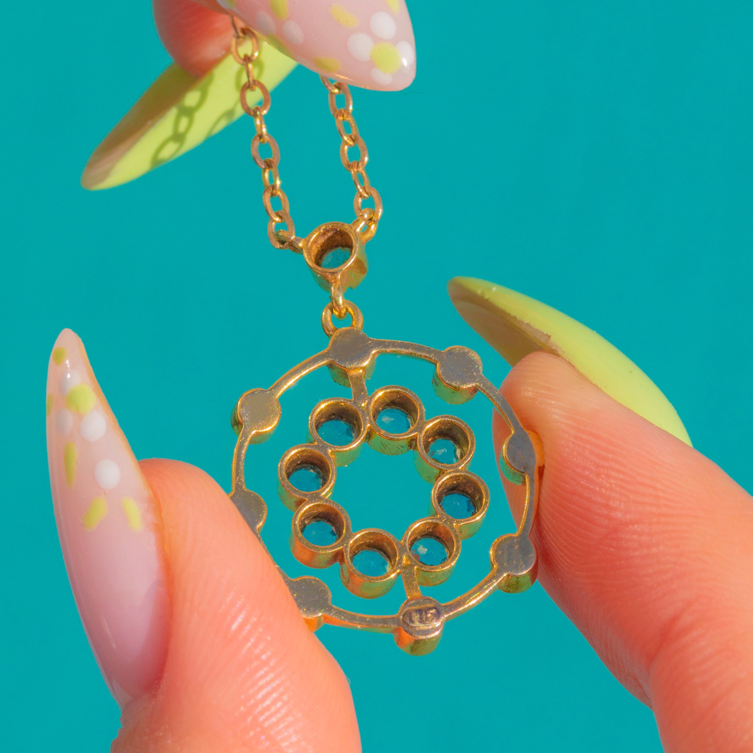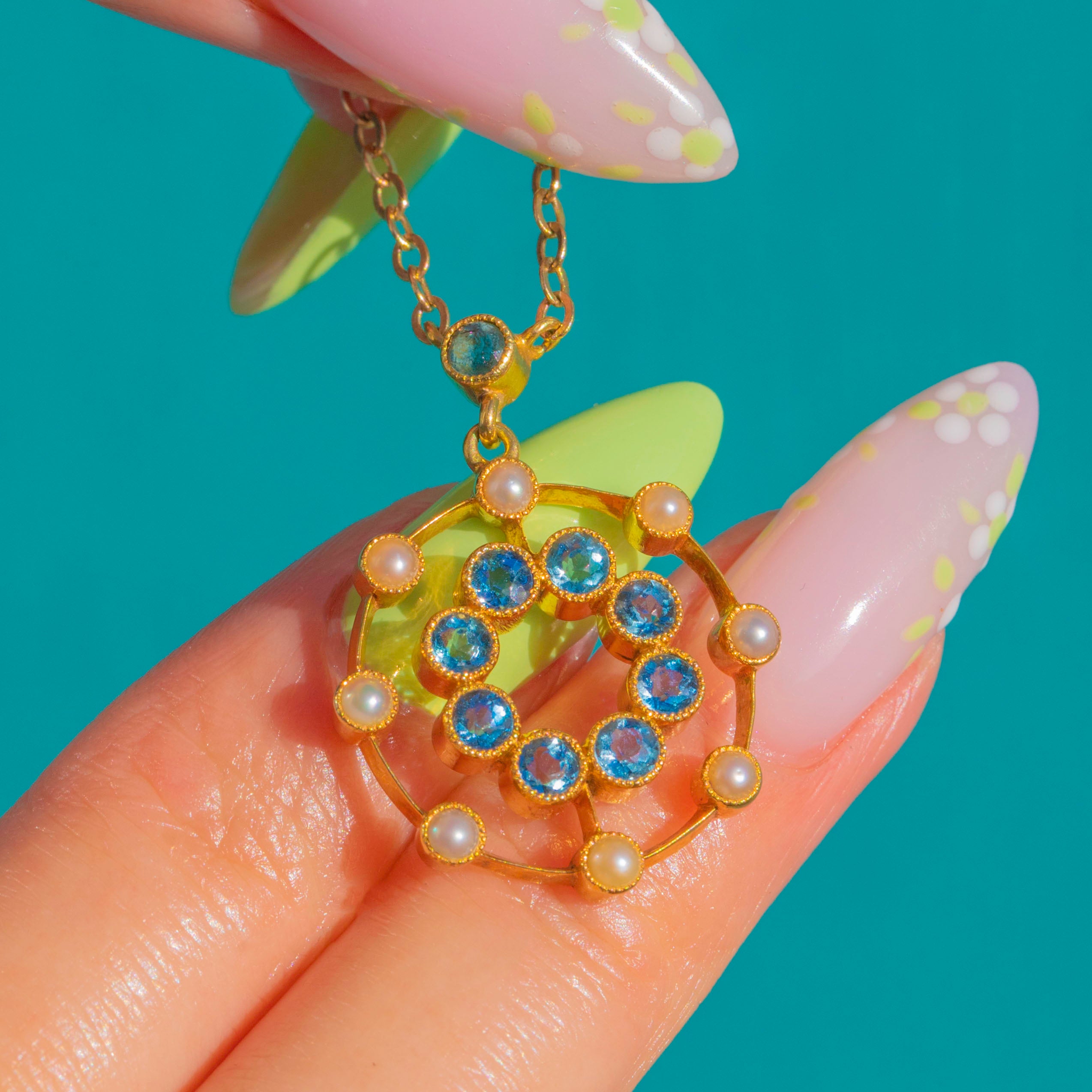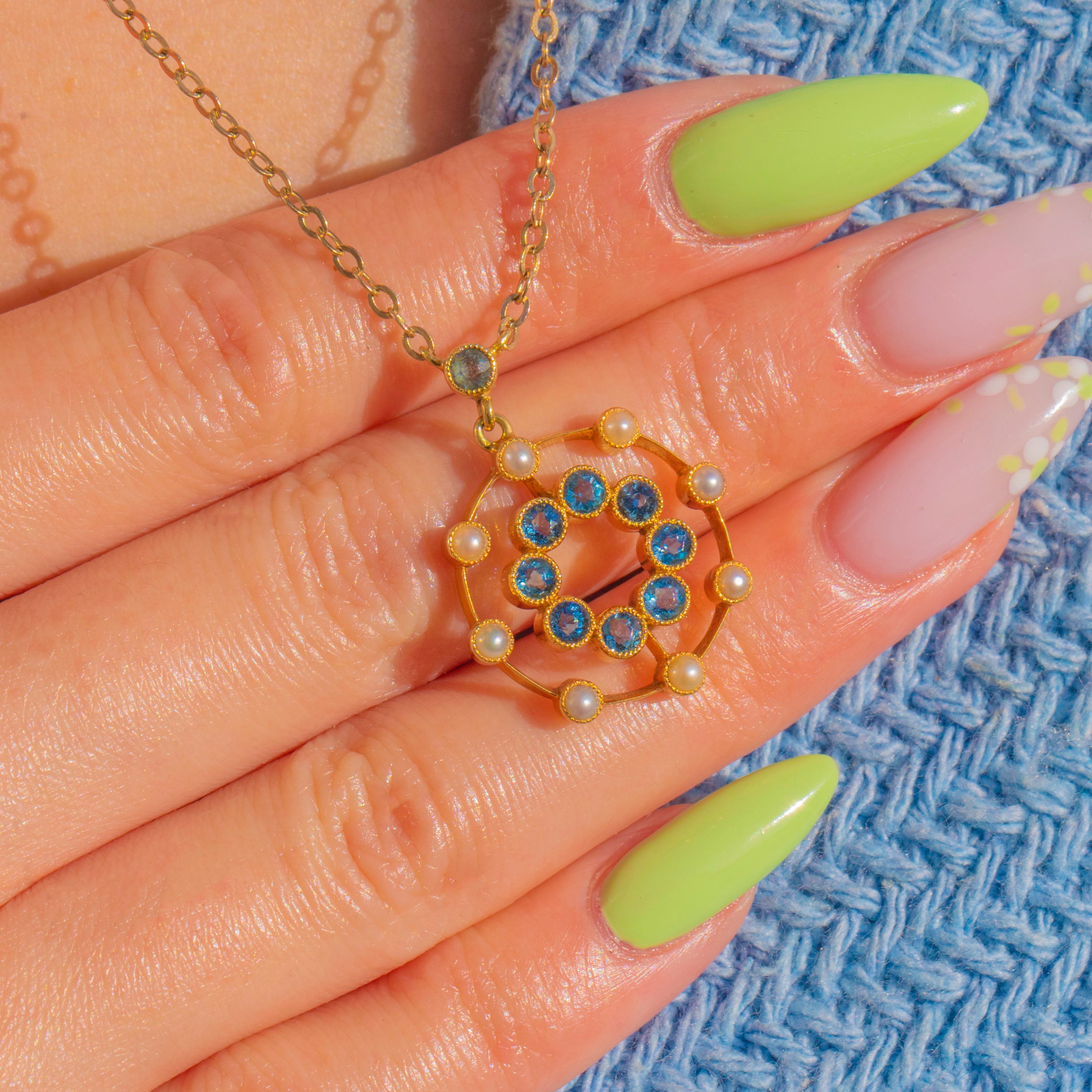 Ein romantisches Edwardian-Rosettenmedaillon, gefertigt aus sattem 15ct Gold: Dieses Anhängerstück erblüht mit himmelblauen Aquamarinen, umrahmt von einem Halo aus cremefarbenen Saatperlen. Das offene, konzentrische Design wirkt luftig und elegant, während milgrainverzierte Zargenfassungen jenes feine, spitzenartige Finish verleihen, das wir an dieser Epoche so schätzen.