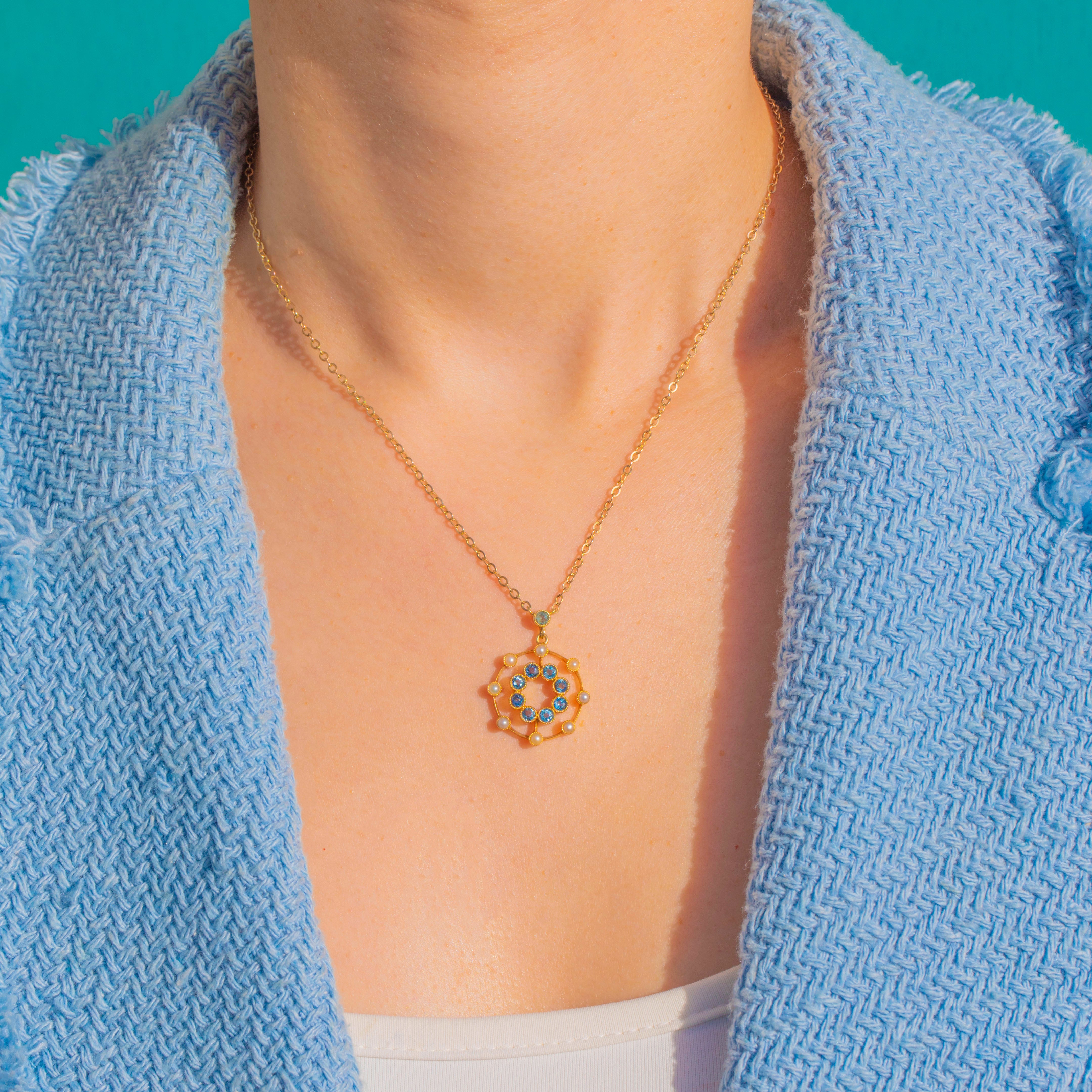 Die Aquamarine haben zusammen ein Gesamtgewicht von ca. 1,25ct; ihr lebhaftes Funkeln wird wunderschön durch das sanfte Schimmern der Perlen akzentuiert. Ein einzelner Aquamarin verbindet den Anhänger mit der feinen Goldkette und schafft einen anmutigen Fall, der perfekt am Dekolleté sitzt – zeitlos, feminin und mühelos tragbar.