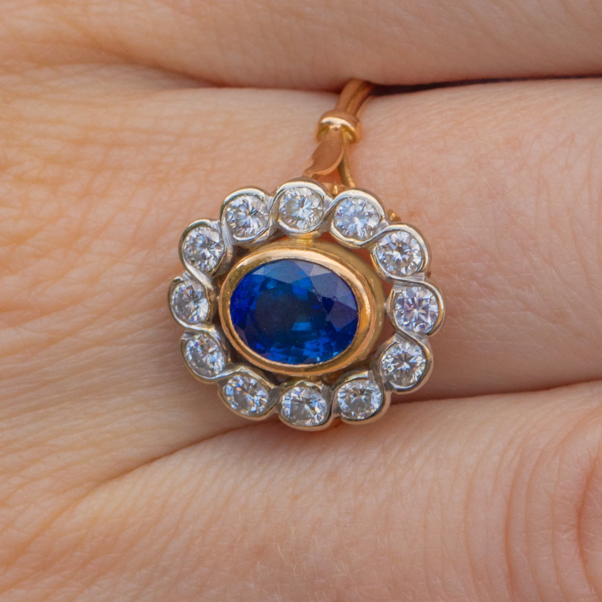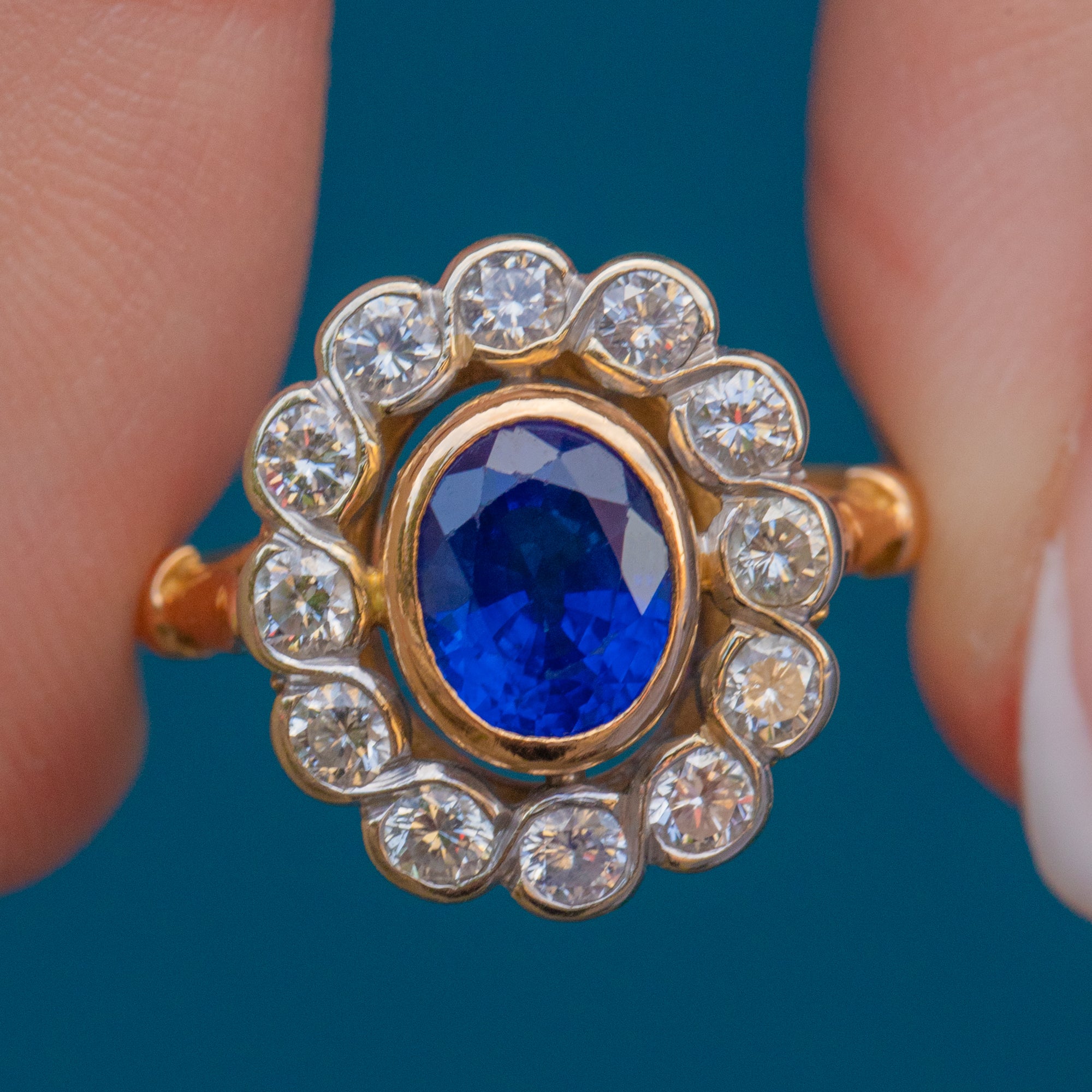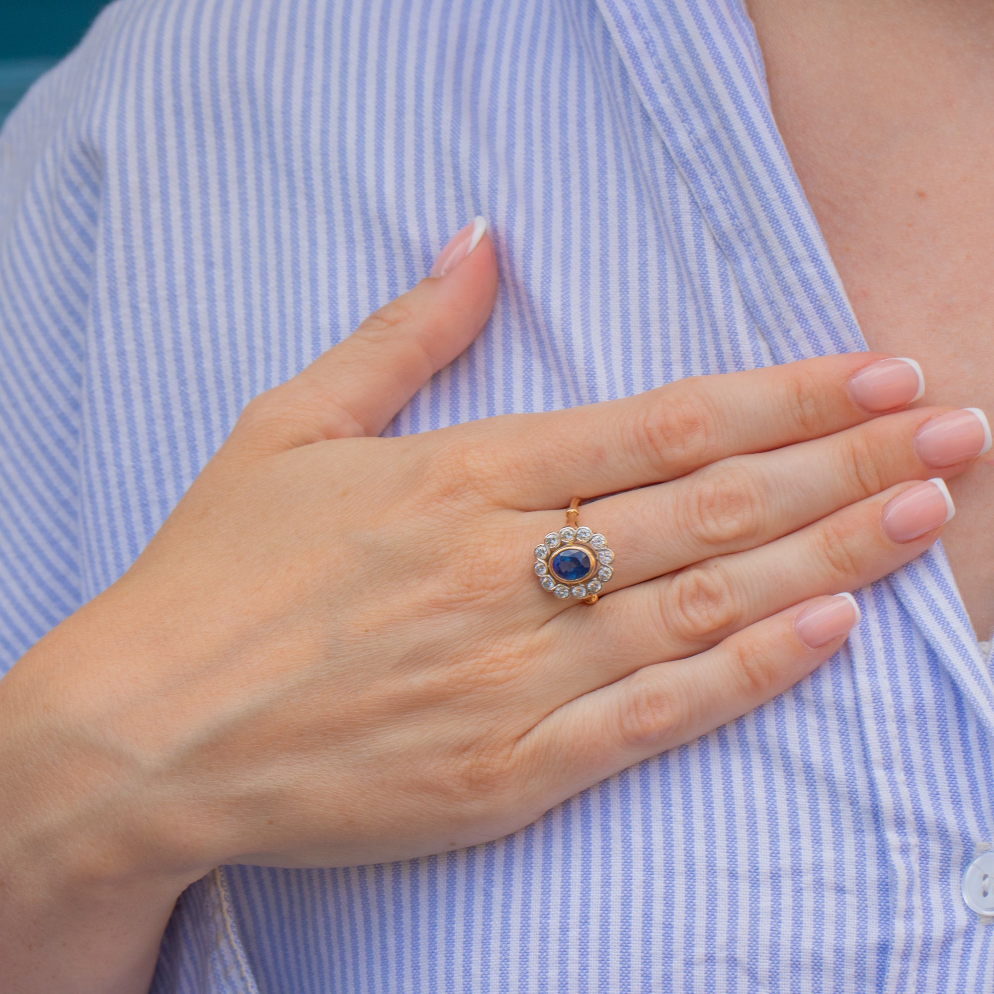 Edwardian French 18ct Gold Sapphire Diamond Oval Cluster Ring, 0.75ct Sapphire