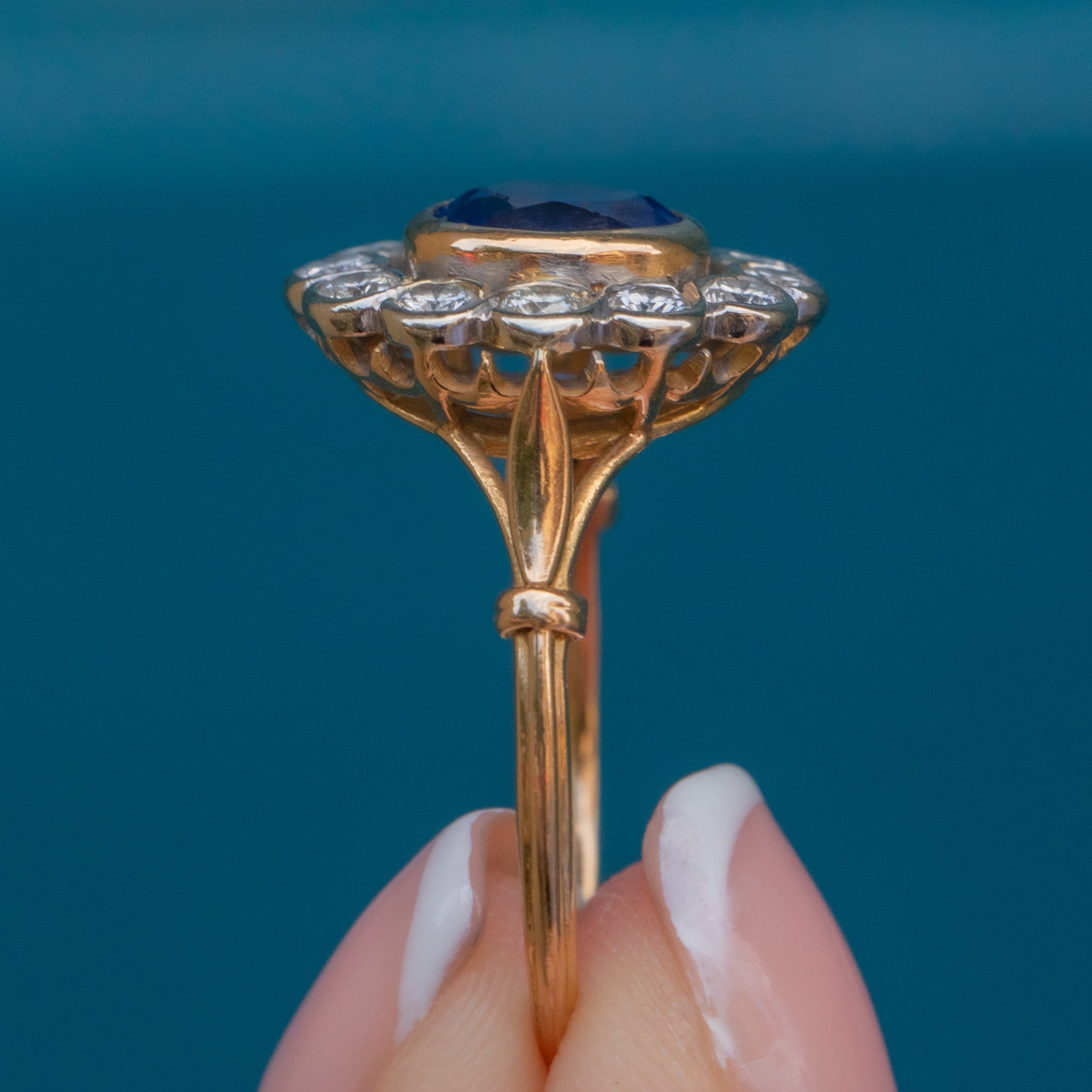 EXCELLENT. This exquisite Edwardian French 18ct Gold Sapphire Diamond oval cluster ring is offered in excellent condition. The gemstones are all securely set and retain a vivid hue and stunning sparkle, free from any damage to note! The buttery 18ct Gold band is glossy and bright, free from notable dings or dents, with no signs of any previous resizing. A sumptuous Edwardian jewel you won't want to miss out on!