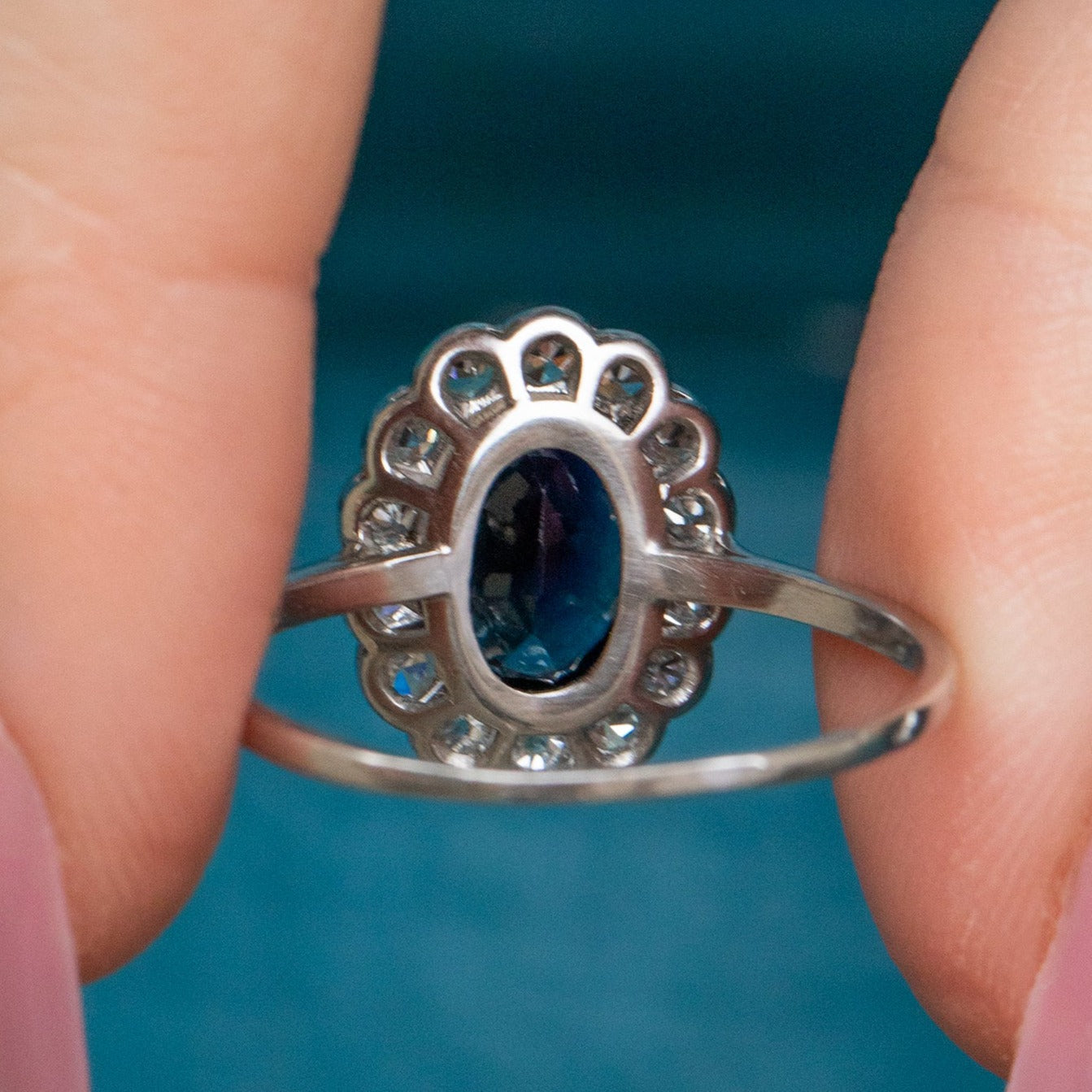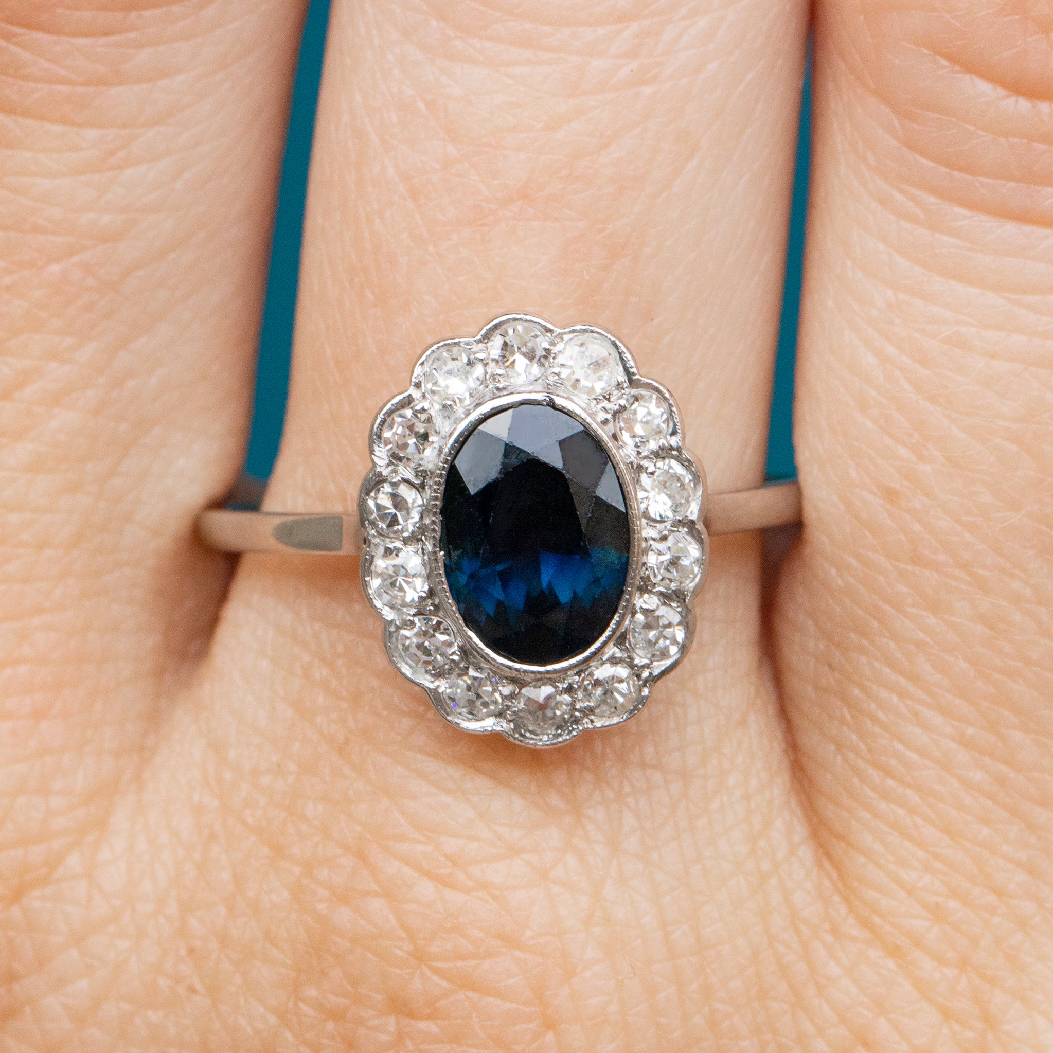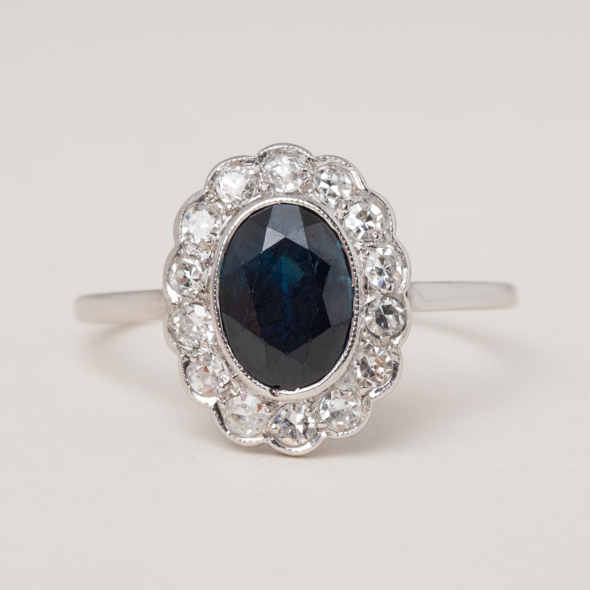 Be ready to dazzle with this Edwardian French 18ct Gold Sapphire Diamond oval cluster ring! This antique white Gold ring possesses an awe-inspiring 1.10ct natural Sapphire surrounded by a halo of twinkling Diamonds, emulating the sky on the clearest of nights.