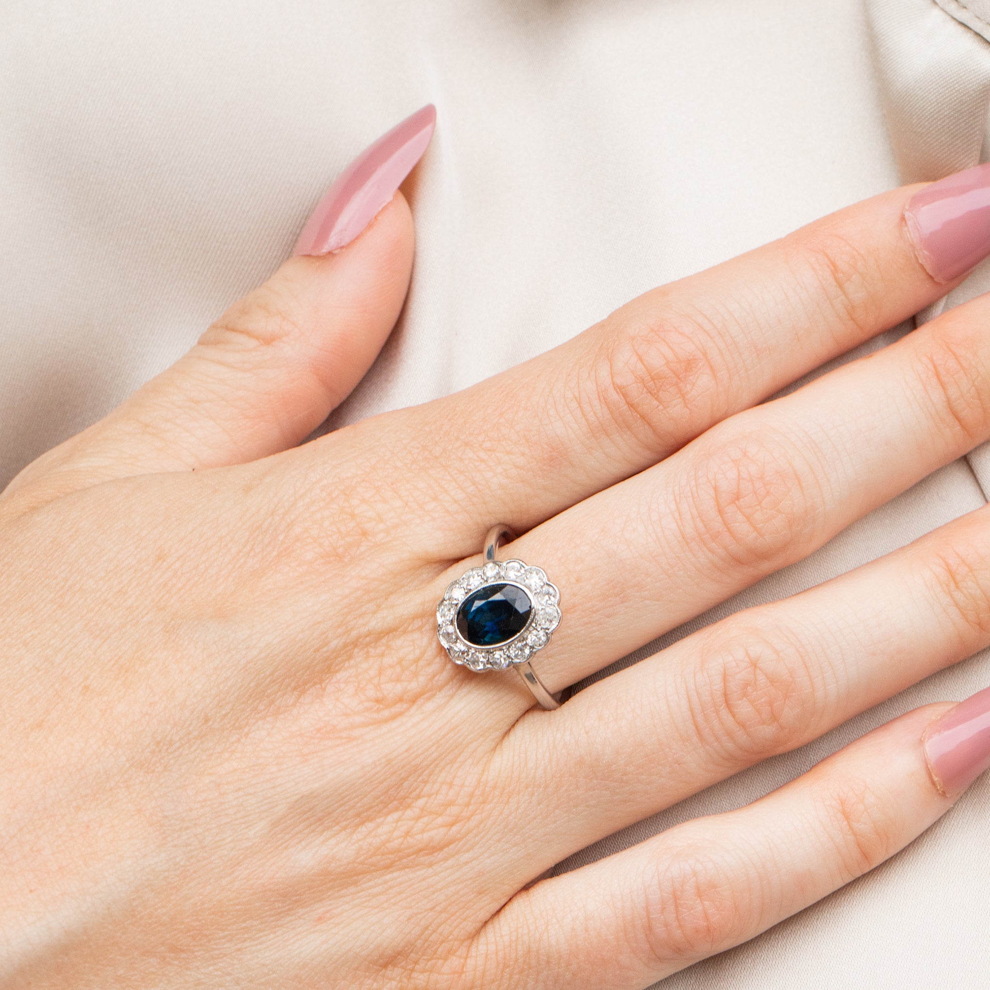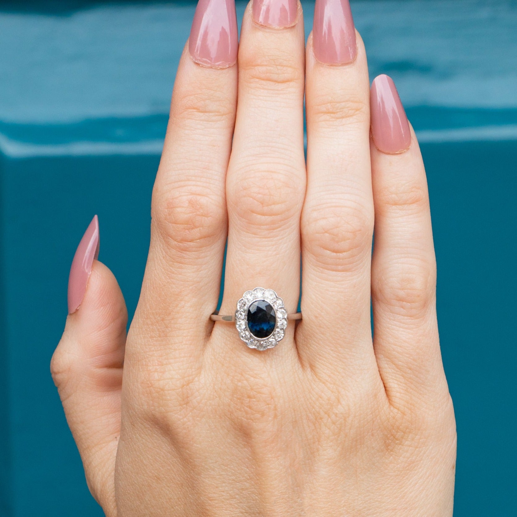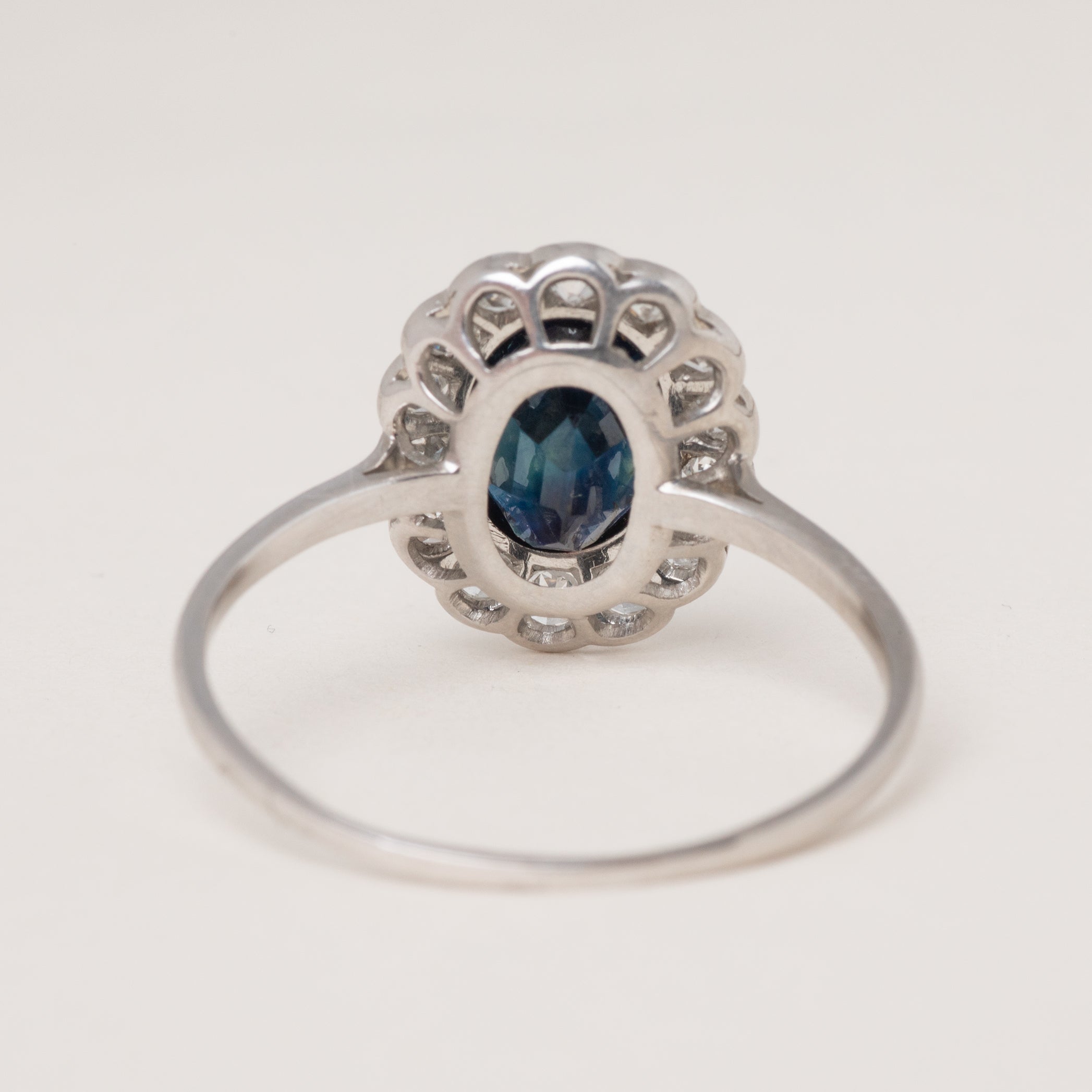 Be ready to dazzle with this Edwardian French 18ct Gold Sapphire Diamond oval cluster ring! This antique white Gold ring possesses an awe-inspiring 1.10ct natural Sapphire surrounded by a halo of twinkling Diamonds, emulating the sky on the clearest of nights.