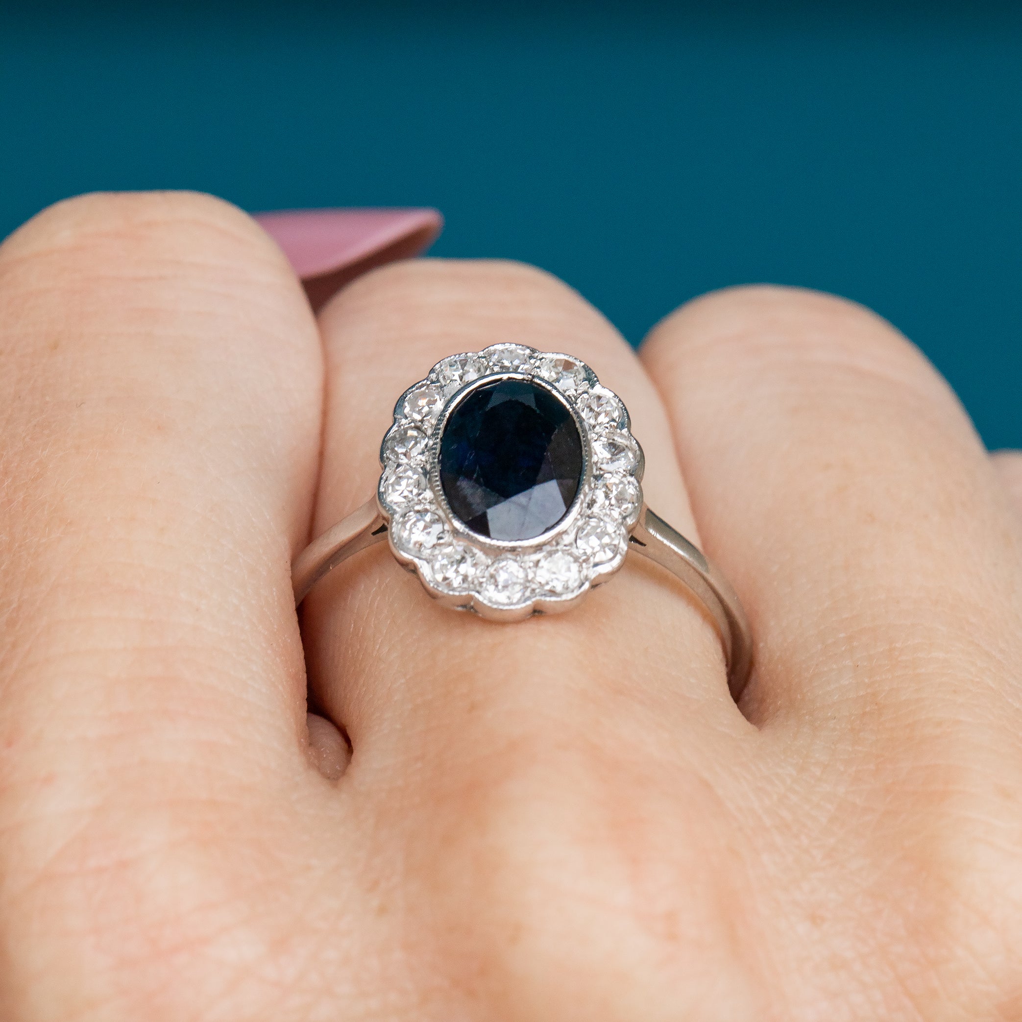 EXCELLENT. We are delighted to report that this Edwardian French 18ct Gold Sapphire Diamond oval cluster ring is in excellent condition. The sparkling Diamonds are beautifully bright and well-matched, and the 1.10ct natural Sapphire has a gorgeous deep midnight blue hue, with straight striations within the gem under strong light and magnification indicating this is a natural gemstone with no treatments or enhancements. The gemstones are securely set and completely free from chips or abrasions. She has antique French stamps on the outside of the band- confidently showing her French provenance. The 18ct white Gold band is lustrous and has retained great form allowing you to wear her with the utmost confidence.