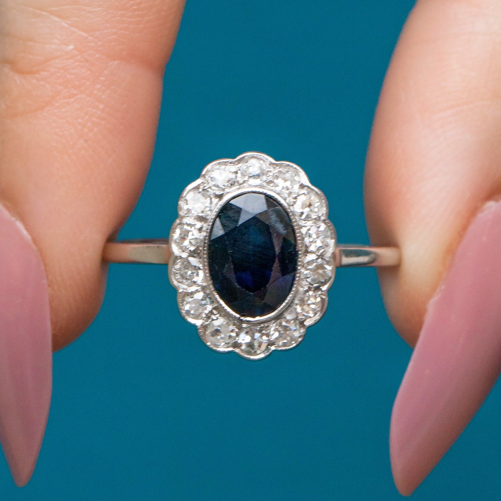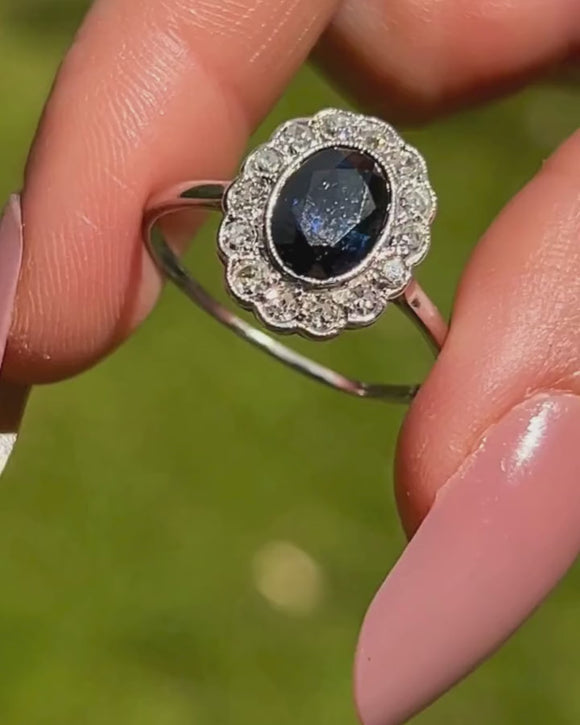 18ct Gold French Sapphire Diamond Cluster Ring- 1.10ct Natural Sapphire