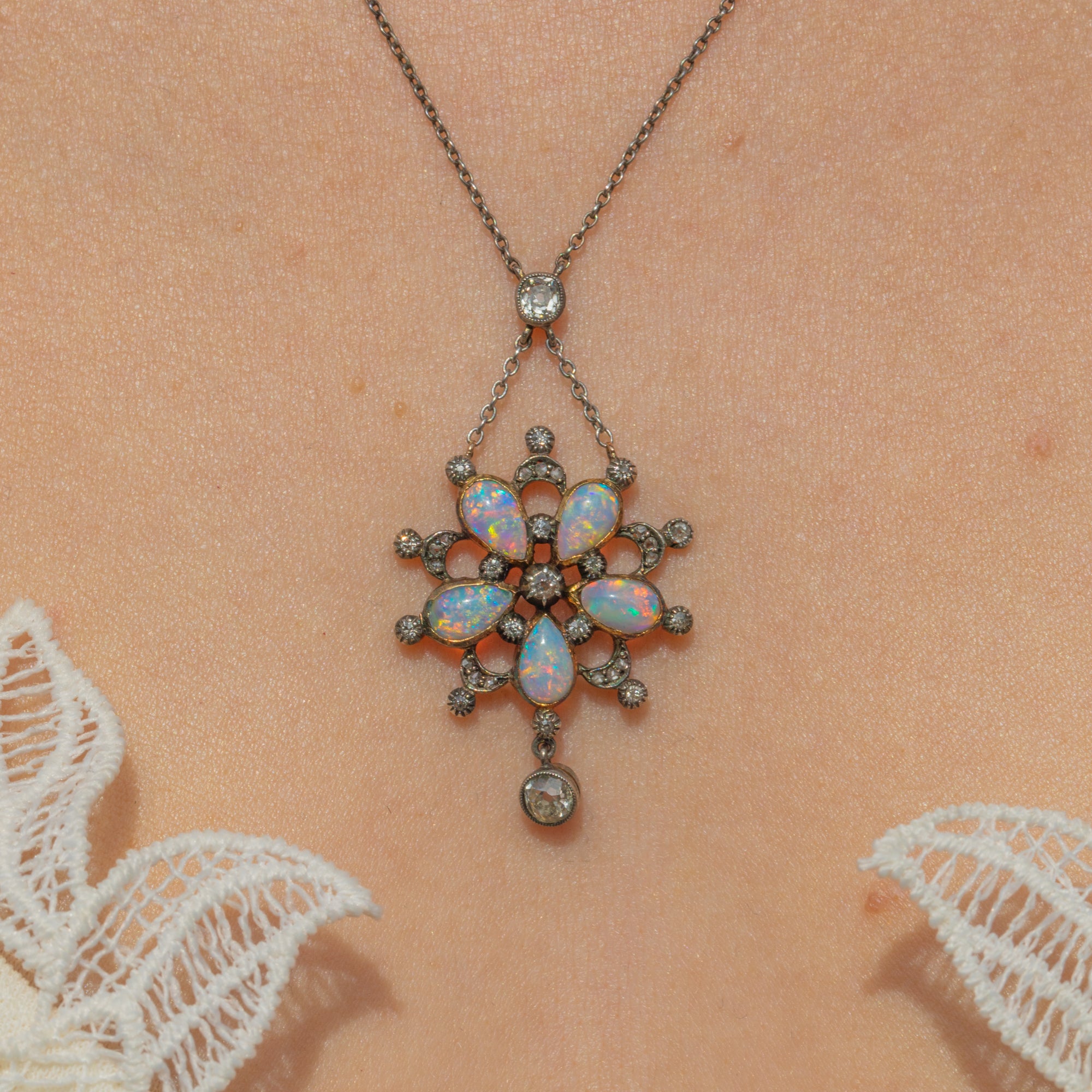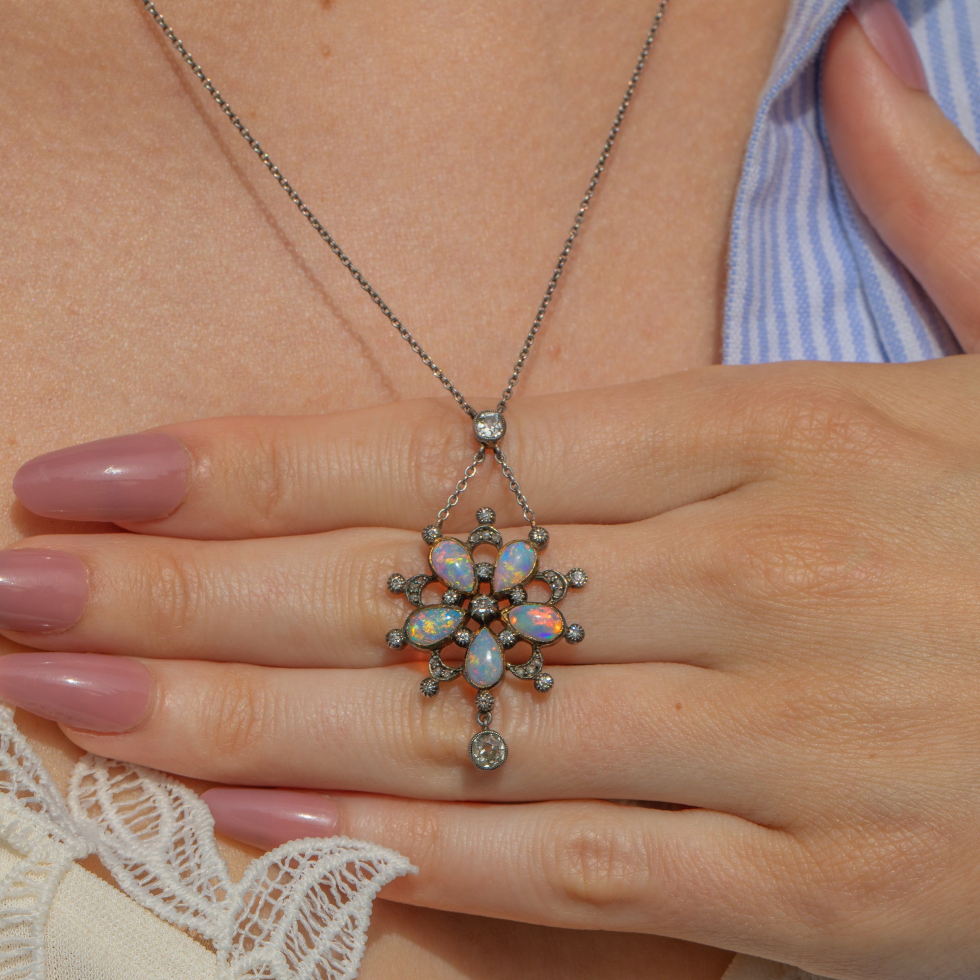 This Edwardian Opal & Diamond flower drop necklace will make an enchanting addition to your collection! Taking a feminine floral form, the pendant drop presents an impressive Opal & Diamond cluster suspended from a dainty Sterling Silver chain.