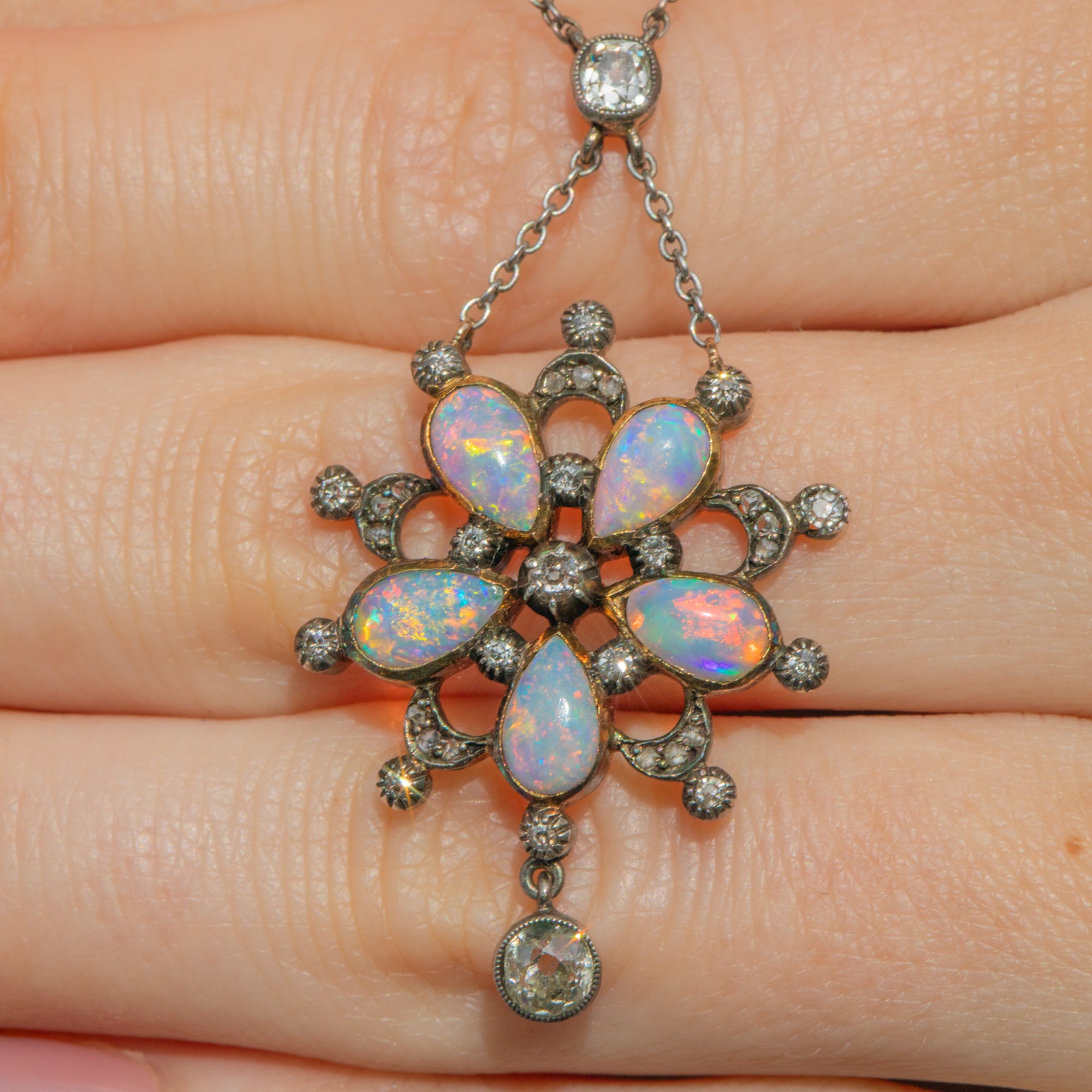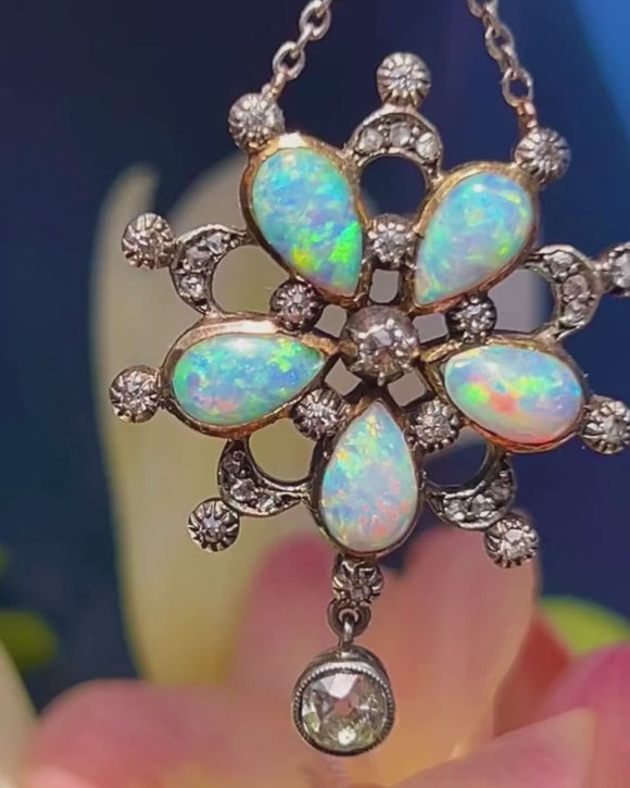 VERY GOOD TO EXCELLENT. This Edwardian Opal & Diamond flower drop necklace is in great condition. The Opal petals are securely set, with only one Opal petal possessing a small chip to the side closer to the centre (about the 9 o'clock mark). The Diamonds are a wonderful addition and sparkle prettily. The Silver chain will allow you to wear this piece beautifully for decades more.
