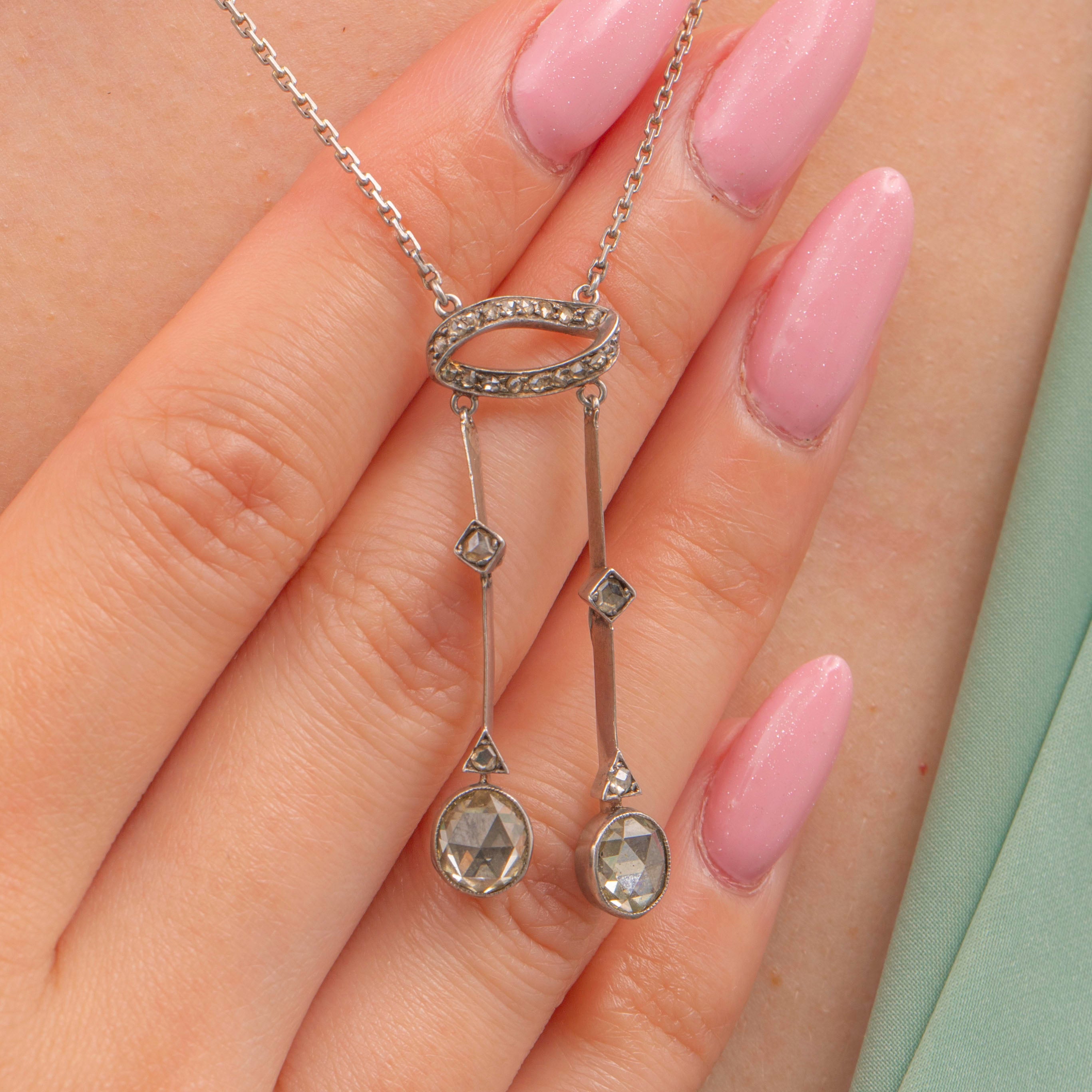 Crafted entirely from lustrous Platinum, this antique necklace suspends a gorgeous drop pendant, adorned with an array of scintillating rose-cut Diamonds, weighing a total of 1.40ct. She is an exemplar of Edwardian elegance, with her elongated negligee design providing a lovely, sophisticated look.