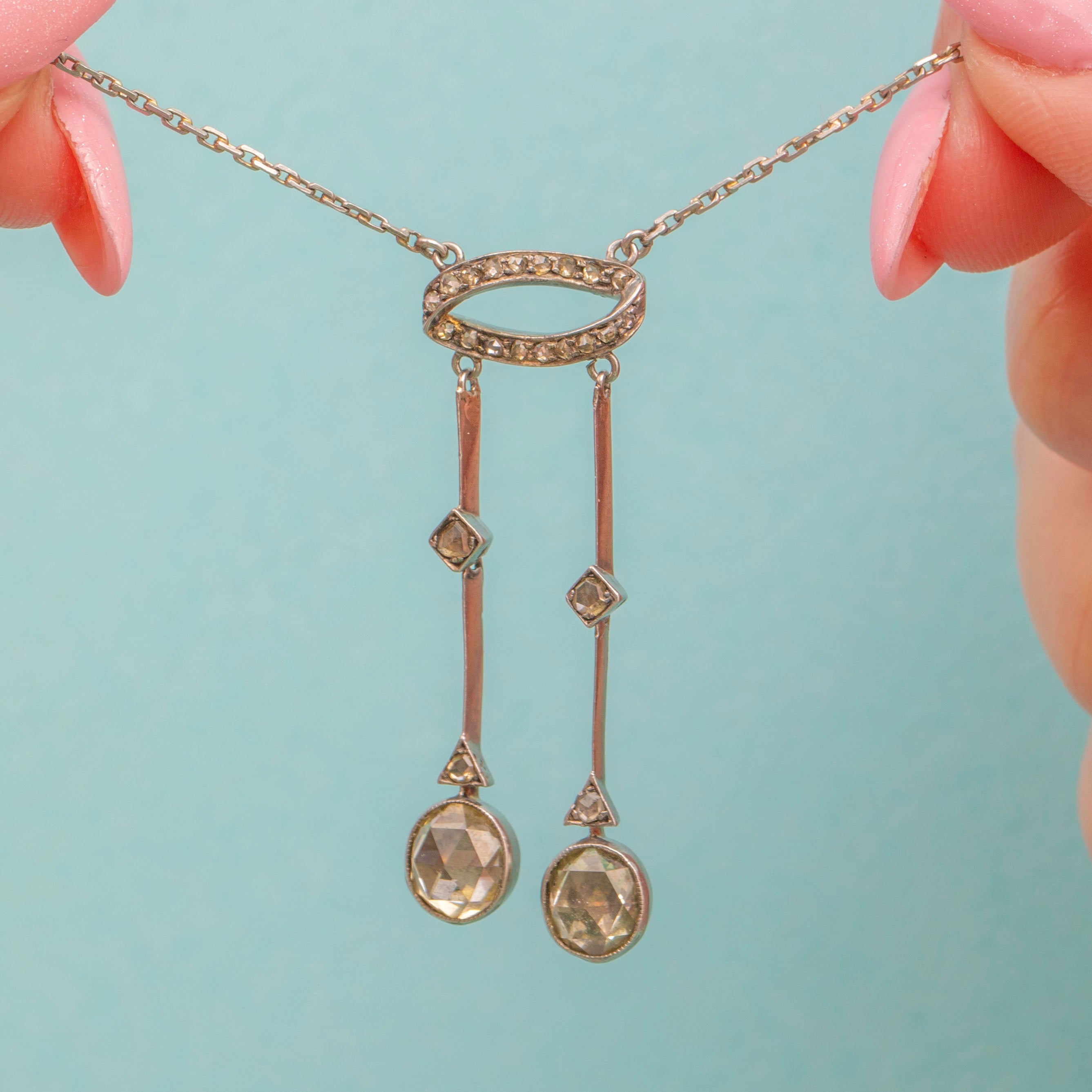 VERY GOOD: This Edwardian Platinum Diamond negligee drop necklace is in very good condition. The rose-cut Diamonds are faceted beautifully and set securely within their bezels. There are some general signs of wear present, particularly to the Platinum settings and chain, though this is commensurate with age. With a secure bolt ring, you can wear this antique Diamond necklace with confidence.