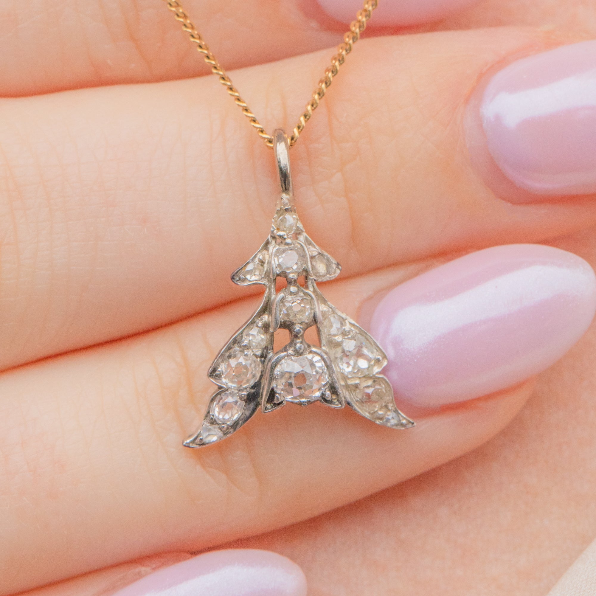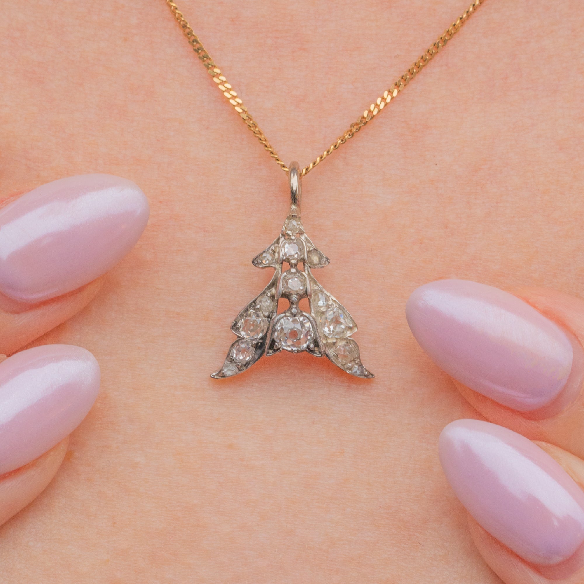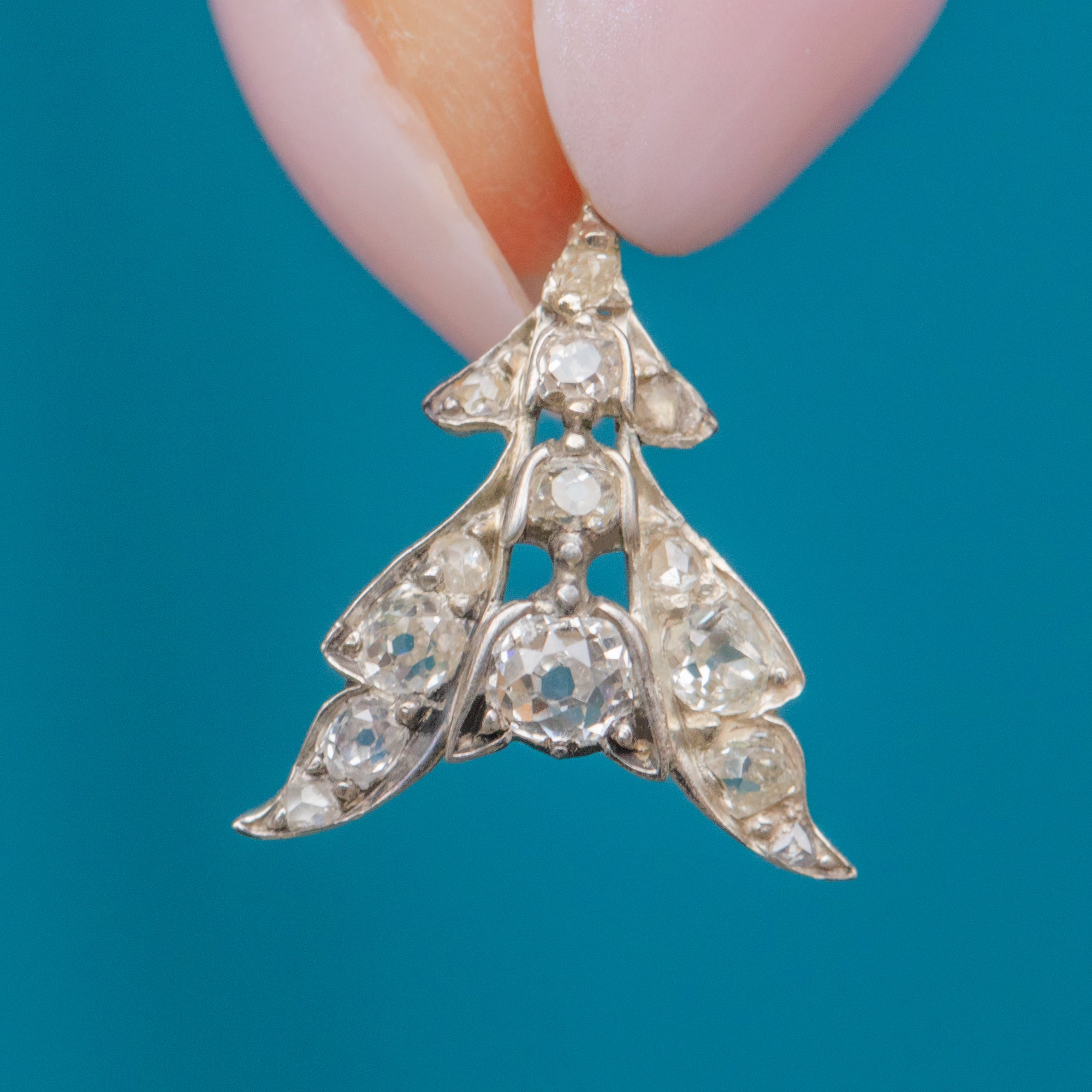 How divine is this Edwardian Platinum old-mine cut Diamond charm?! Her enchanting form is inlaid with a sea of twinkling old-mine-cut Diamonds, their crisp cut facets catching effortlessly beneath the light.