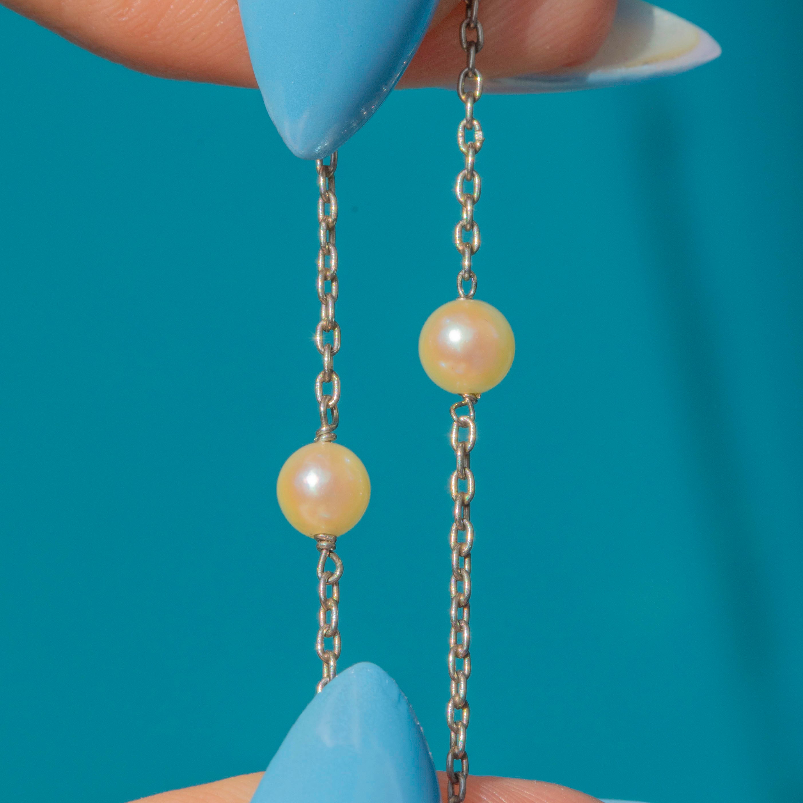 EXCELLENT: The Platinum links are bright and securely connected, with the smooth Pearls retaining their full nacre. Each Pearl is securely set, and the later-added 18ct Gold bolt ring clasp functions perfectly.