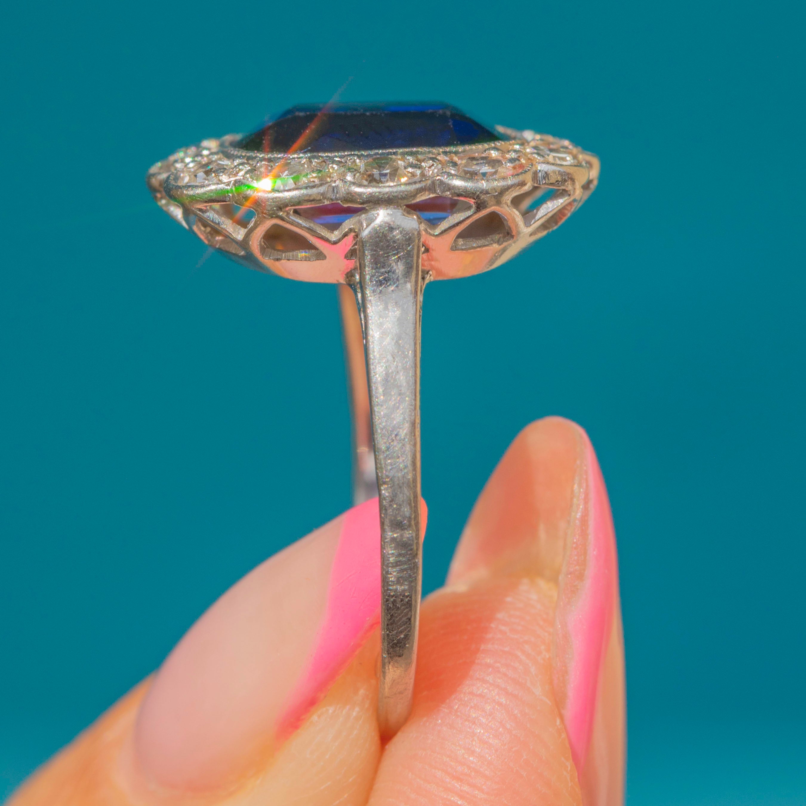 VERY GOOD. This Edwardian Platinum synthetic Sapphire Diamond cluster ring is in very good condition. The Platinum is lustrous and has held its form well, providing you with comfortable wear. Just to note, there are two little beads at the back to make the ring fit smaller, the ring fits a size UK L finger. The gemstones are all present and securely set, with only minor nibbles to the front facets, noticeable under close inspection with a jeweller's loupe. This piece is likely of French origin as there are worn stamps on the outside of the band. Promising many more years of wear and enjoyment, this antique Sapphire Diamond ring is a superb investment piece!
