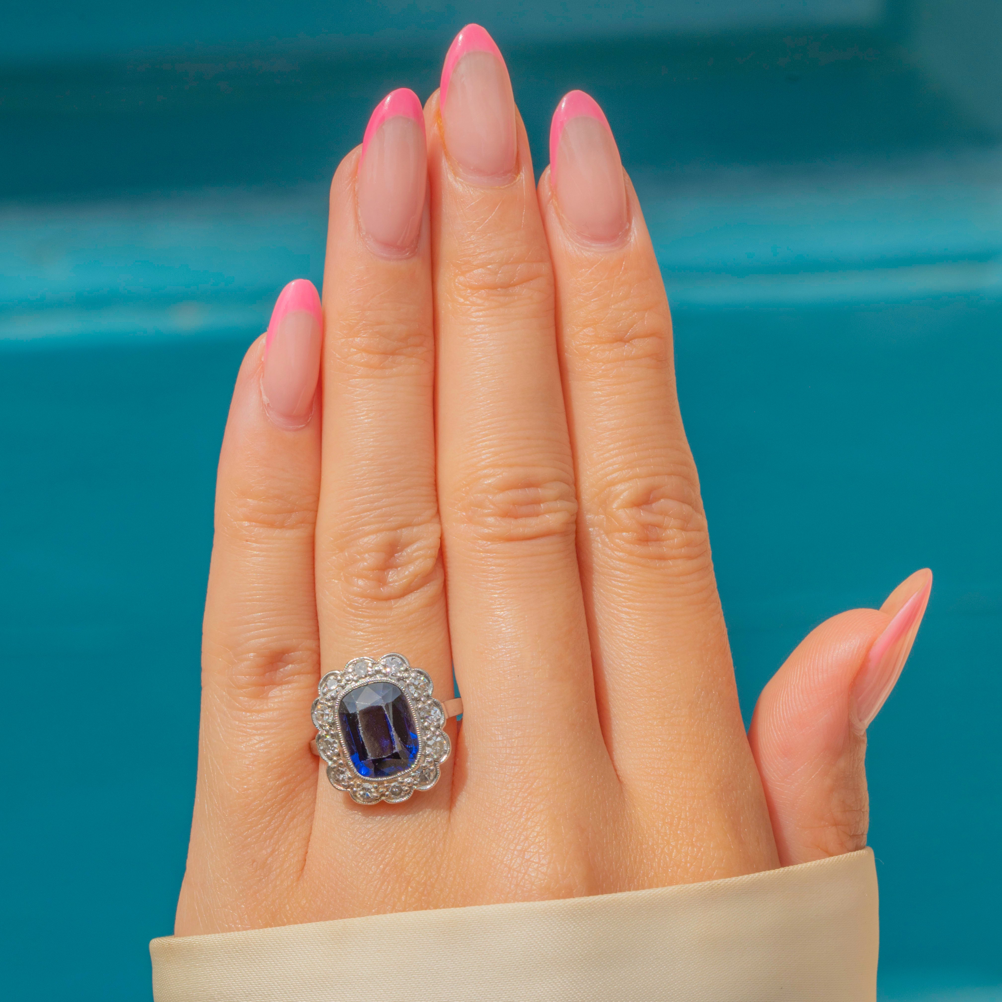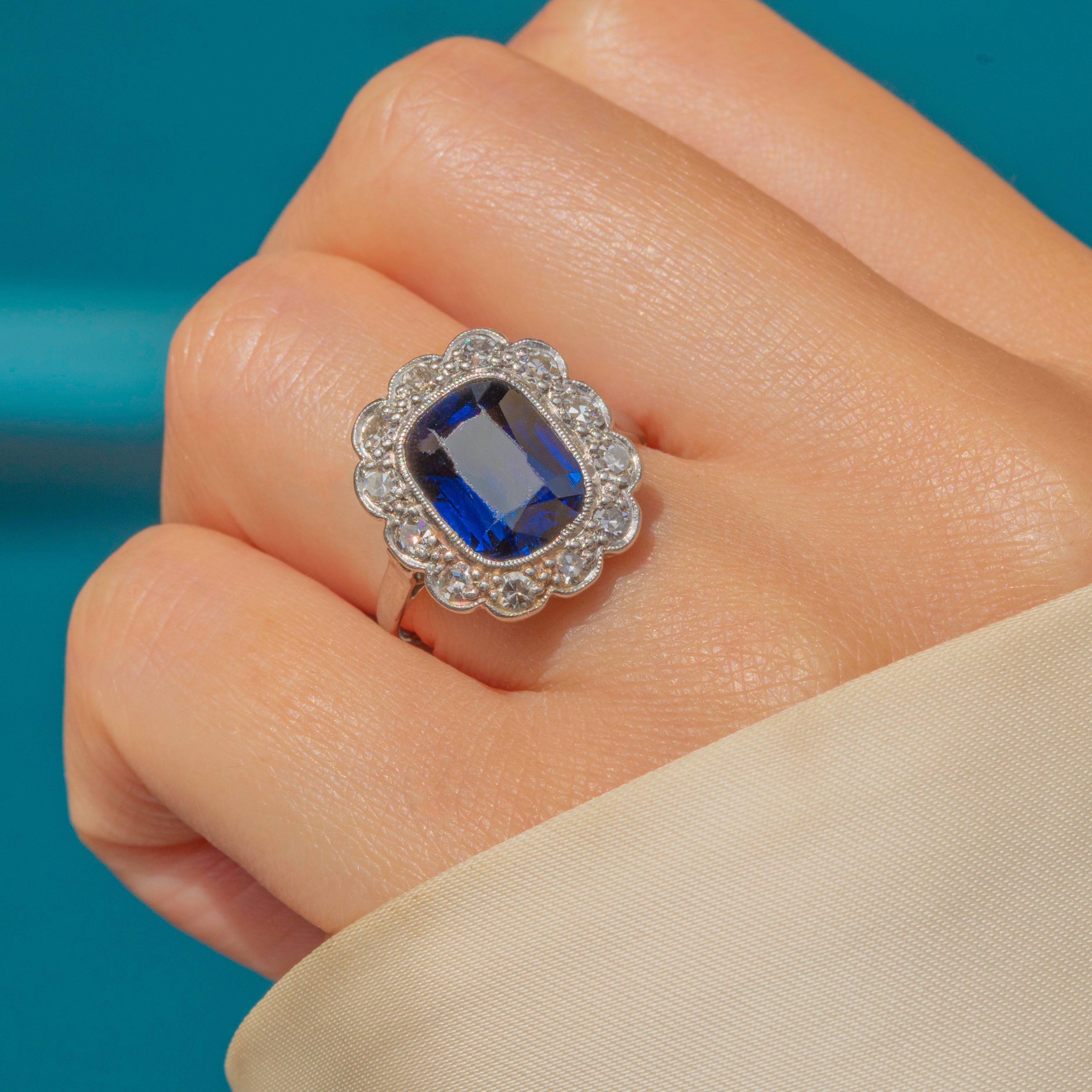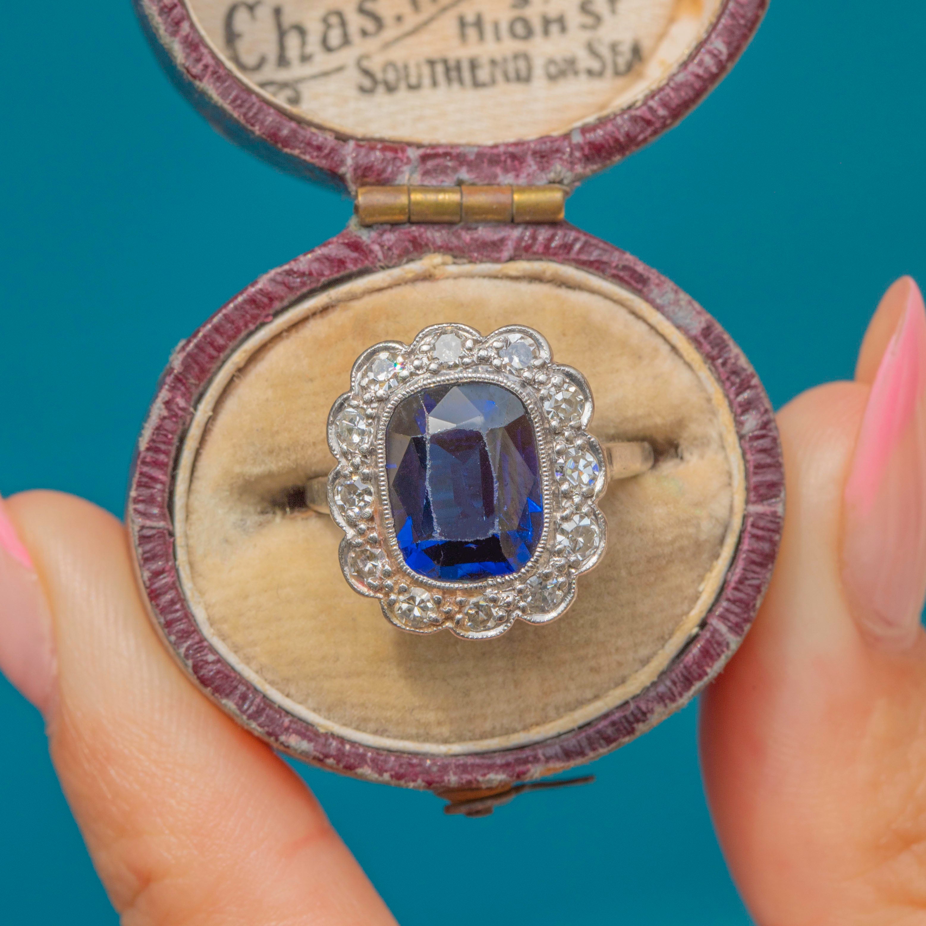 The sizable 2.70ct Sapphire is one of the early synthetic Sapphires created during the turn of the century, a technique called flame fusion created by Auguste Verneuil in 1902. The Sapphire will instantly enchant you with its mesmerising deep Royal blue hue, haloed by twelve scintillating old-cut Diamonds, creating a spectacular display of sparkles under the light. This timeless Edwardian cluster ring is a fine investment piece, guaranteed to be treasured for generations to come!