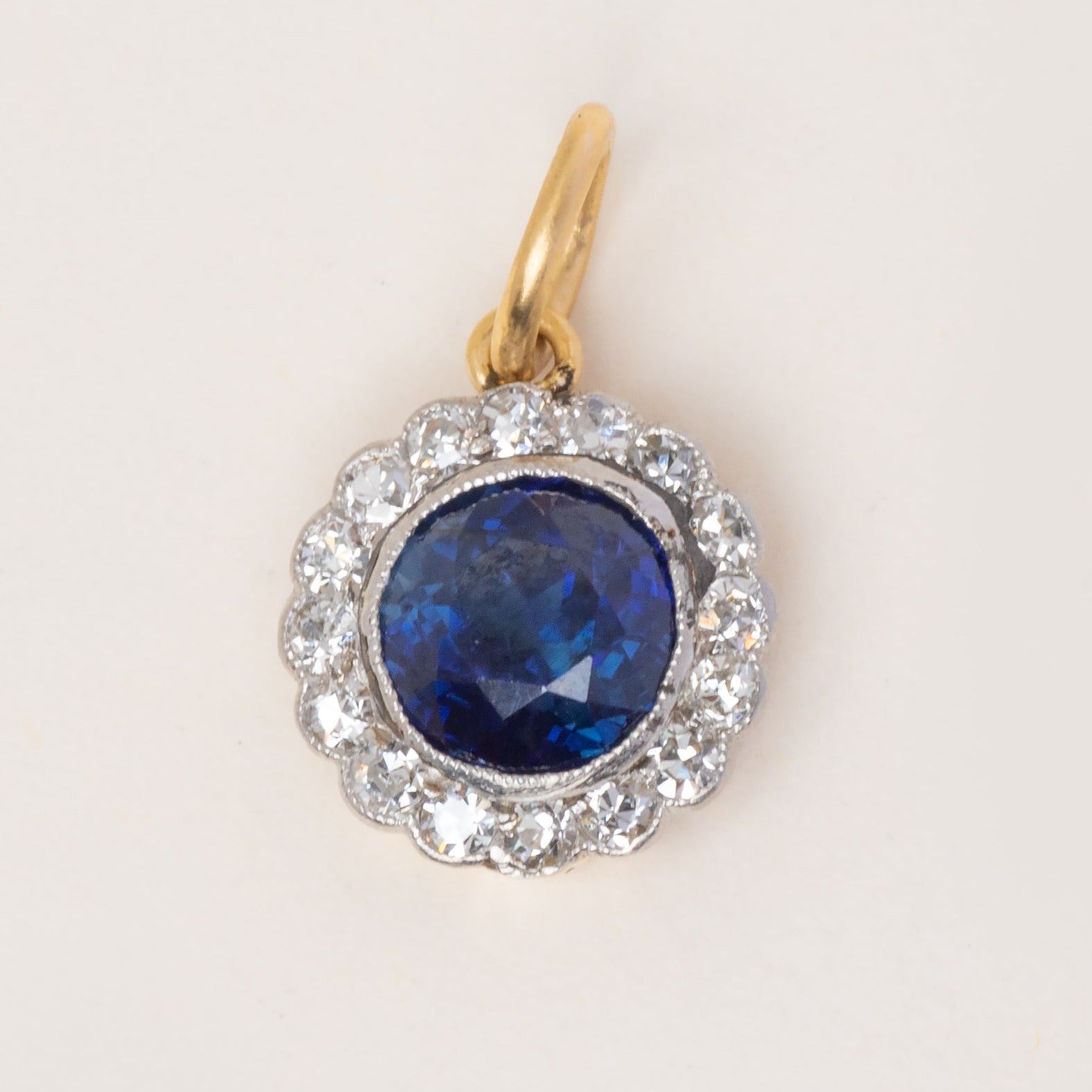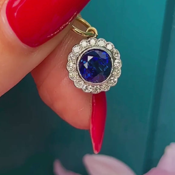 EXCELLENT. This Edwardian Sapphire Diamond cluster charm is in excellent condition! The Sapphire and surrounding Diamonds are in tip-top condition and offer all the elegance you could want from this gemstone duo. The Platinum milgrain detailing is pristine and securely holds the Gemstones in place. With a soldered jump-ring to finish, you can wear this Edwardian charm with the utmost confidence!