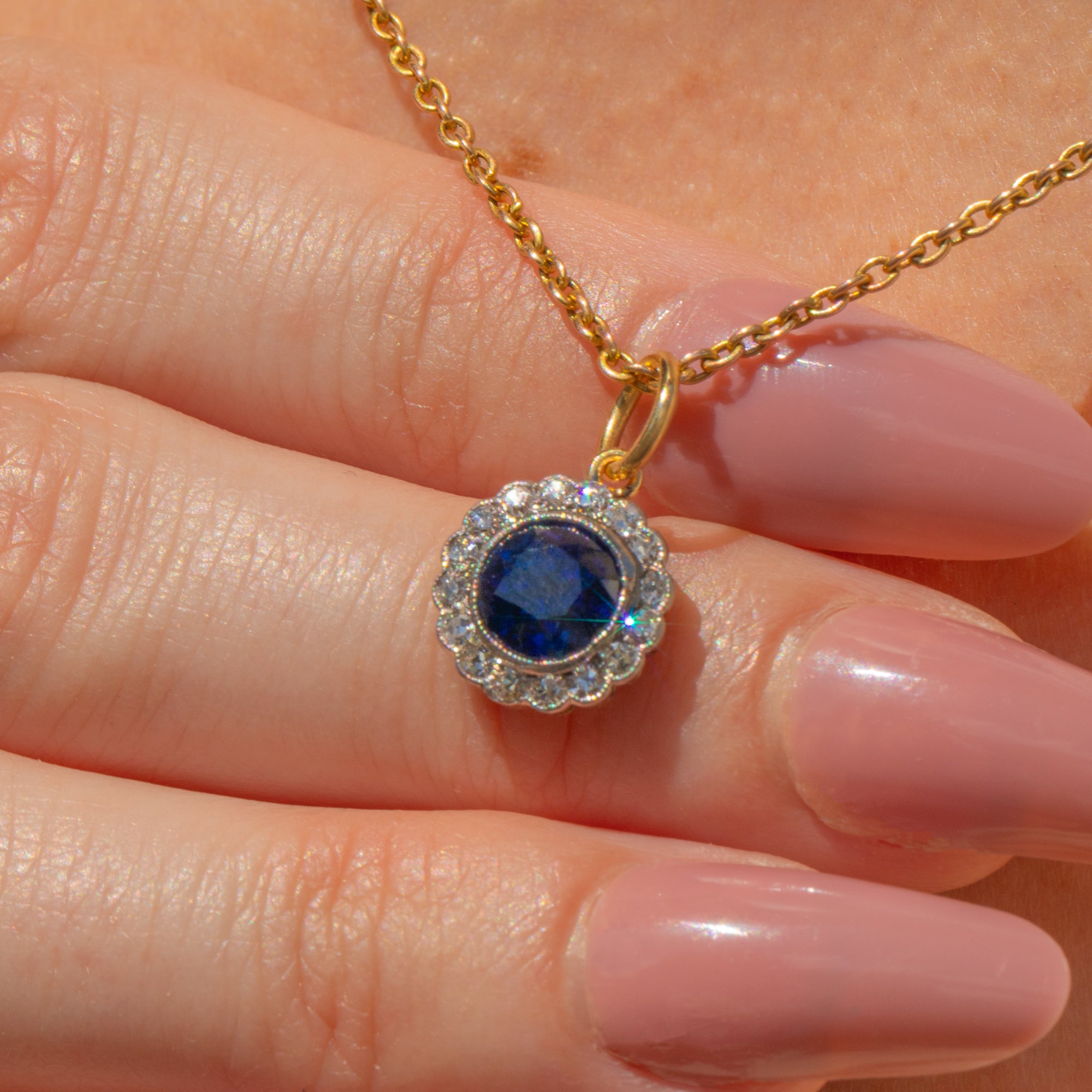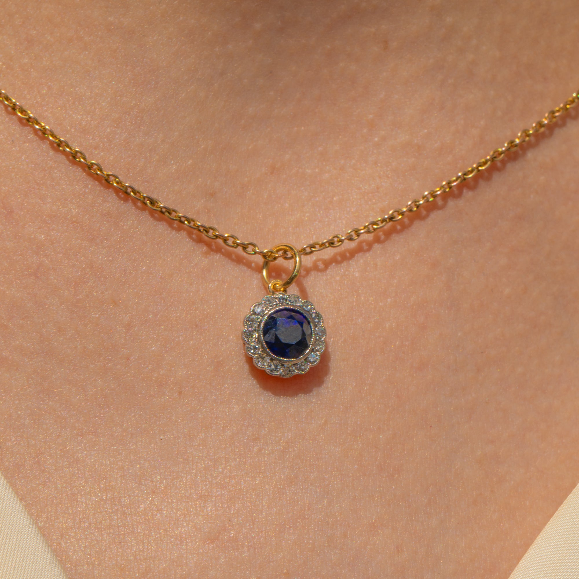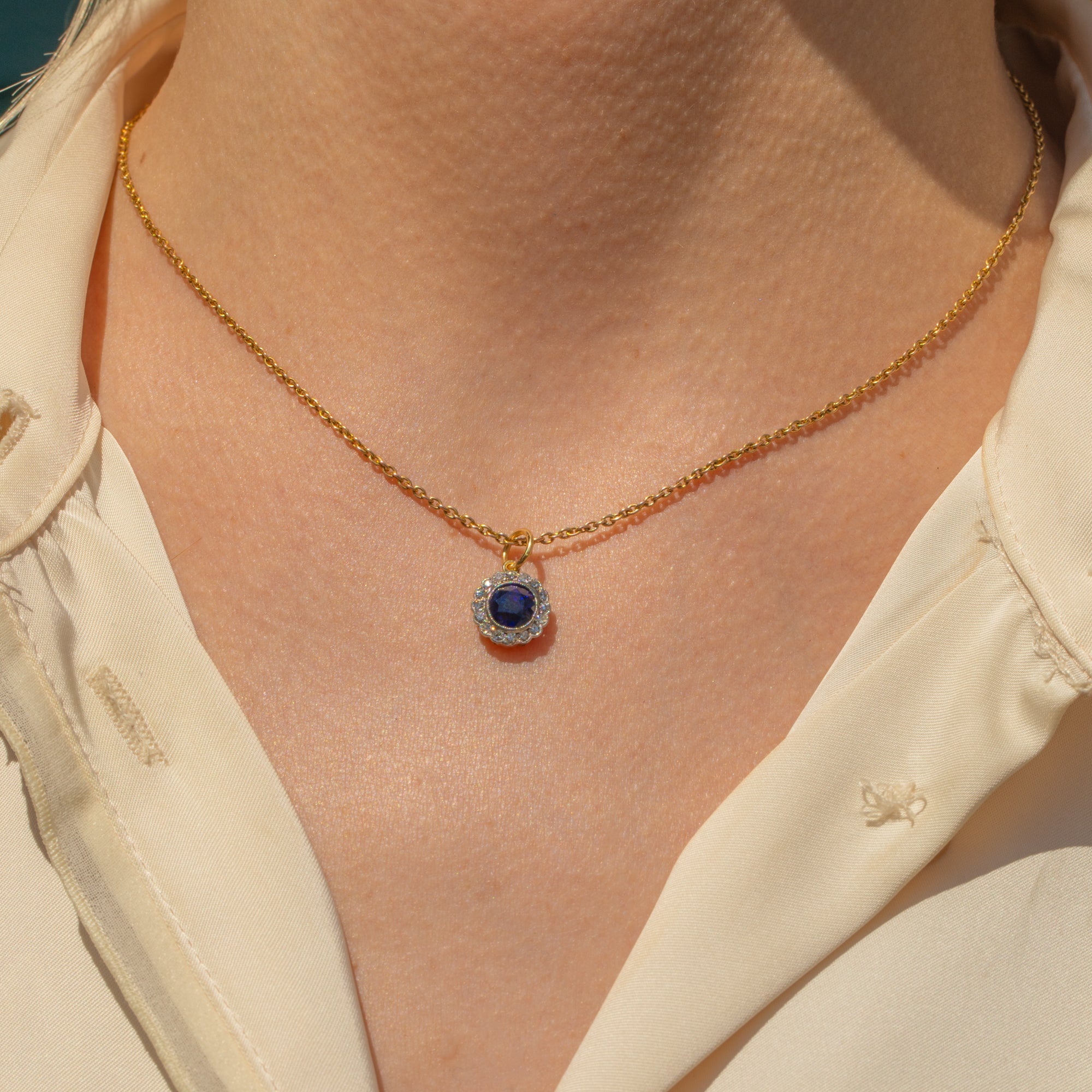 The combination of buttery 18ct Gold and lustrous Platinum is a typical characteristic of early 20th century jewellery, and one we love. Suspended from an antique Gold chain, you will never tire of wearing this antique Sapphire Diamond pendant.