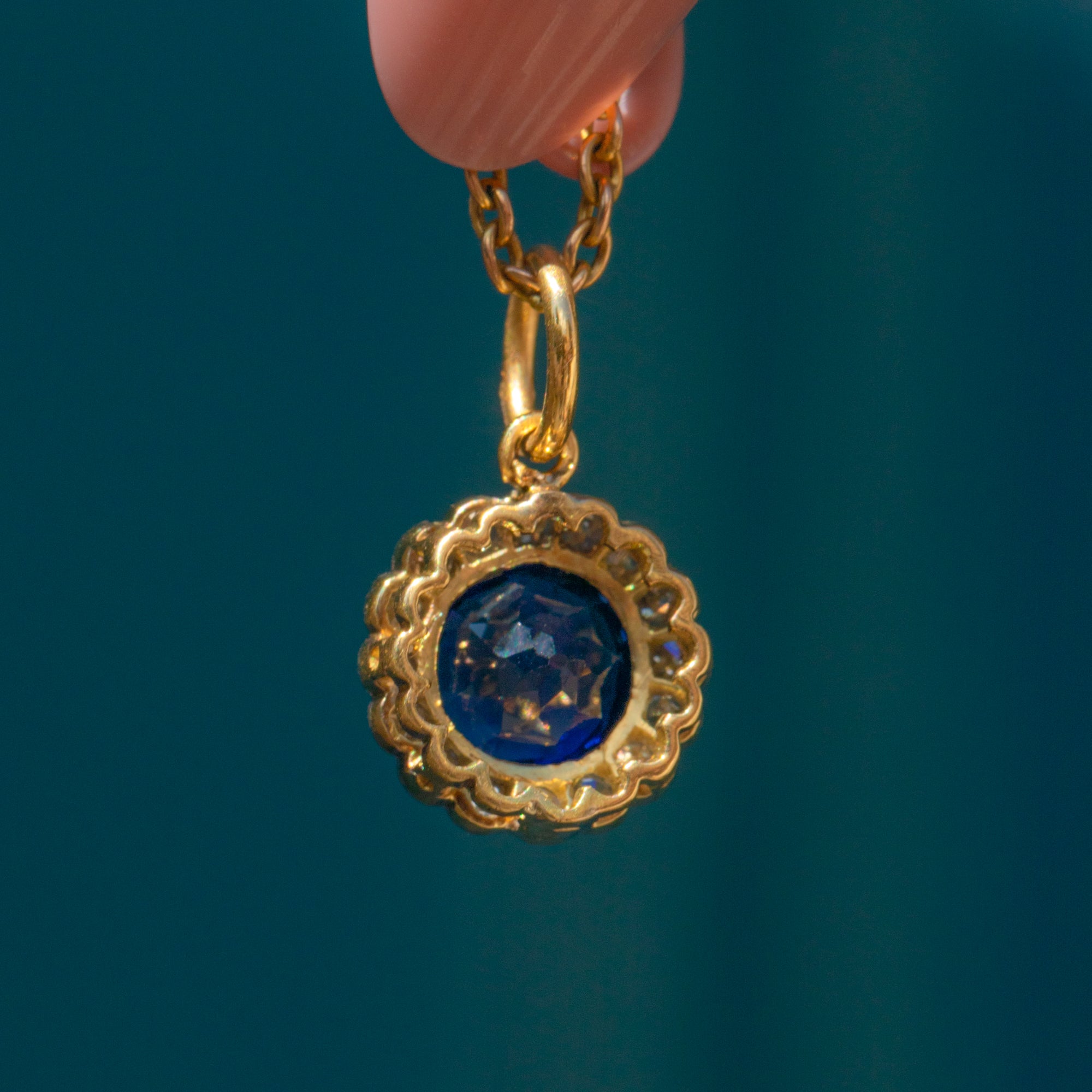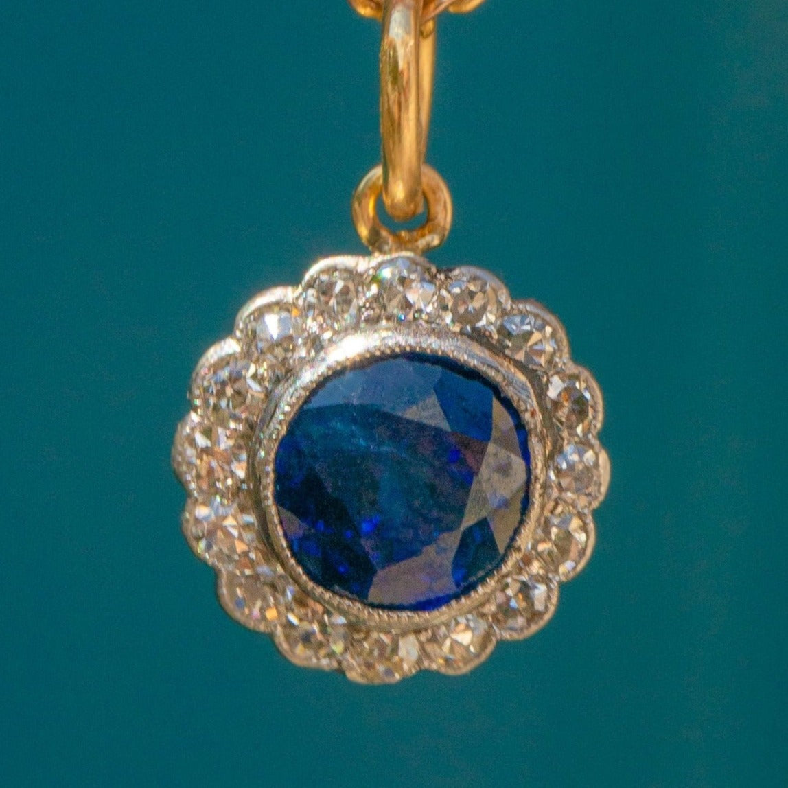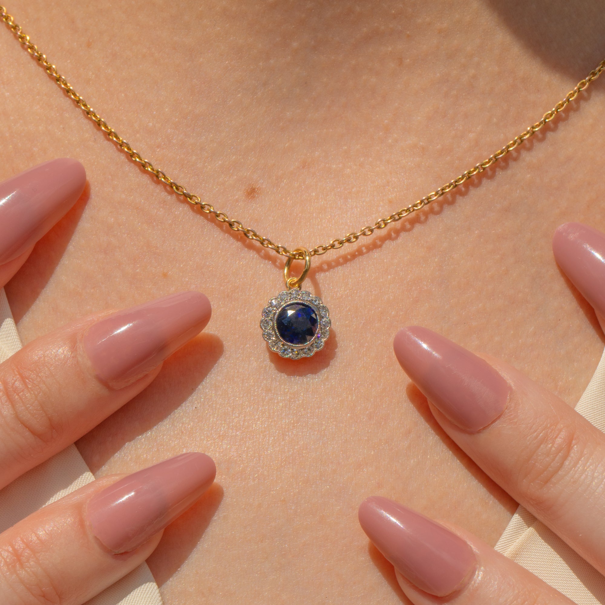 The combination of buttery 18ct Gold and lustrous Platinum is a typical characteristic of early 20th century jewellery, and one we love. Suspended from an antique Gold chain, you will never tire of wearing this antique Sapphire Diamond pendant.