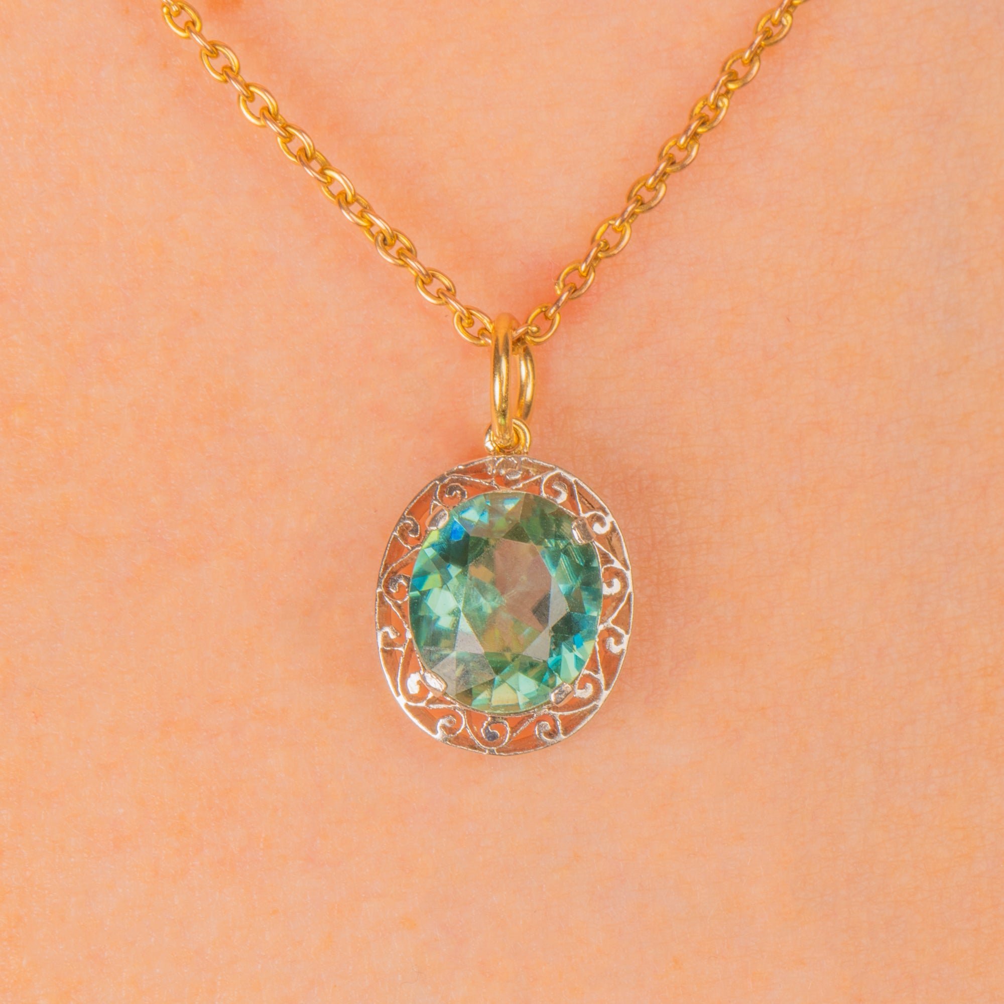 The blue Zircon is the most ravishing cyan blue colour, and with her entire circumference surrounded by Silver ornate scrollwork, this Edwardian pendant is a must-have. Imagine her with a skinny Gold chain and a buttoned-down white shirt!