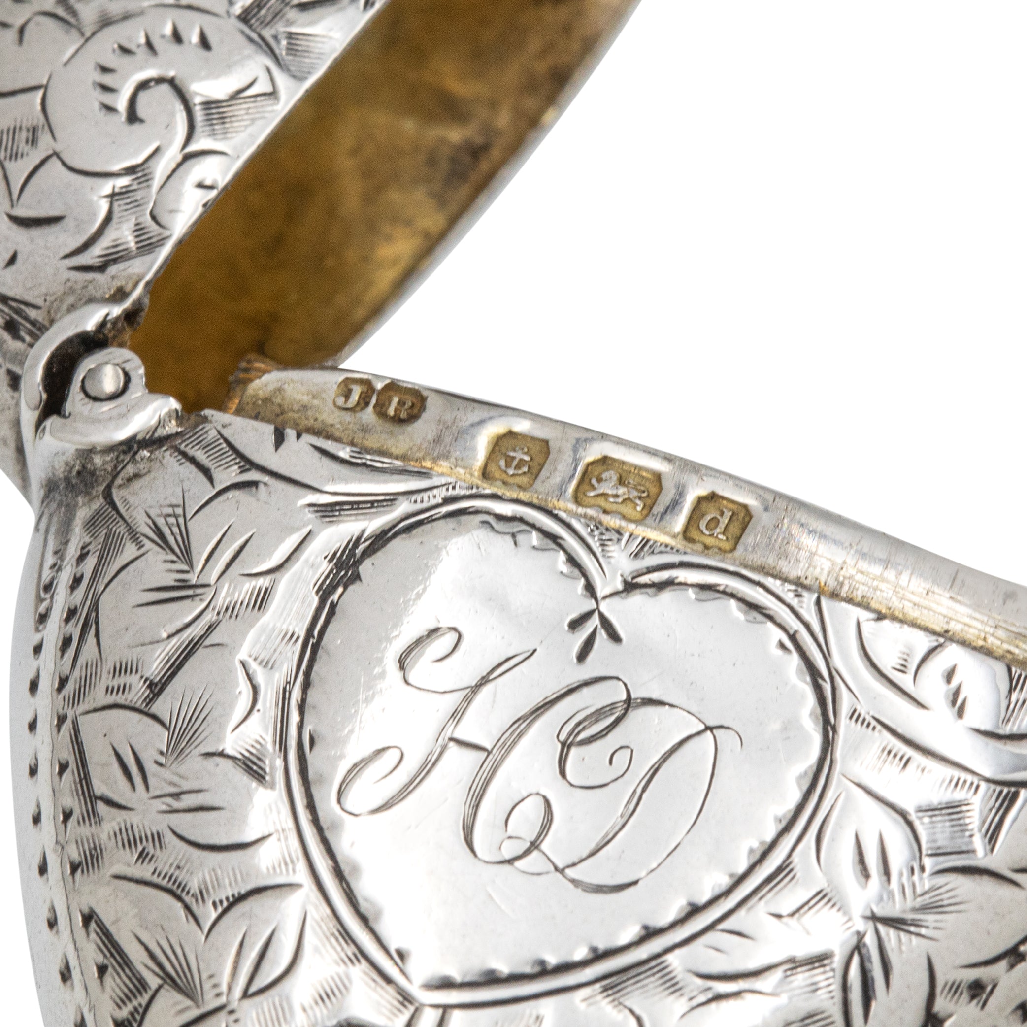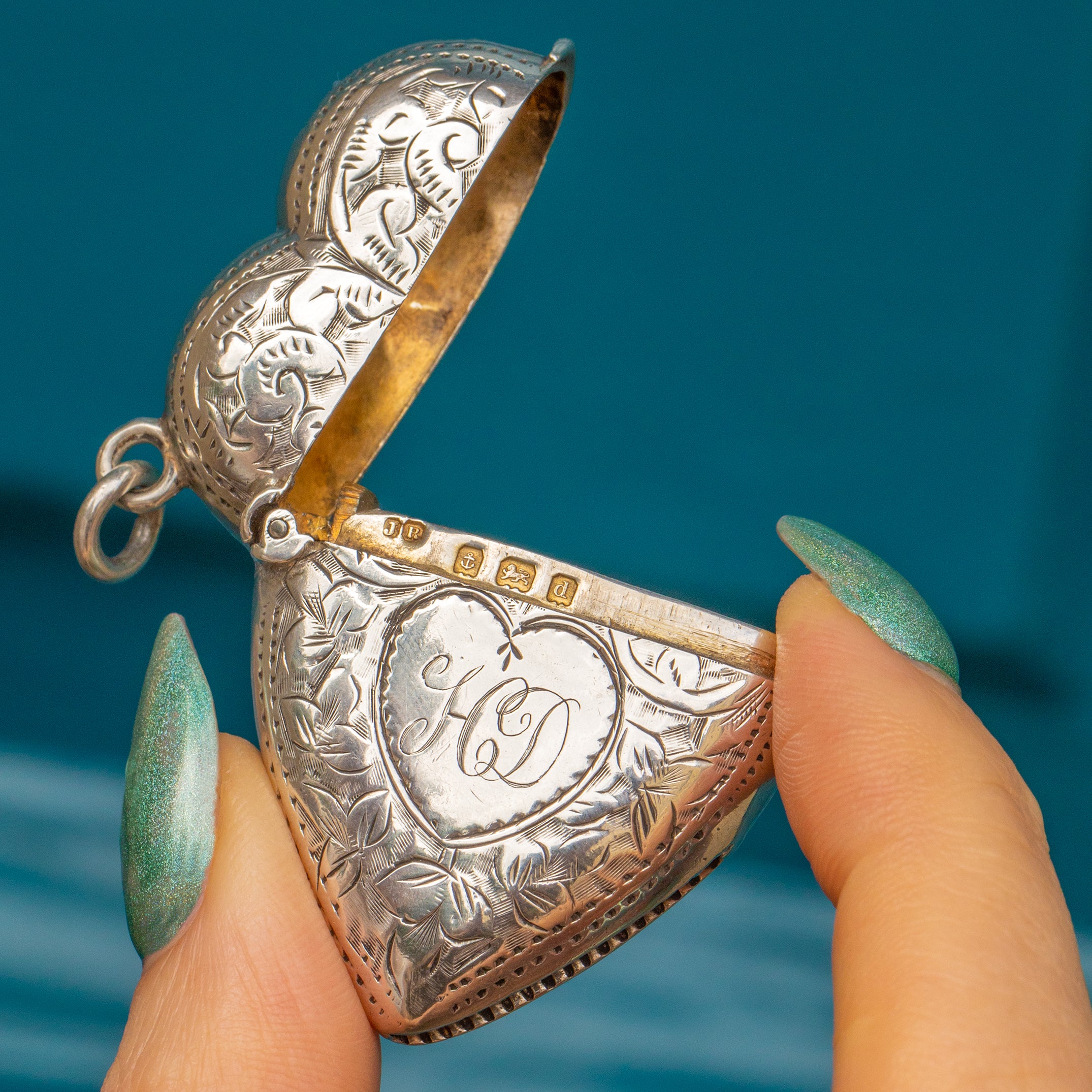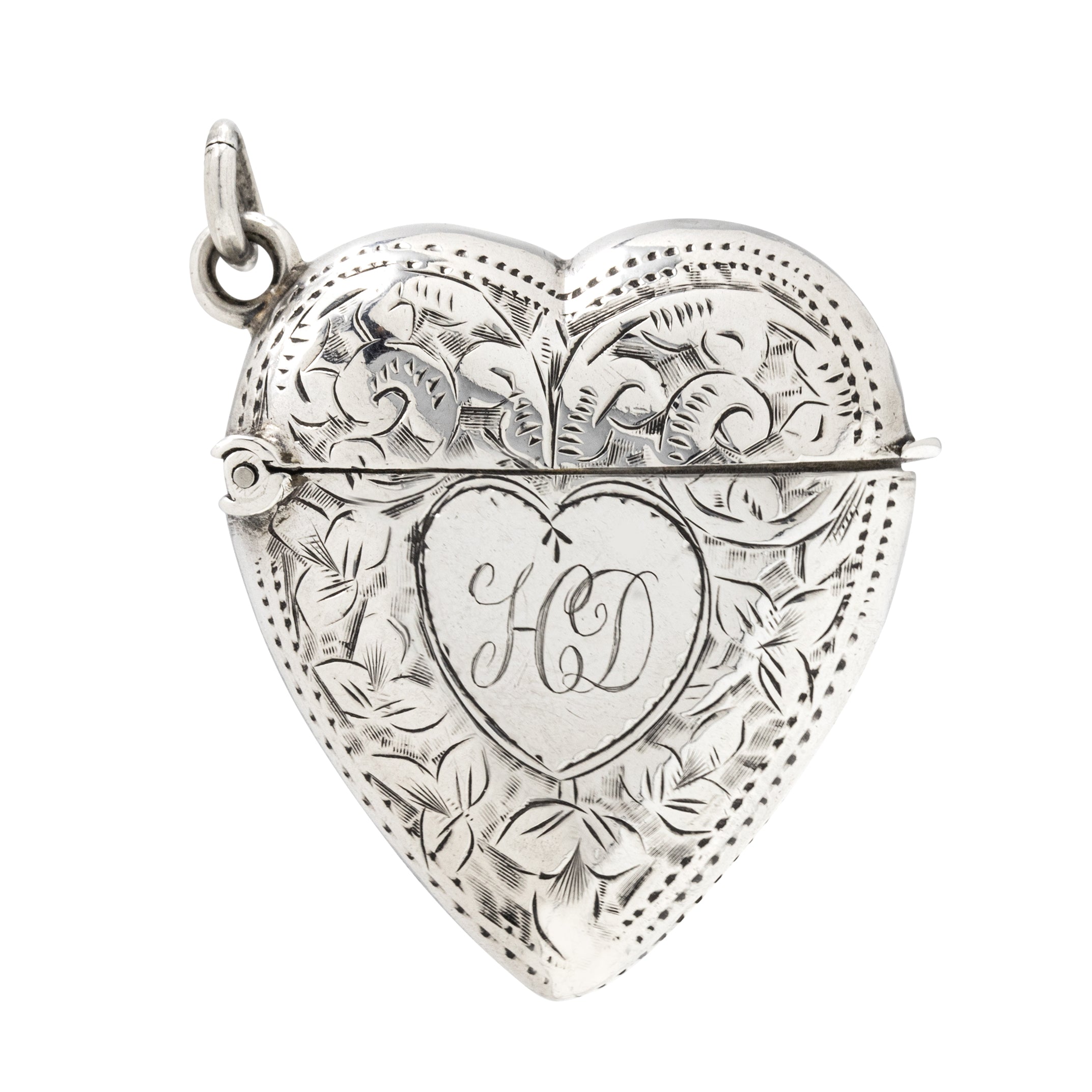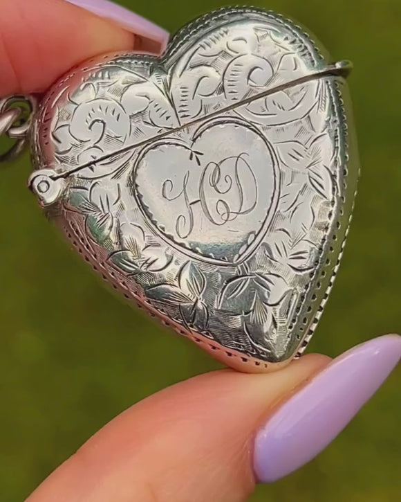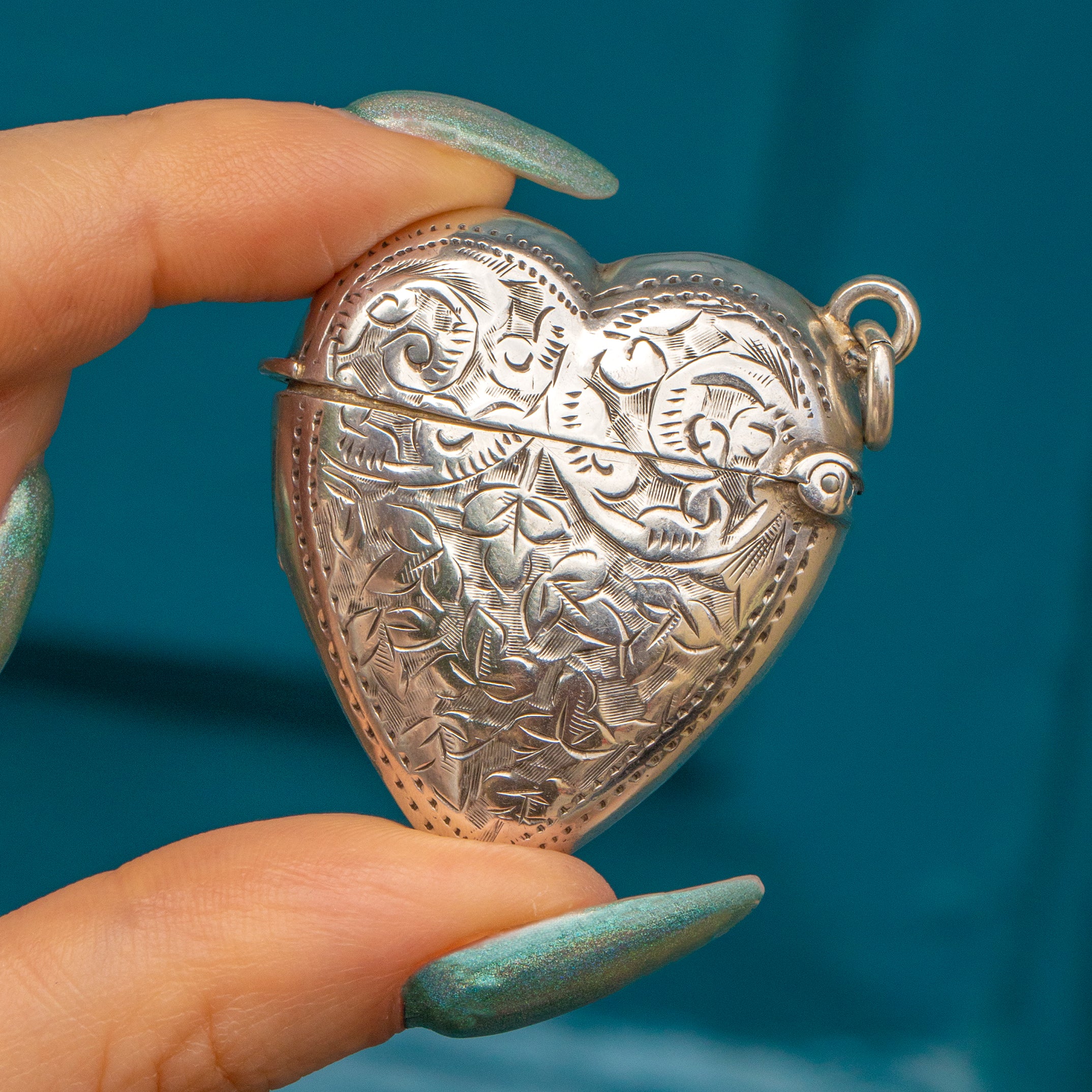 VERY GOOD. This Edwardian Silver engraved heart shaped vesta case is in very good condition! Her Sterling Silver is beautiful throughout, with her engravings having remained crisp and clear. There is a dark patina on the inside, commensurate with age, adding to her antique charm. Her hinge mechanism is in full working order keeping the lid firmly shut when suspended from the jump-ring. An overall exciting and characterful piece, sure to make a cute addition to your collection!
