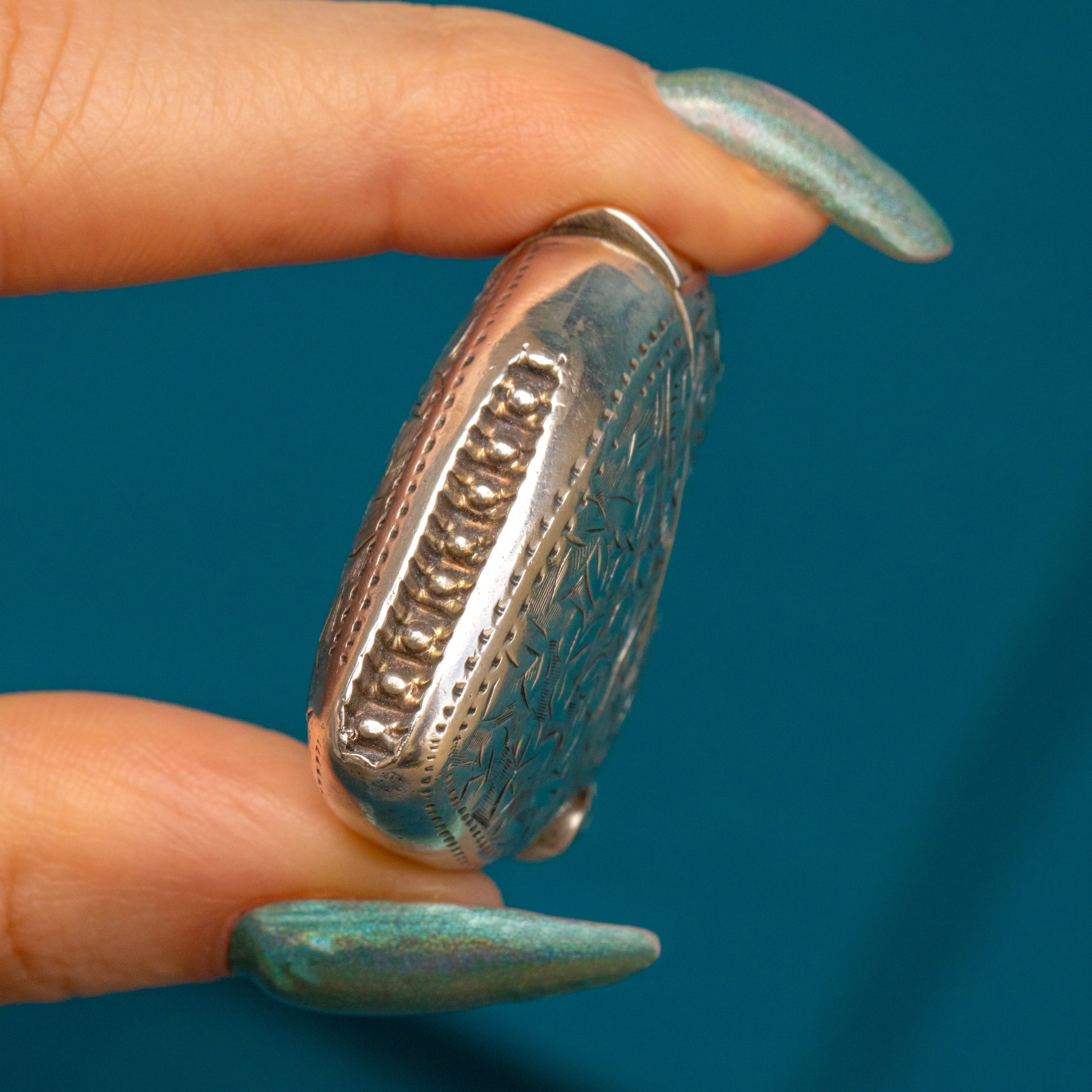 Crafted from lustrous Sterling Silver, her heart shape is encased in forget-me-nots and comes complete with a cartouche on her front reading 'HD'. With her chunky jump ring, she could become a statement piece adorning your neck by simply suspending her from a chunky Silver chain. This Edwardian vesta case will make a fun addition to your antique jewellery collection!