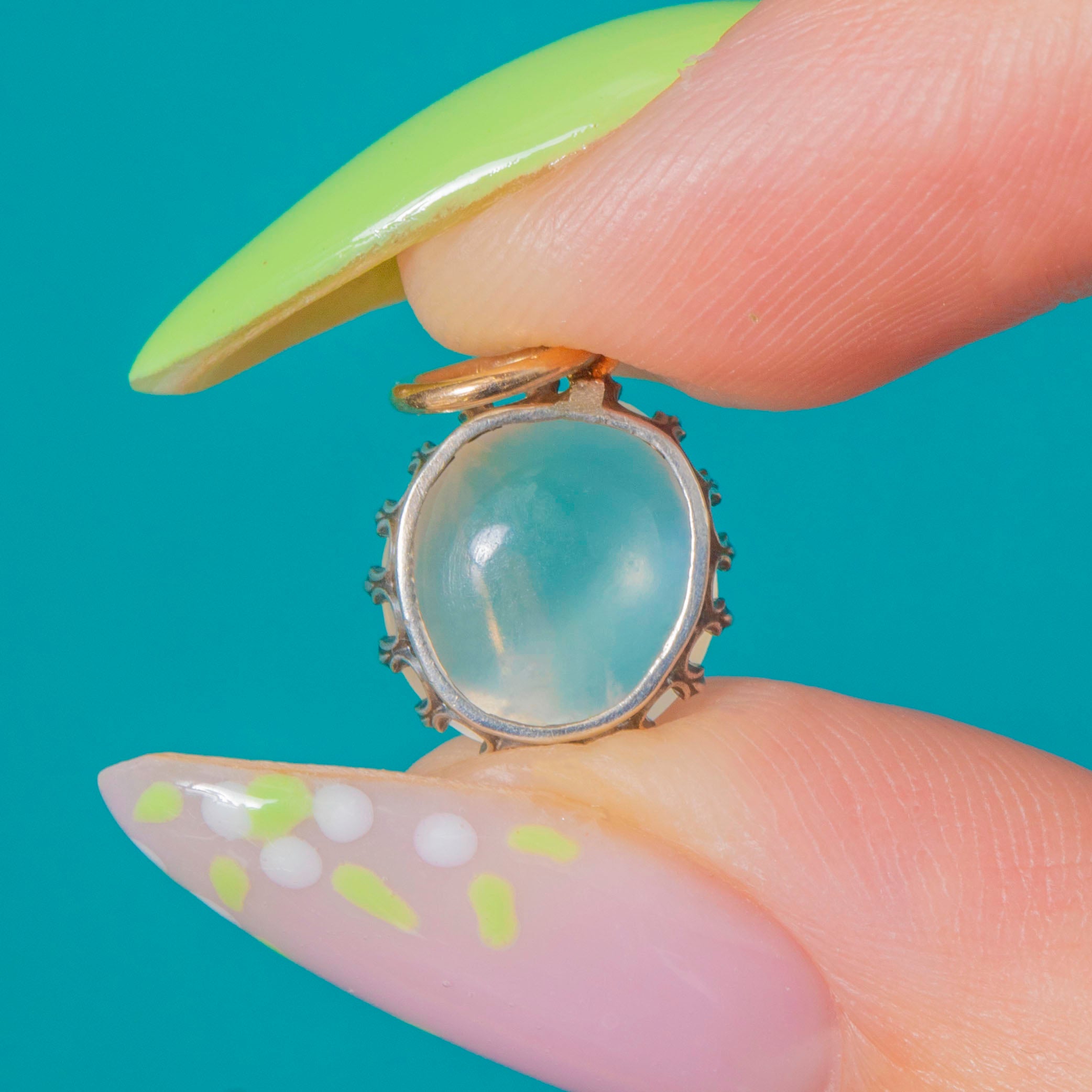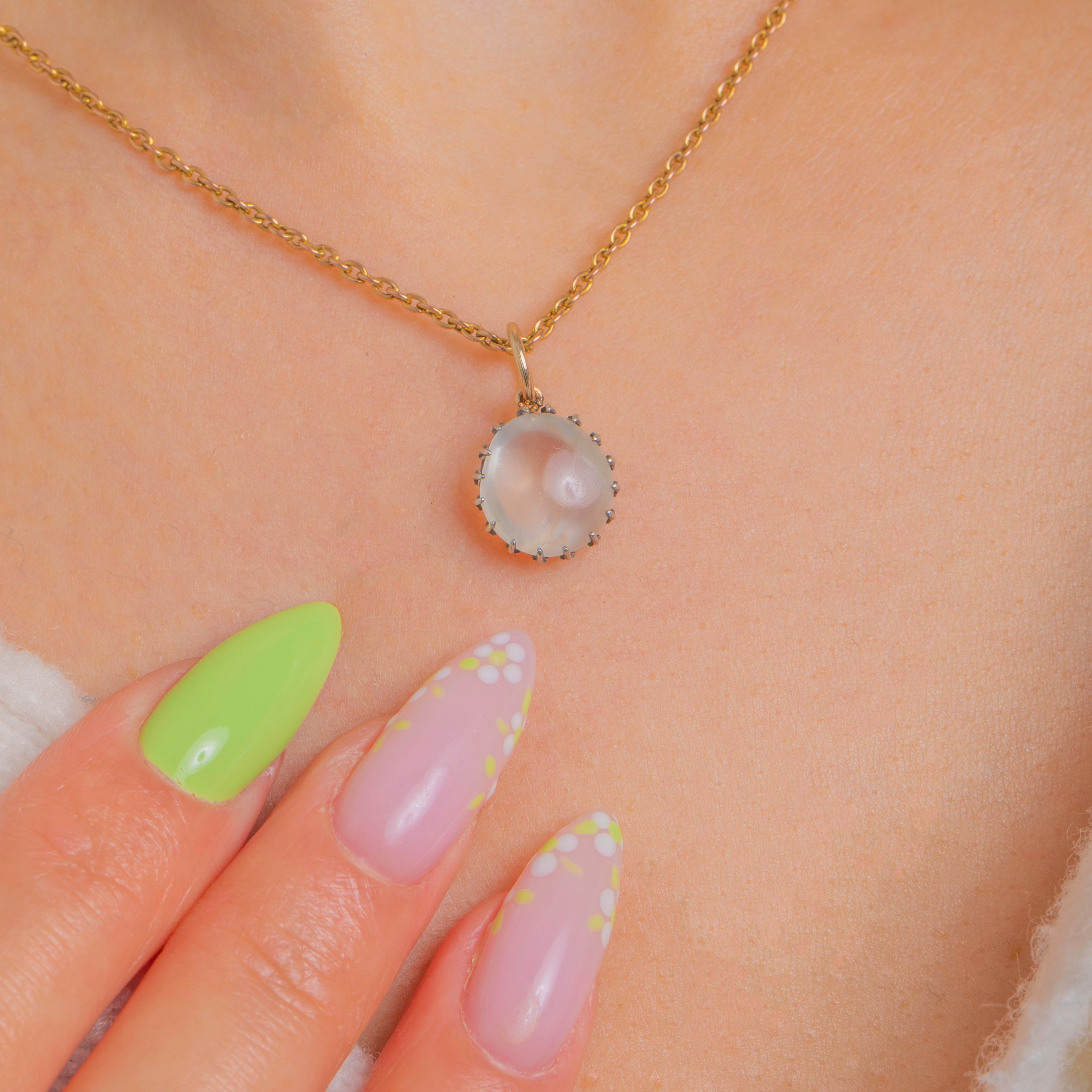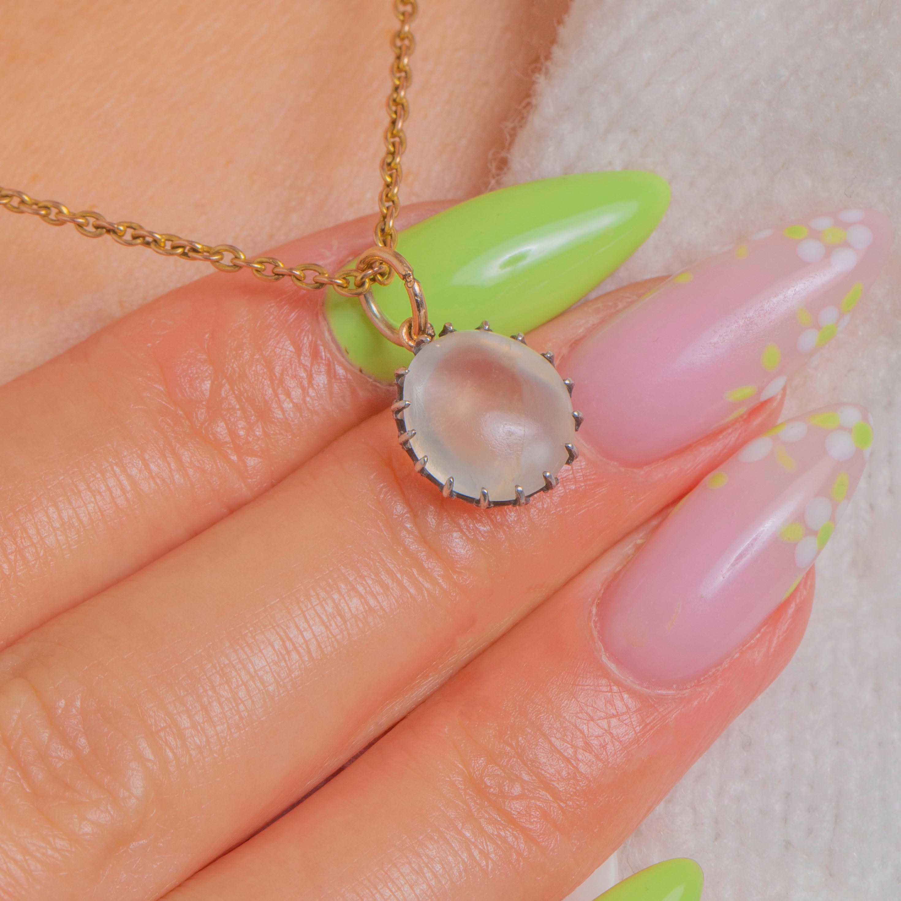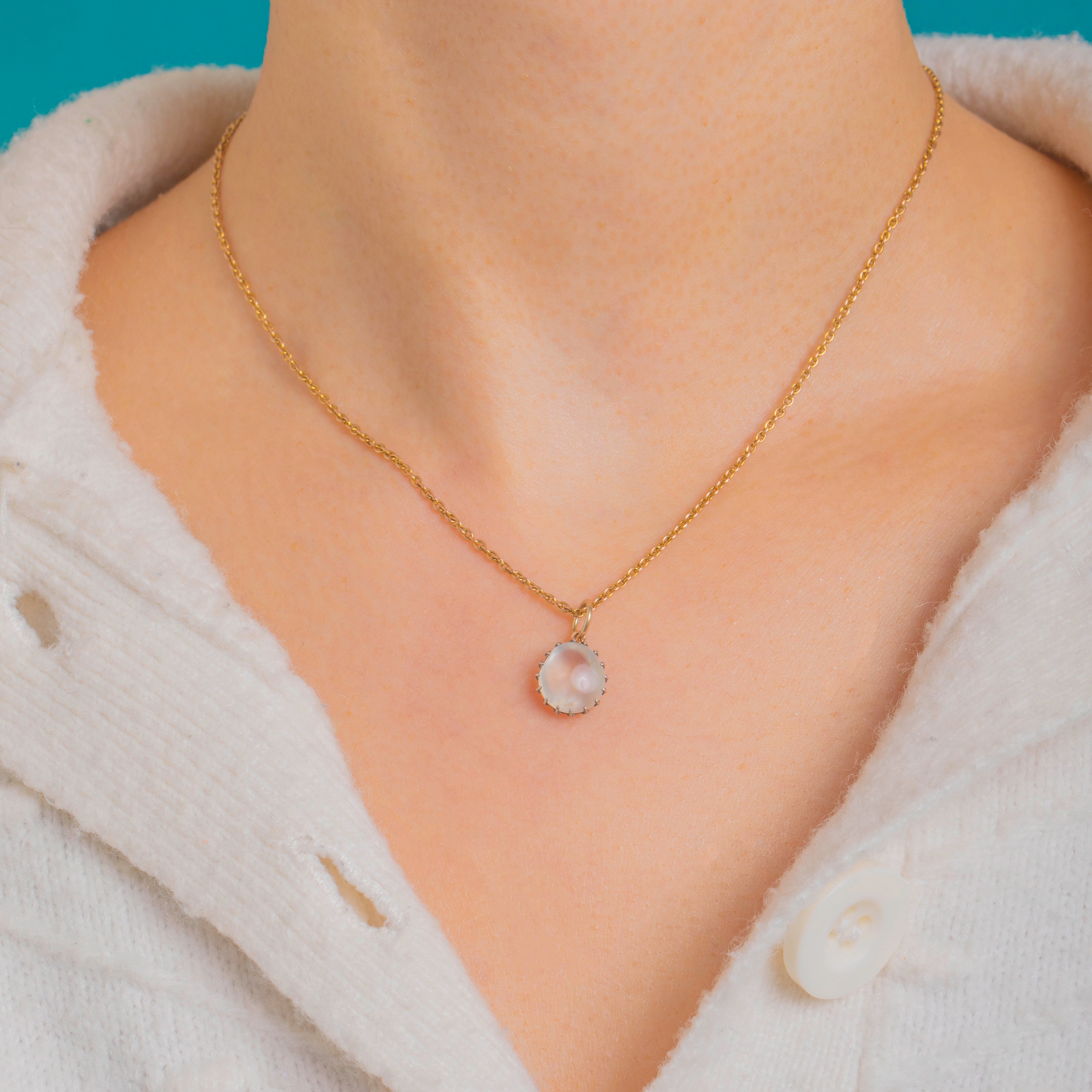 Ein leuchtender Edwardian Mondstein-Anhänger, gekrönt von einer filigranen Silber-Krappenfassung, die das sanfte blau-weiße Adulareszenzspiel des Steins bei jeder Bewegung erstrahlen lässt. Ein schlichter 9ct Gold-Federing setzt einen warmen Akzent und ermöglicht das mühelose Anbringen an Ihrer Lieblingskette.