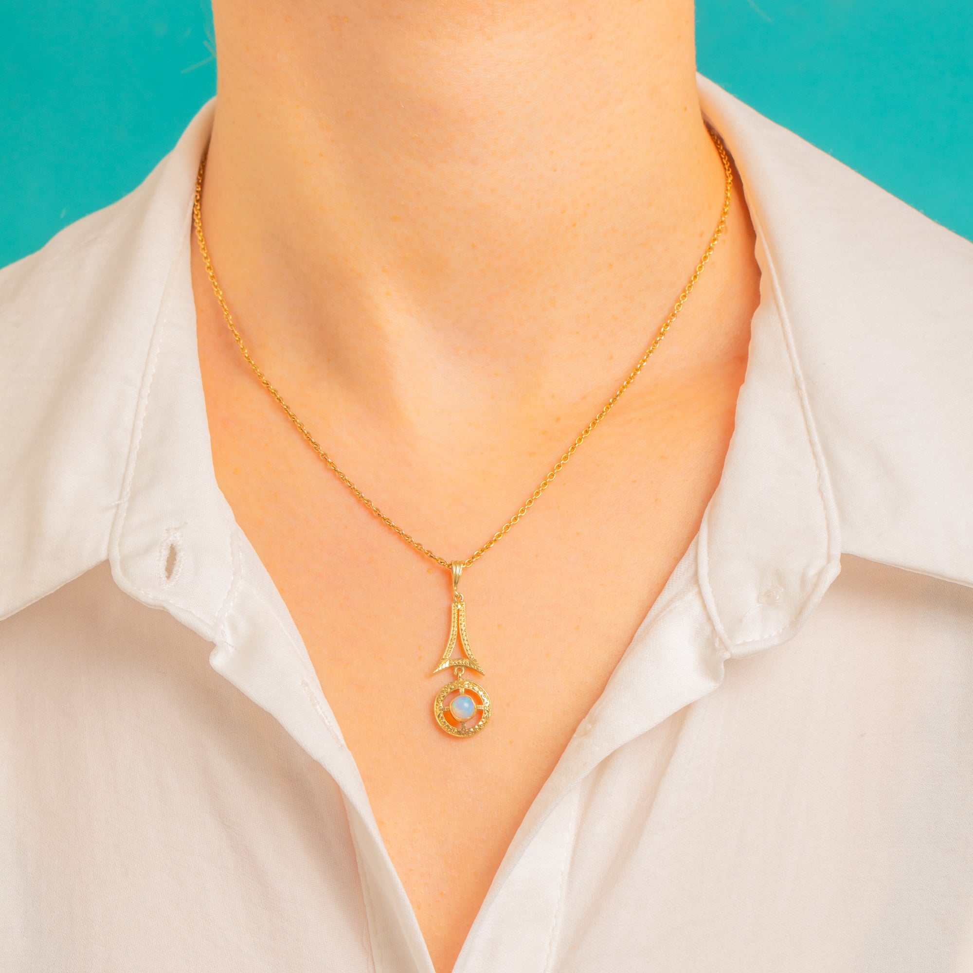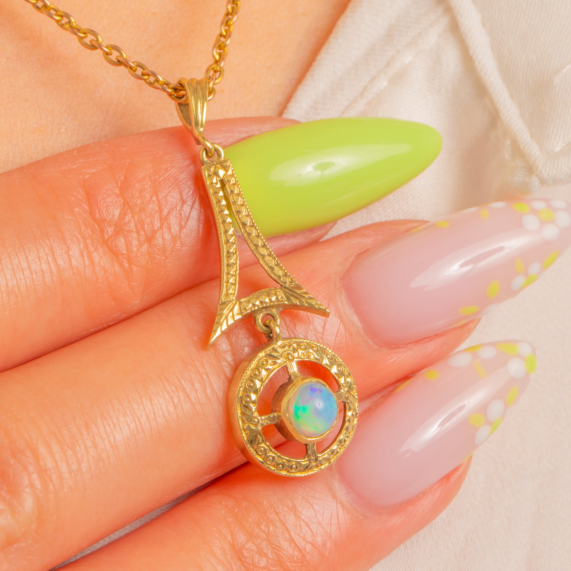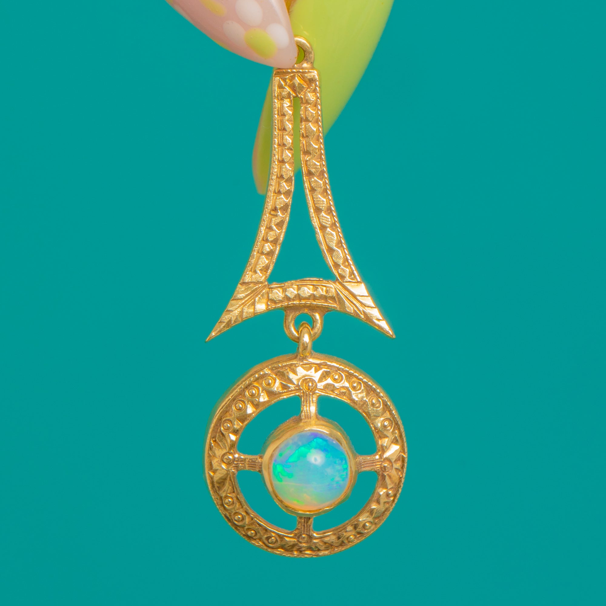 Lebendig durch feine Bewegung und Vintage-Charme, steht bei diesem gravierten Anhänger aus 14ct Gold ein leuchtender runder Opal-Cabochon im Mittelpunkt. Die bewegliche, zweiteilige Silhouette kombiniert ein zulaufendes, graviertes Oberteil mit einem runden, durchbrochenen Rondell. Der Opal ist in einer glatten Zargenfassung gehalten und wird von feinem Millegriff- und Ziergravur-Dekor umrahmt. Ein elegantes Spiel aus Geometrie und Licht, vollendet durch eine strahlend polierte Oberfläche, die das Auge fesselt.