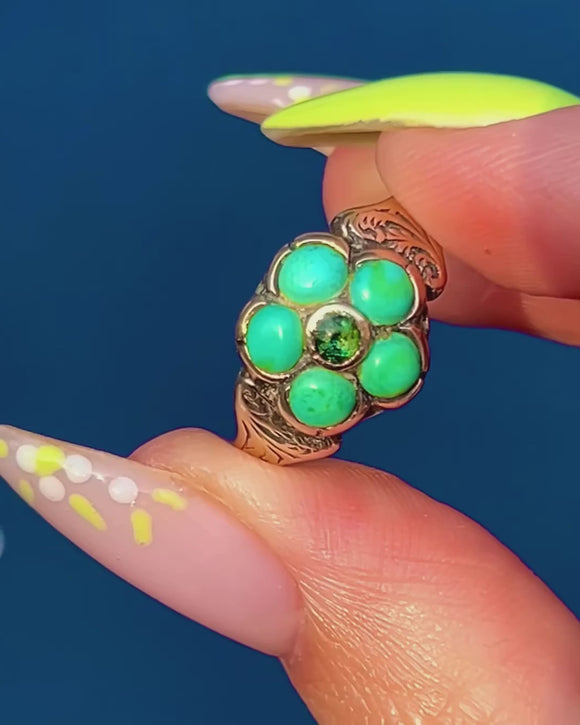 Gravierte 9ct Gold Victorian Türkis & grüne Paste Blumenring