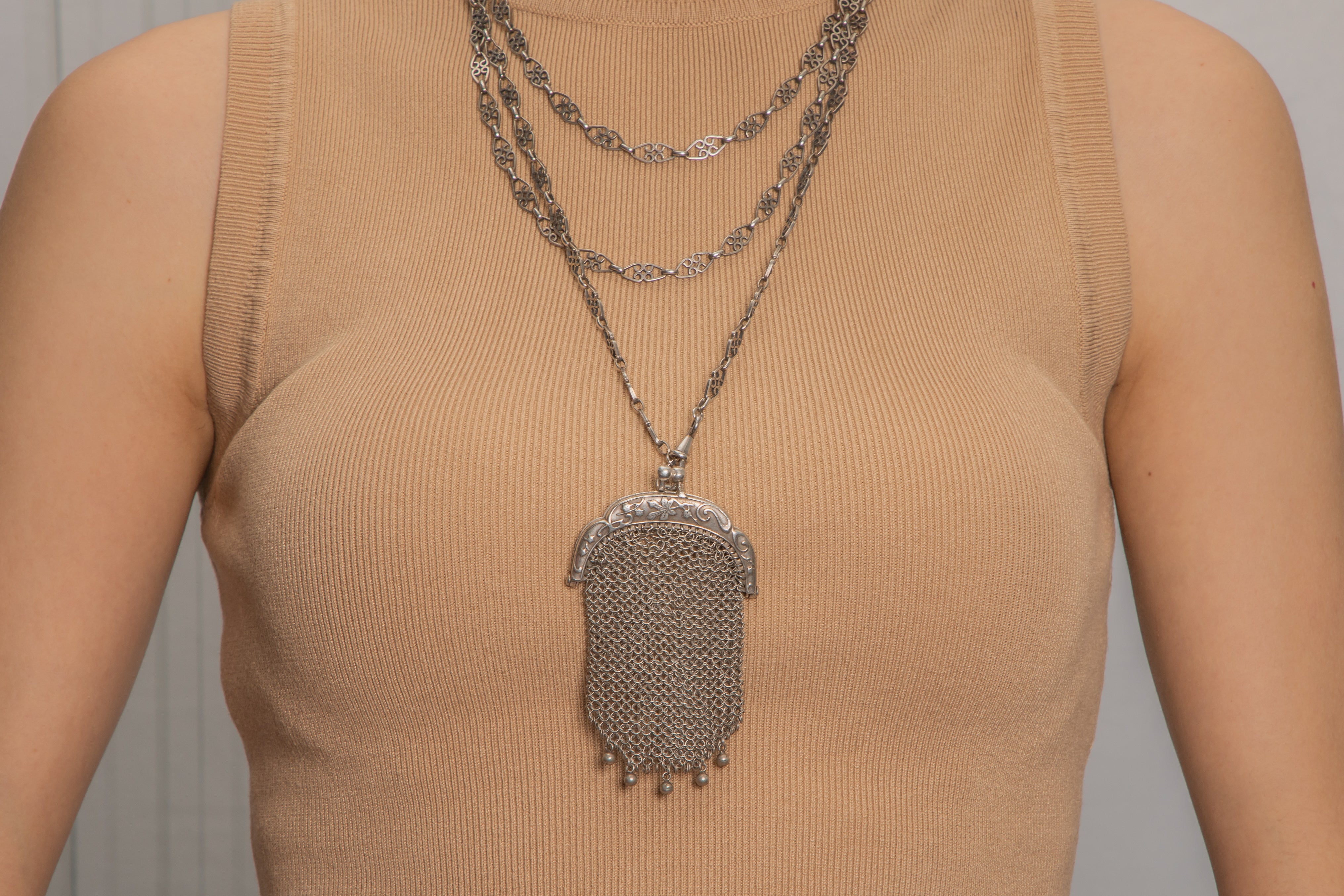 This French Silver chainmail chatelaine coin purse is the perfect accessory for any fashion-forward woman! Crafted from sturdy yet lightweight chainmail, this exquisite little Victorian coin purse is a true work of art, with every shimmering links carefully welded together by hand in an intricate interwoven pattern.