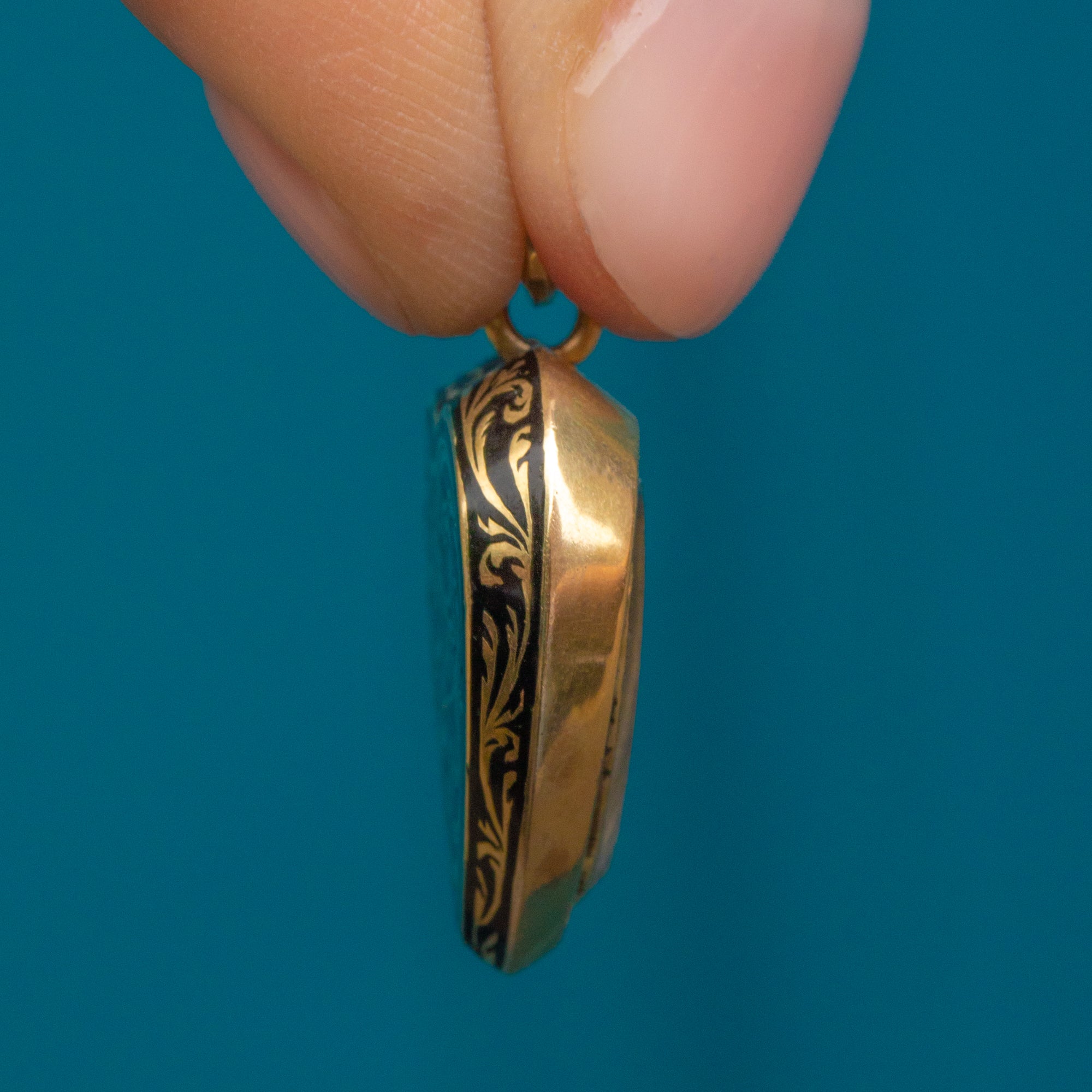 Georgian 15ct Gold Black Enamel Heart Pendant, Locket Back with Rare Blonde Hair