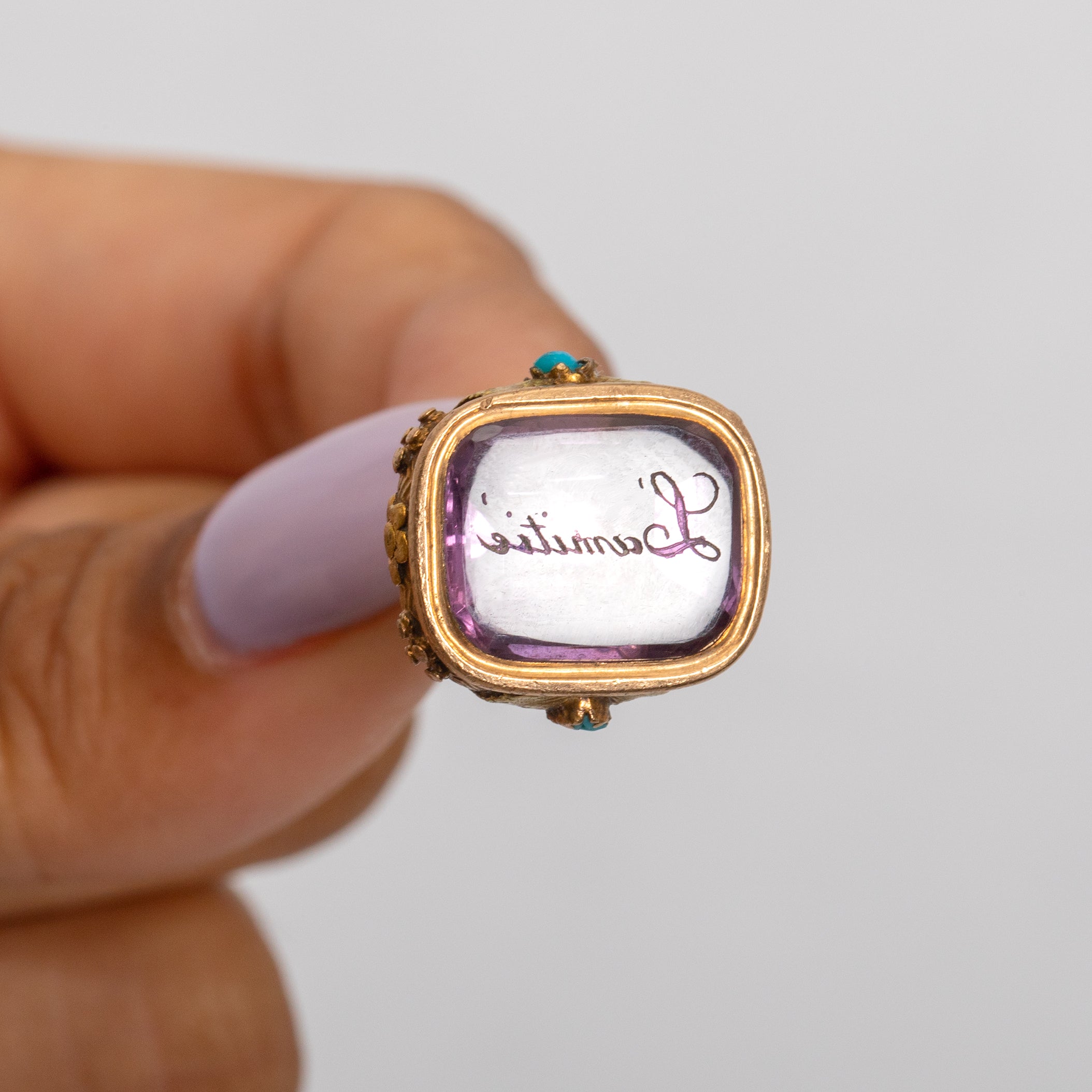 Georgian 18ct Gold Amethyst Fob with Garnet, Amethyst & Turquoise, 'L'amitié' - Friendship, 8.20ct Amethyst.