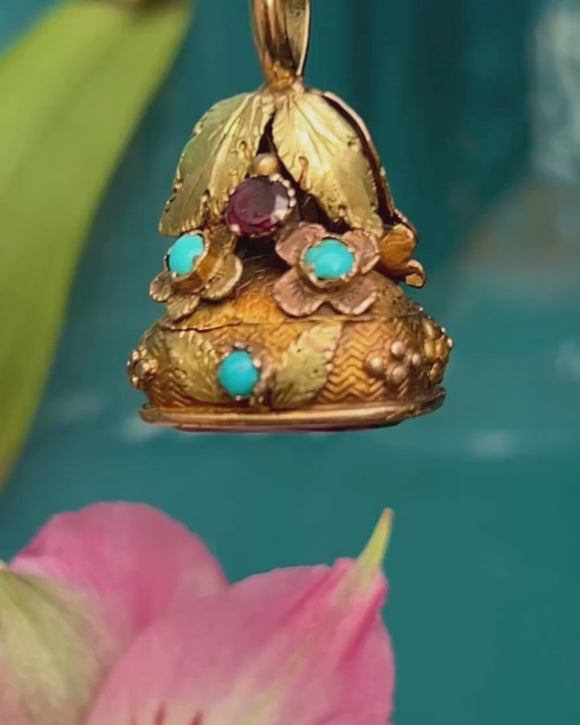 Crafted with exquisite artistry, this Georgian 18ct Gold Amethyst fob with Garnets and Turquoise embodies the essence of L'amitié - friendship. The captivating fob showcases a lustrous 8.20ct Amethyst at the bottom. This Gorgeous fob pendant features multi-colour Gold boasting green hues on the leaves and rosy hue on the flowers, making her unique!