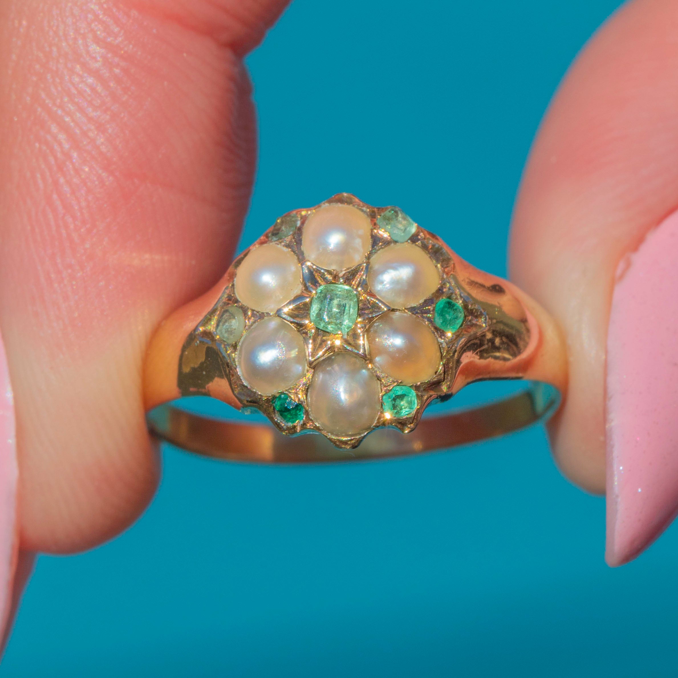 A Georgian 18ct Gold Emerald and Pearl star set cluster ring bursting with character!