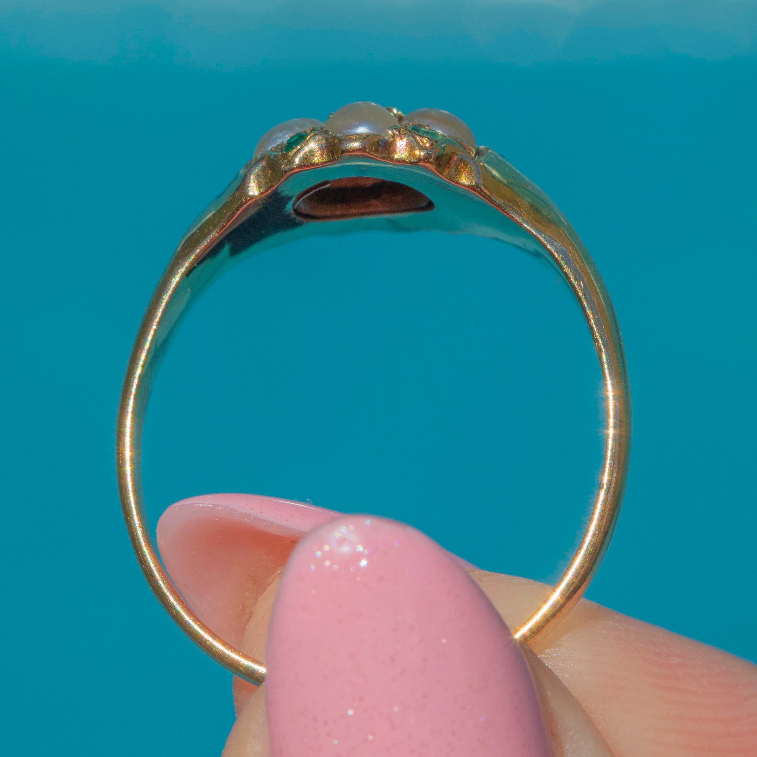 VERY GOOD: This Georgian 18ct Gold Emerald and Pearl star set ring is in very good condition. Each of her gemstones is radiant and set securely within their settings. There is evidence of a previous resize at the back of the ring where 9ct Gold has been used, leaving very minor discolouration, though this is difficult to spot and does not affect her wearability. In great condition, she is a must-have!