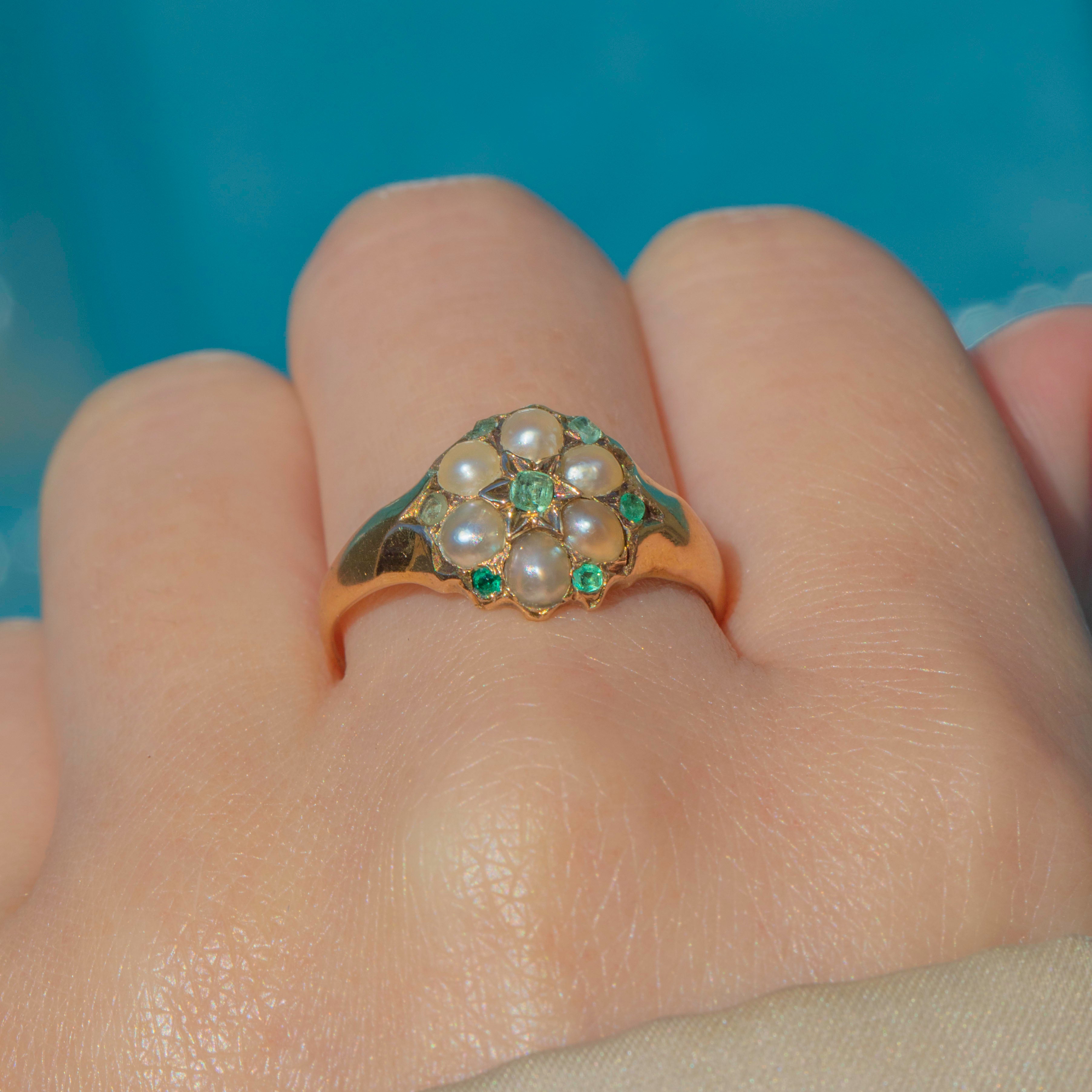 Comprised of six plump Pearls intertwined with seven radiant sage Emeralds, this Georgian cluster ring dazzles from every angle. Her buttery 18ct star settings give her an added celestial charm, with the glossy warmth of her Gold complementing the soft pastel gemstones.