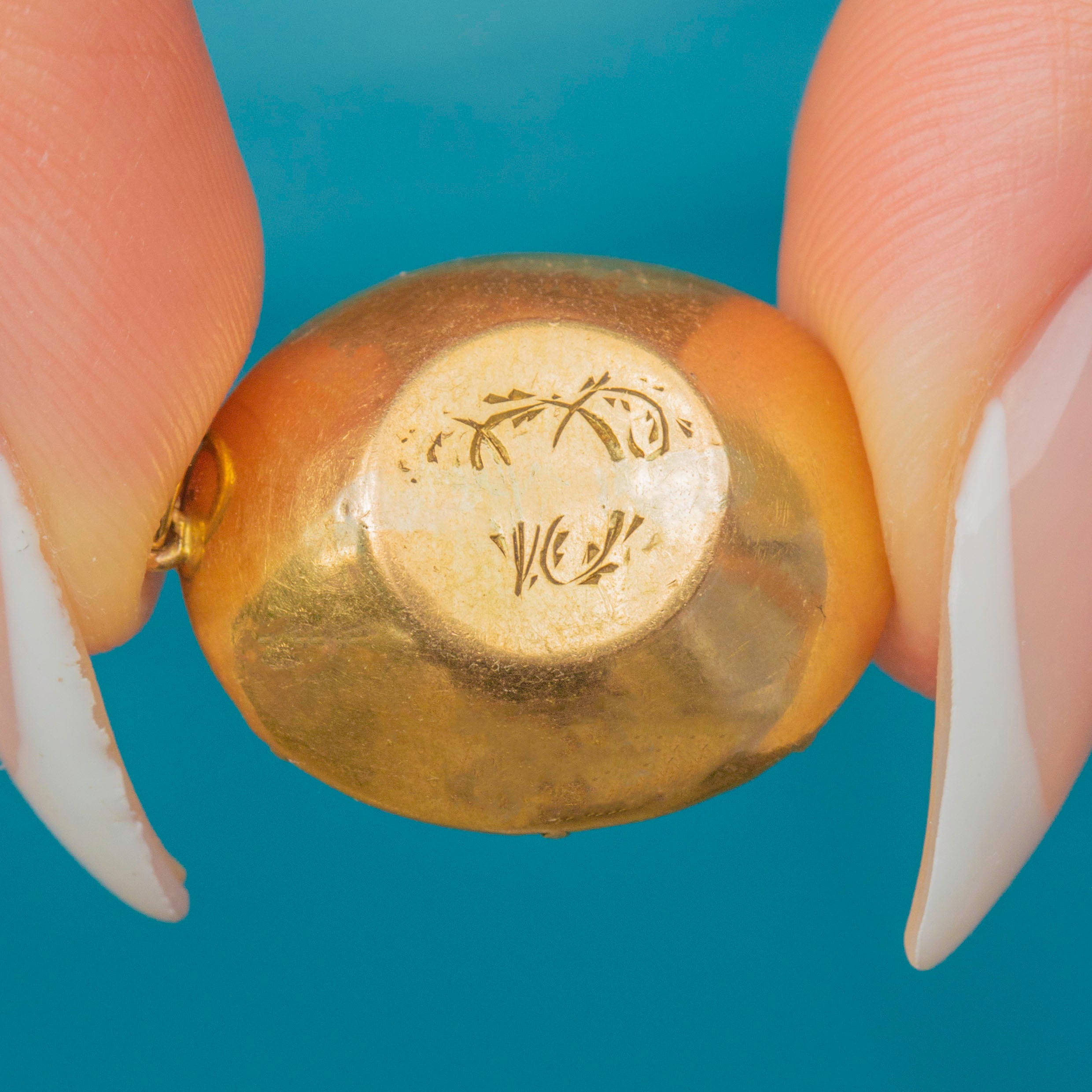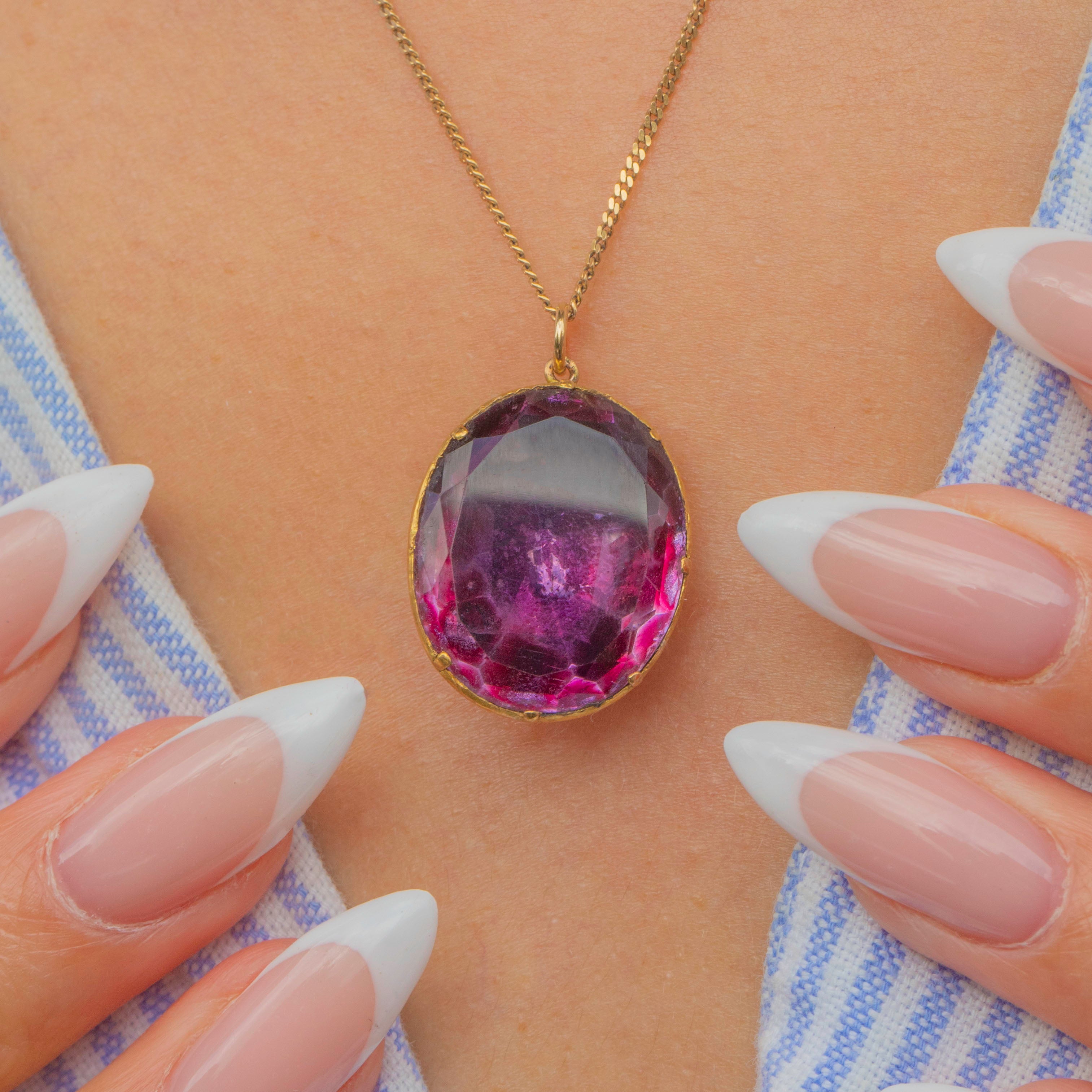 A luminous Georgian Amethyst pendant in rich 18ct Gold. The large, foil-backed oval Amethyst sits in a hand-made collet with neat claw tips, its magenta-purple glow enhanced by the original closed back. The reverse is engraved with a delicate monogram—pure period romance in wearable form.