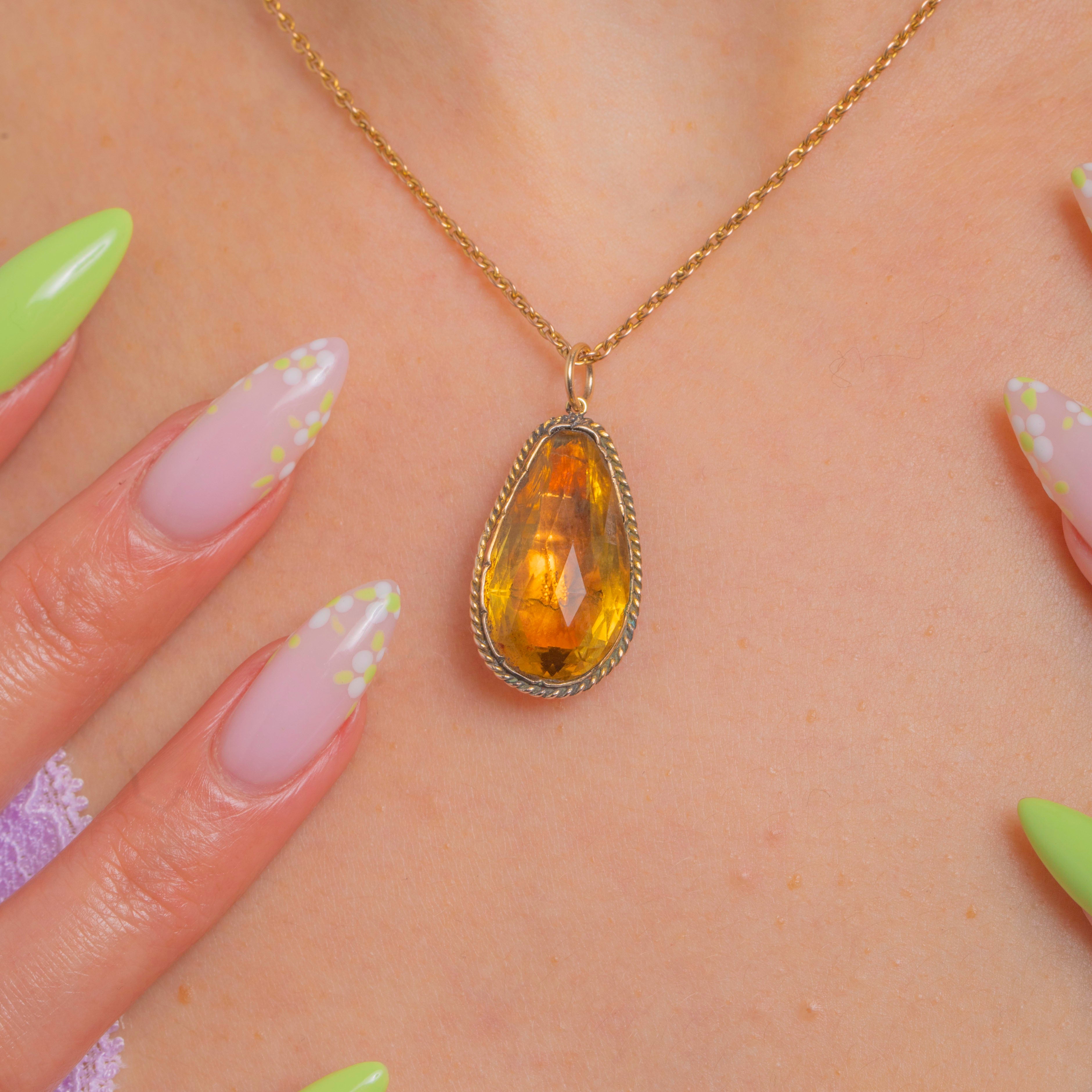 Ein leuchtender Georgian-Tropfen im Birnenschliff: Dieser bezaubernde Anhänger erstrahlt in dem warmen, honigfarbenen Ton, der in dieser Epoche so geschätzt wurde. Die folierte, silberhinterlegte Topas-Paste ist kunstvoll facettiert und fängt das Licht auf elegante Weise ein. Sie ruht in einer geschlossenen Zarge aus 9ct Gold und wird von einer gedrehten Kordelbordüre umrahmt, die dem Schmuckstück eine sinnliche Textur und zeitlose Romantik verleiht.