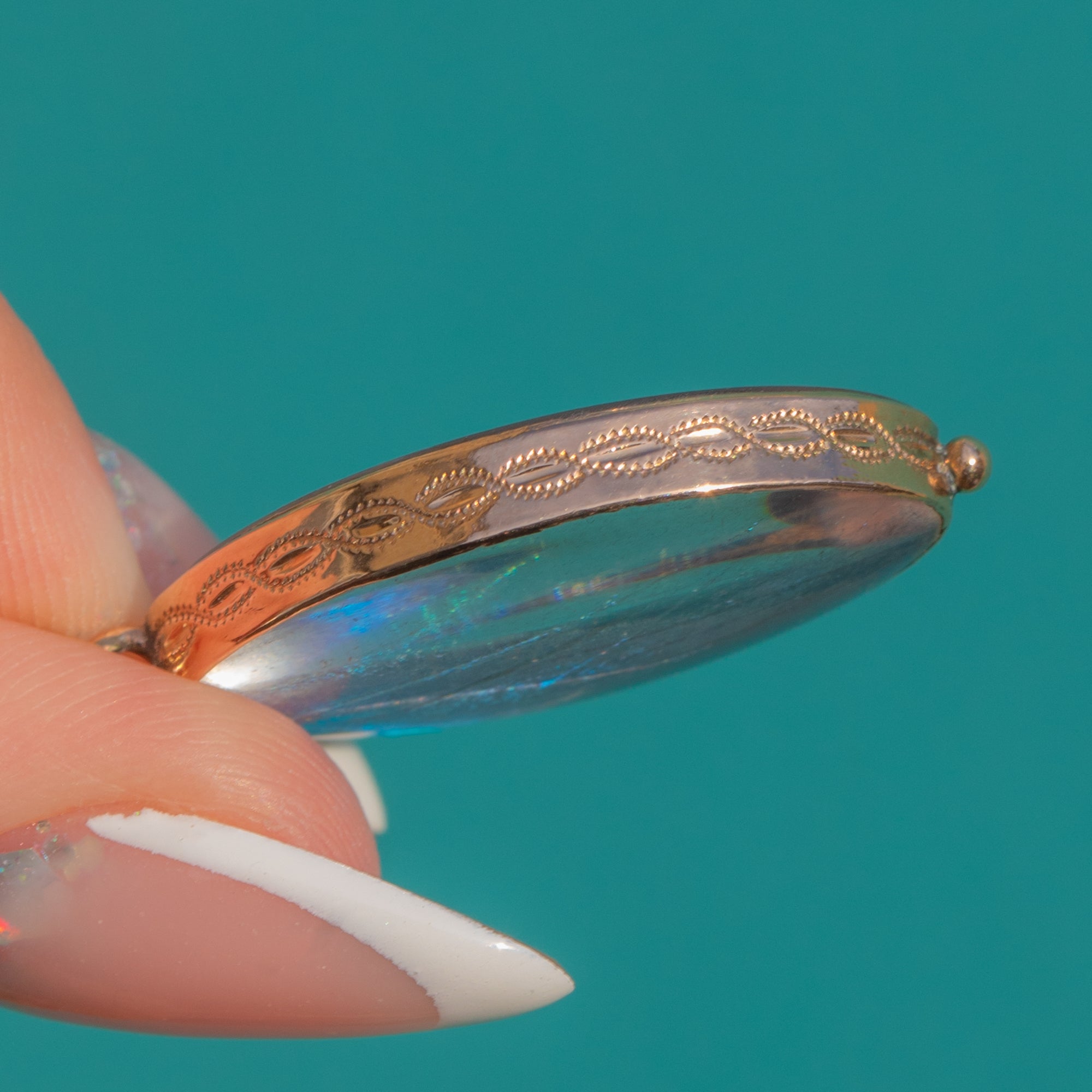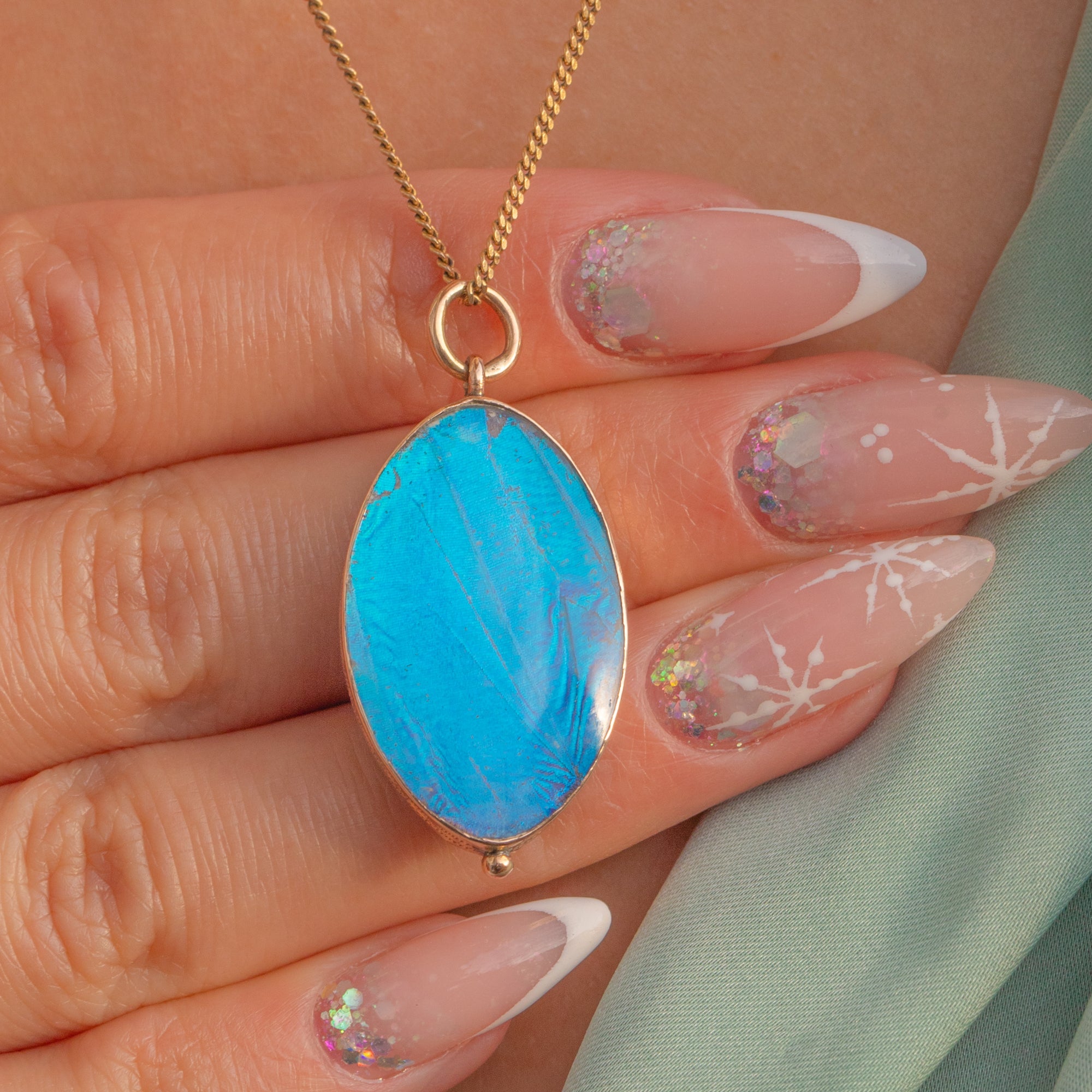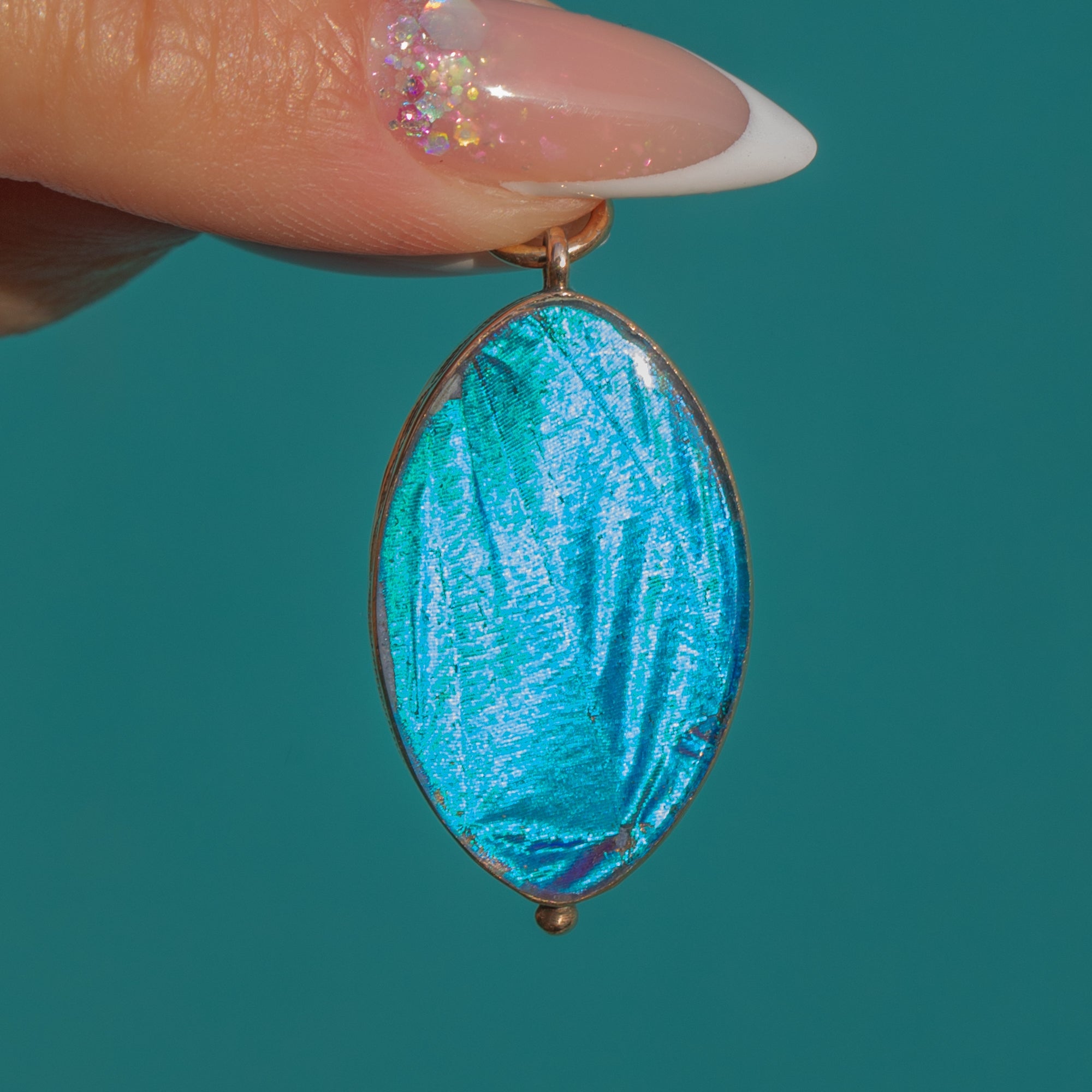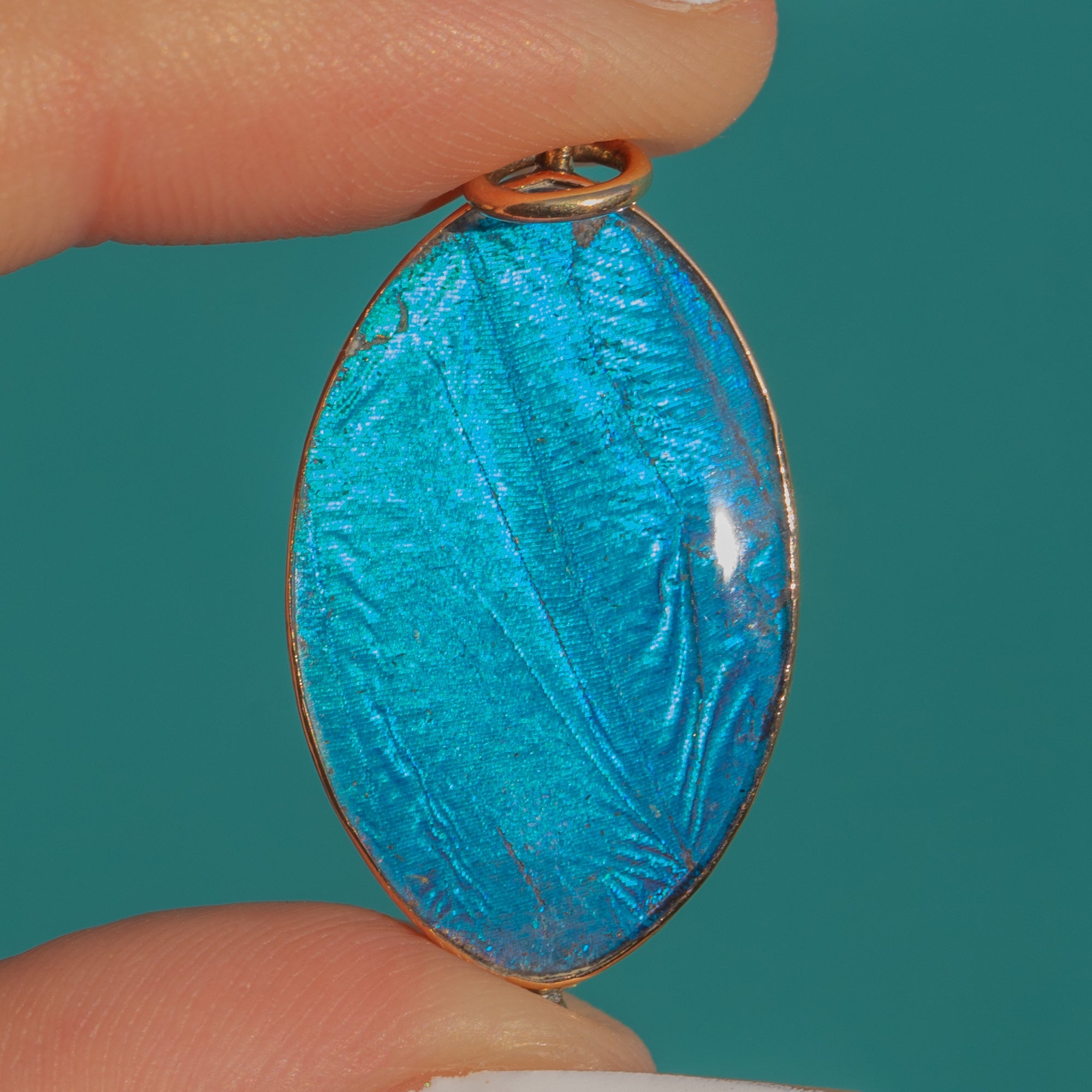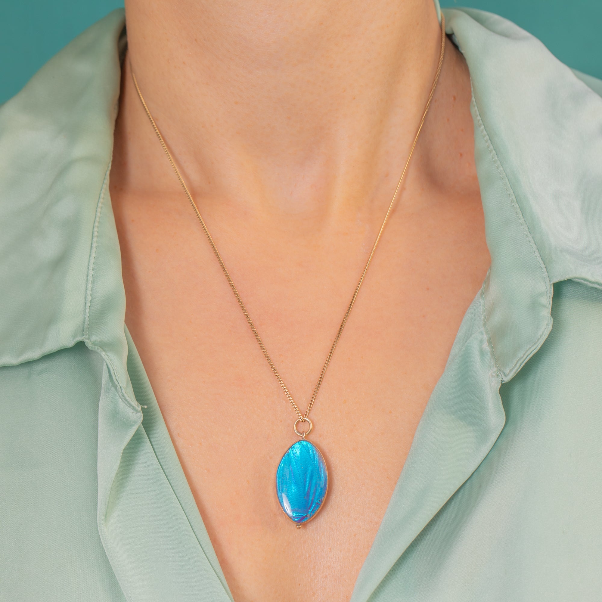 Set in a slender 9ct Gold bezel, this pendant is a classic example of early–mid 20th century butterfly wing jewellery, beloved for its ethereal, almost magical luminosity. The oval shape is flattering and elegant, and the colours are exceptionally vivid.