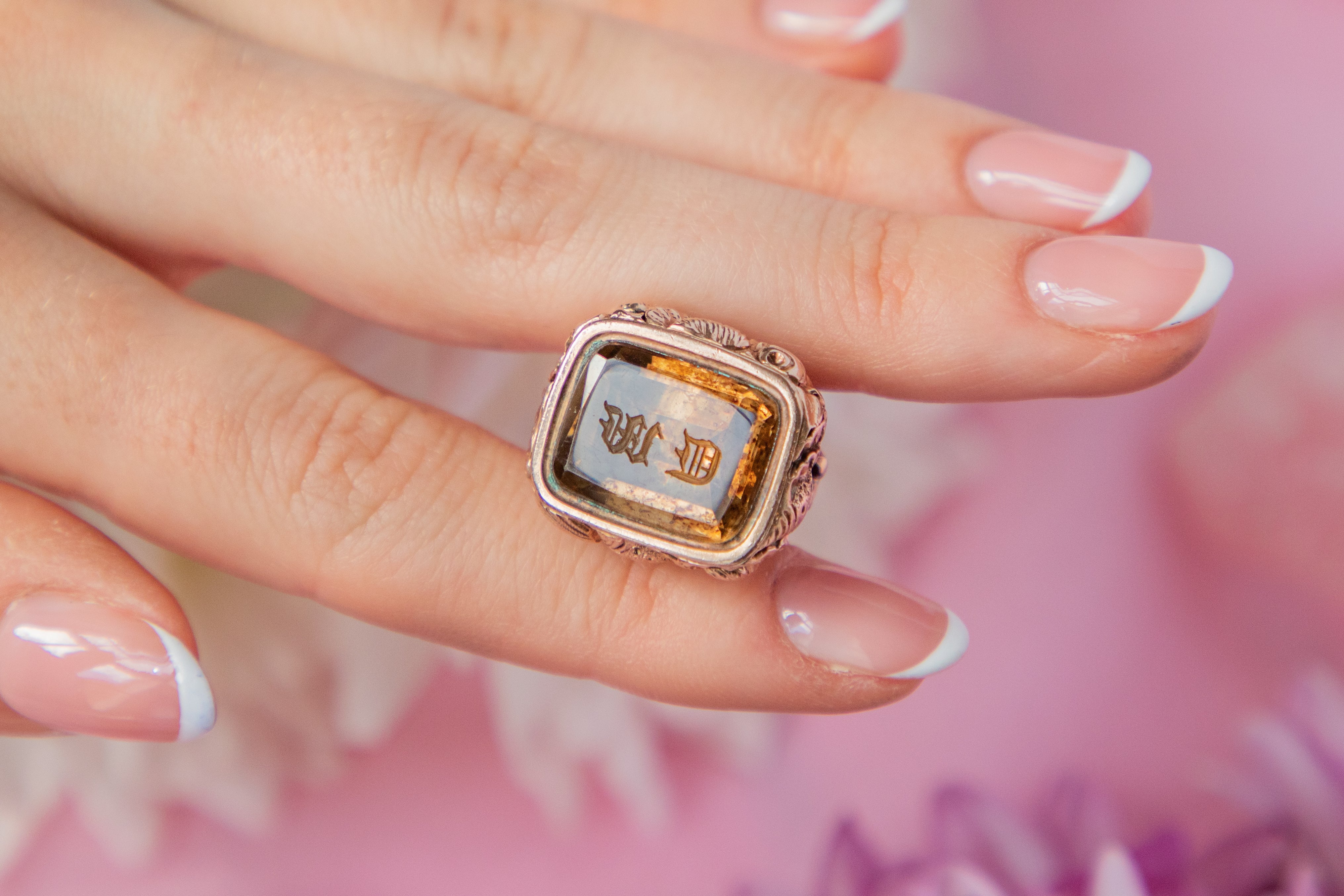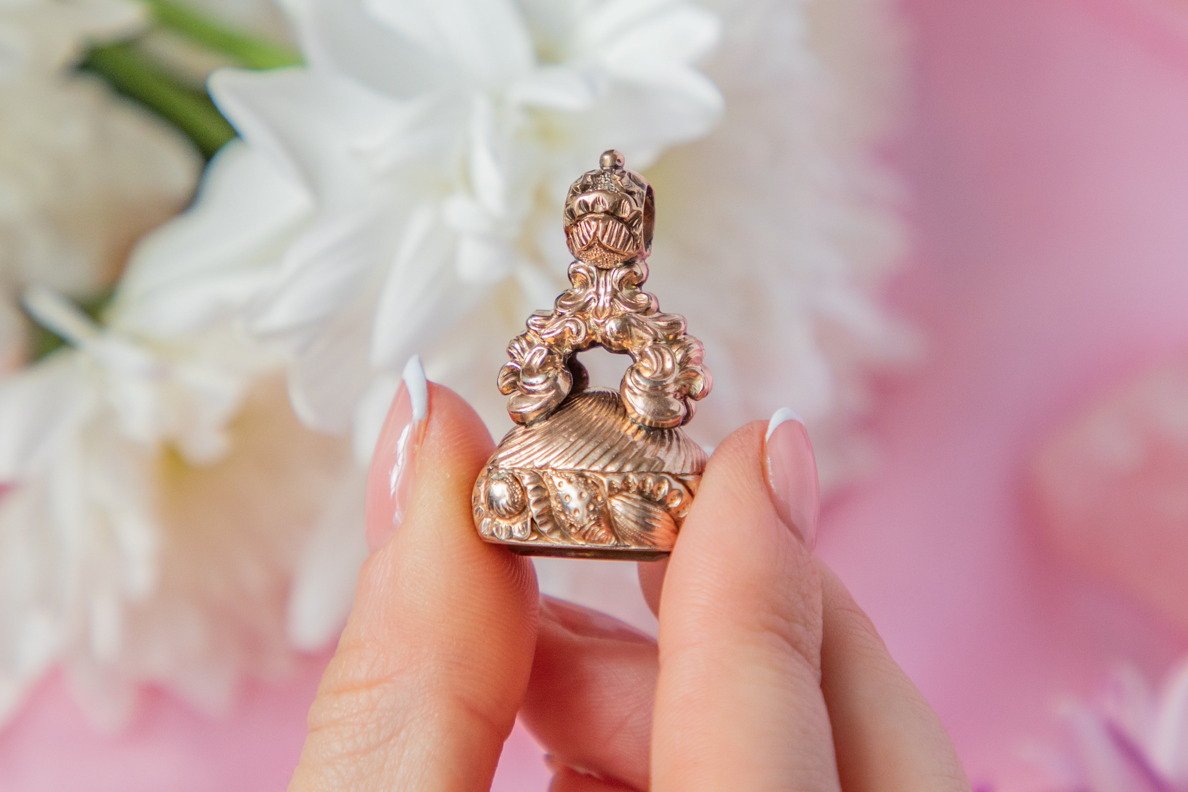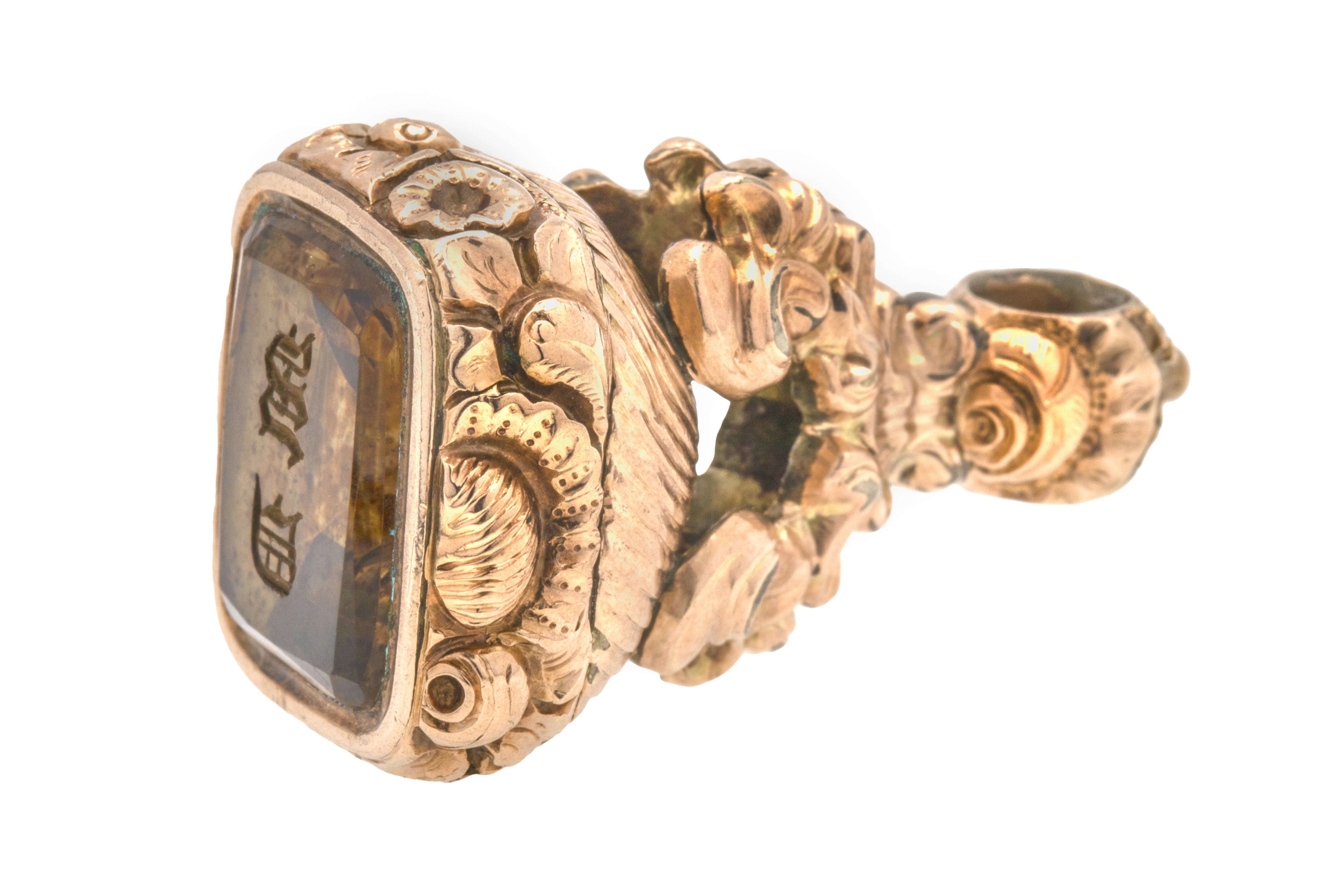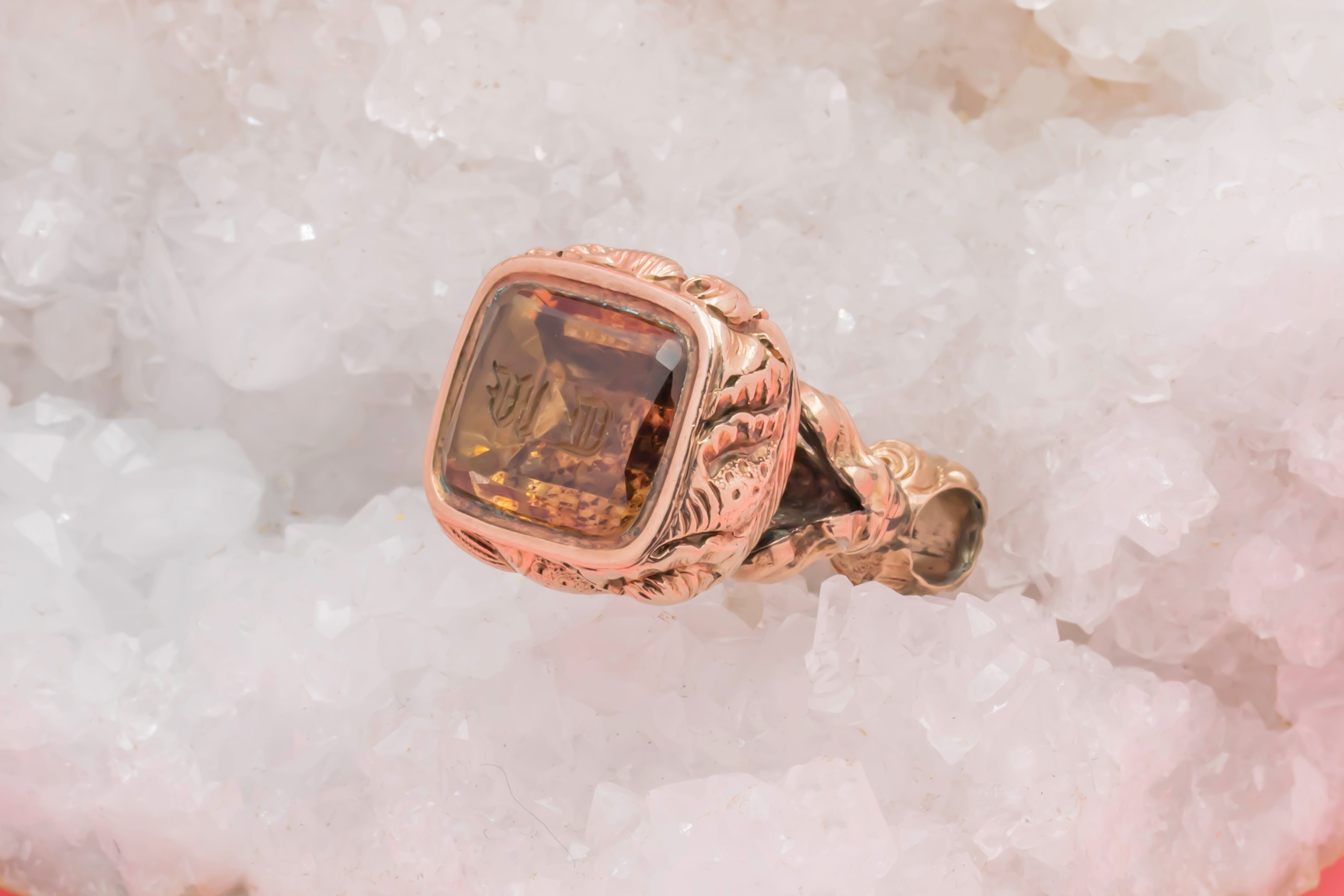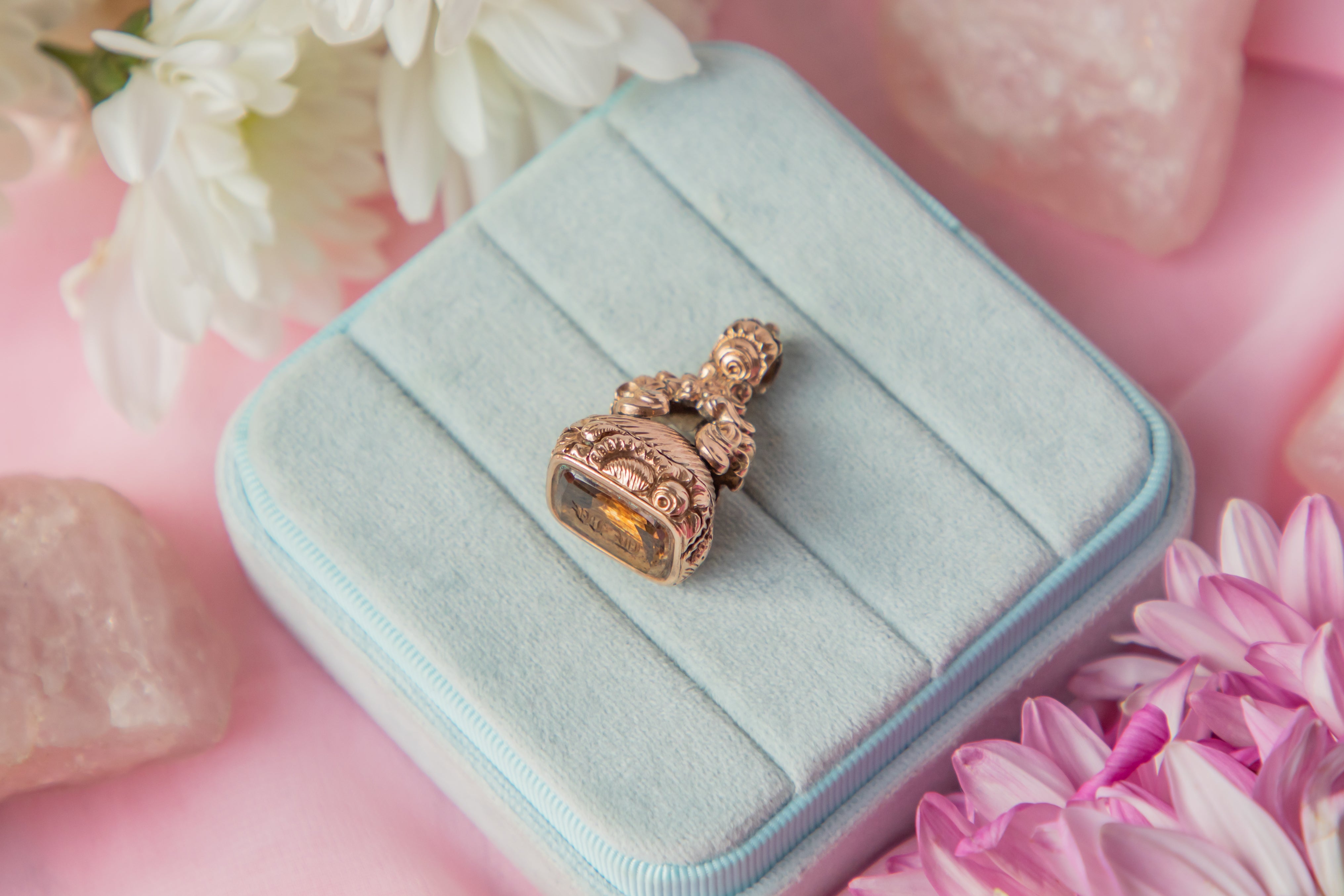 Make this Georgian 9ct Gold cased Citrine fob your newest muse. Finely crafted and intricately detailed, this Georgian fob beautifully encases a maple-hued Citrine gem engraved 'M' and 'D'!