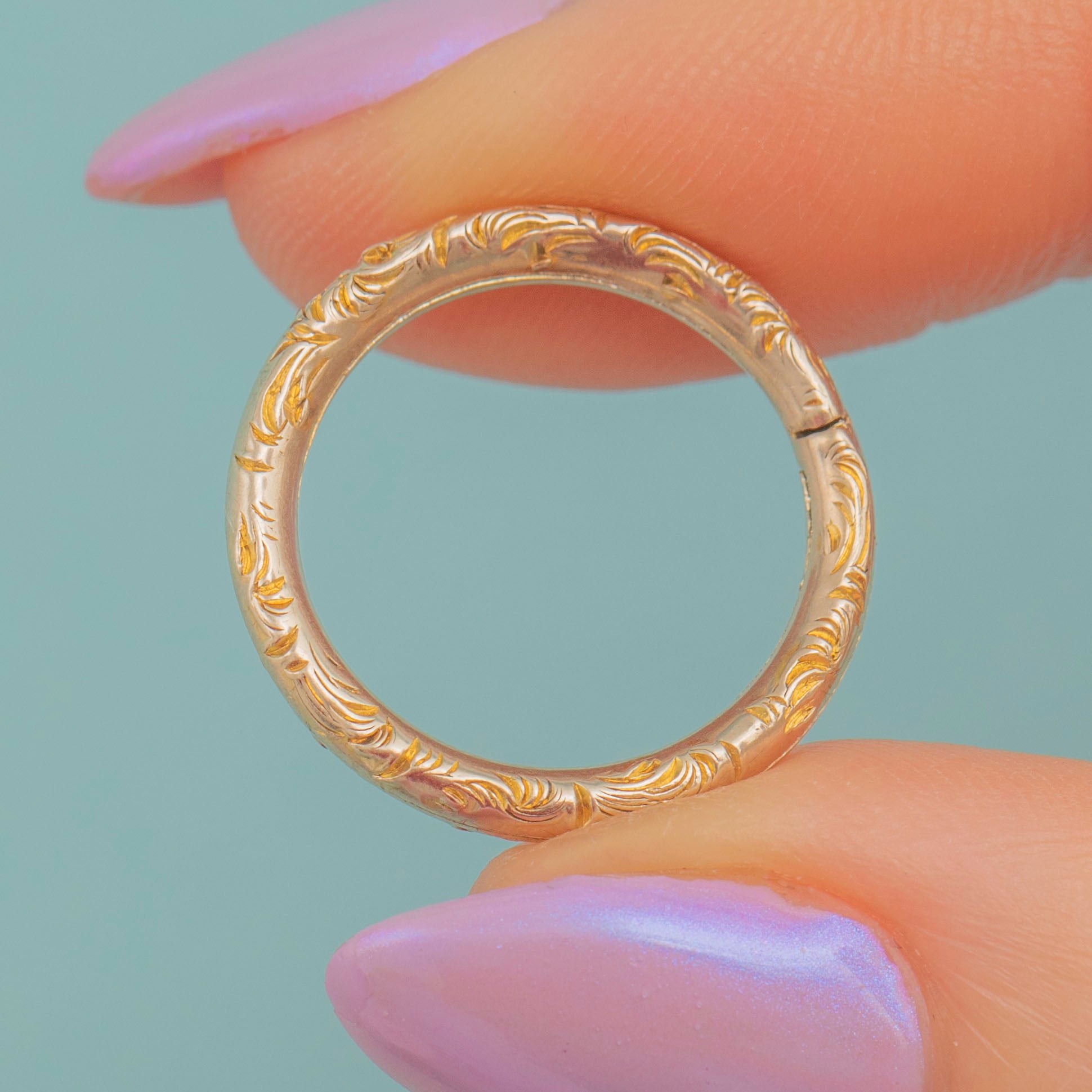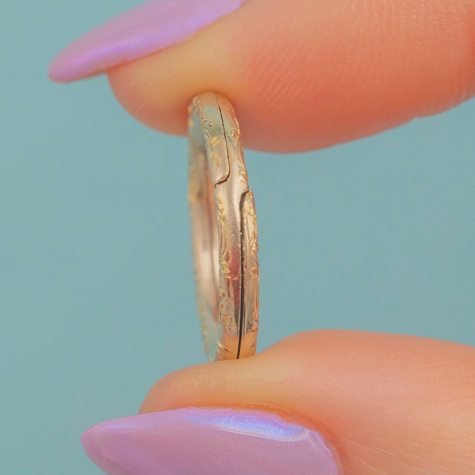 With a gorgeous buttery Gold hue and intricate engraved details covering its entirety, this Georgian split ring is brimming with antique character!
