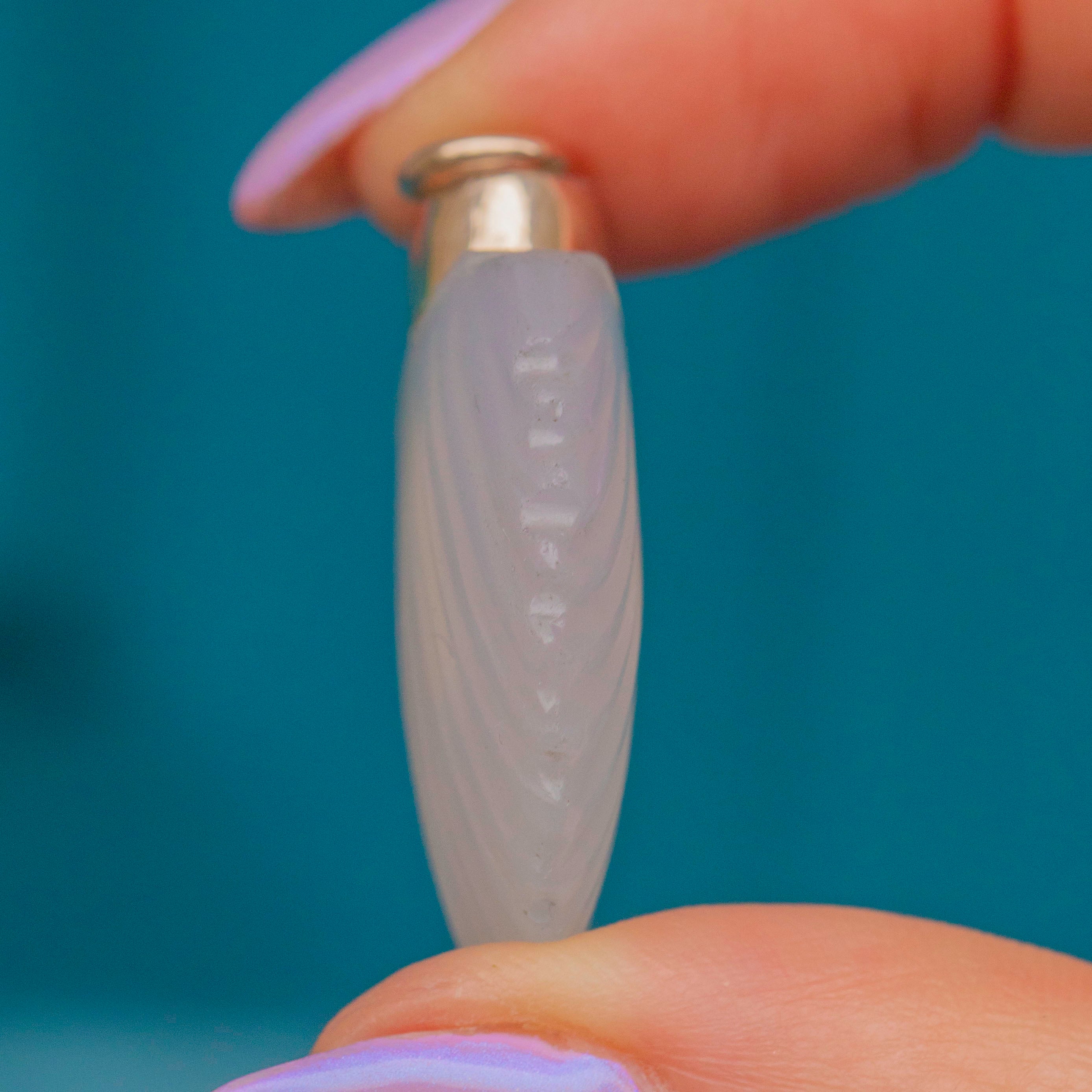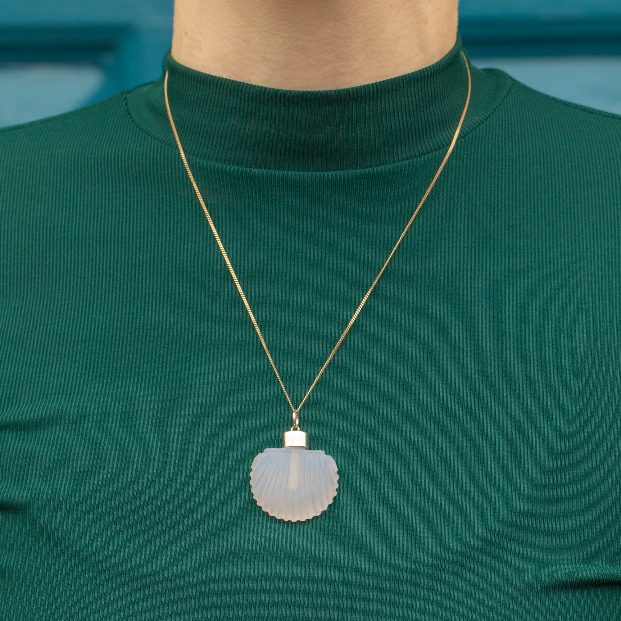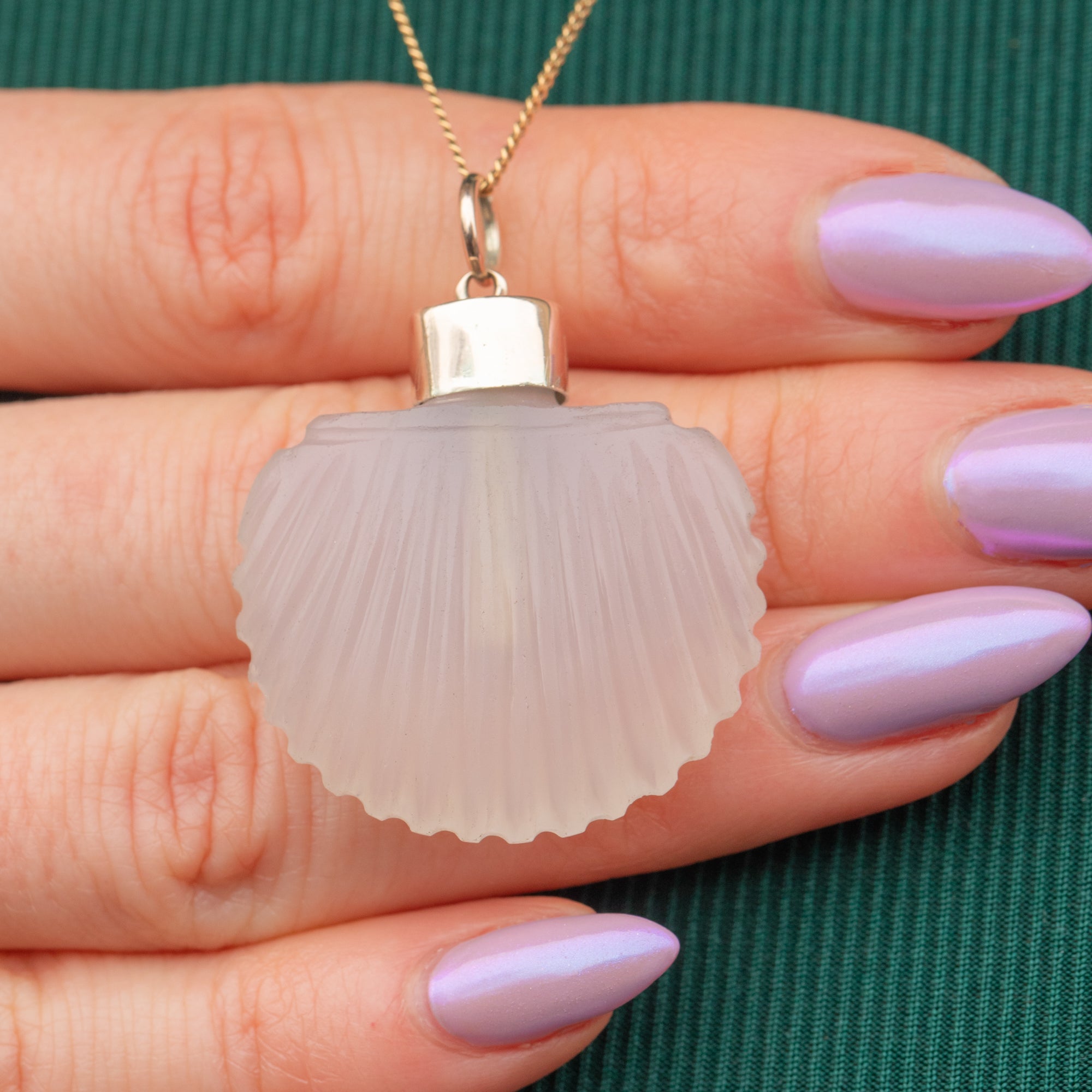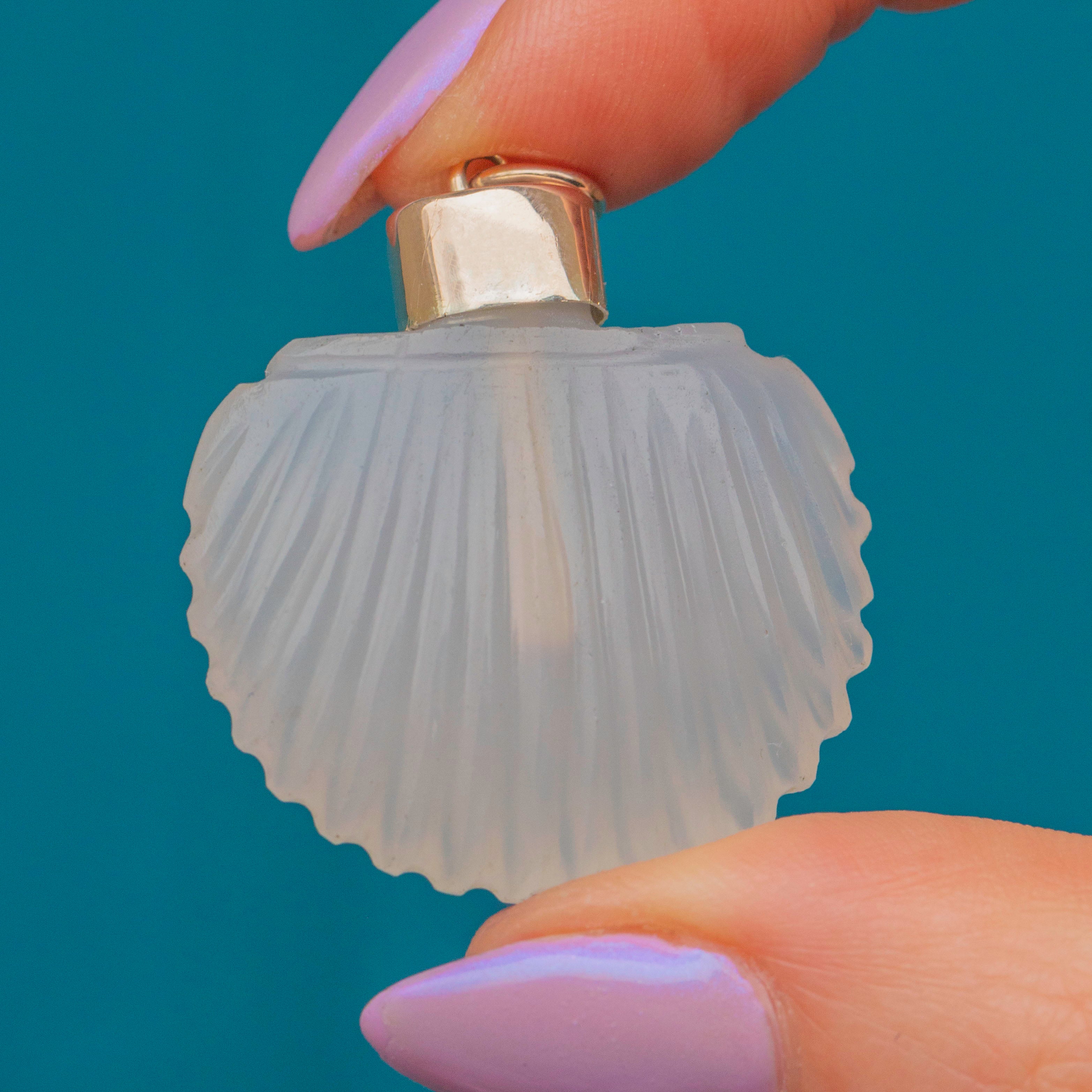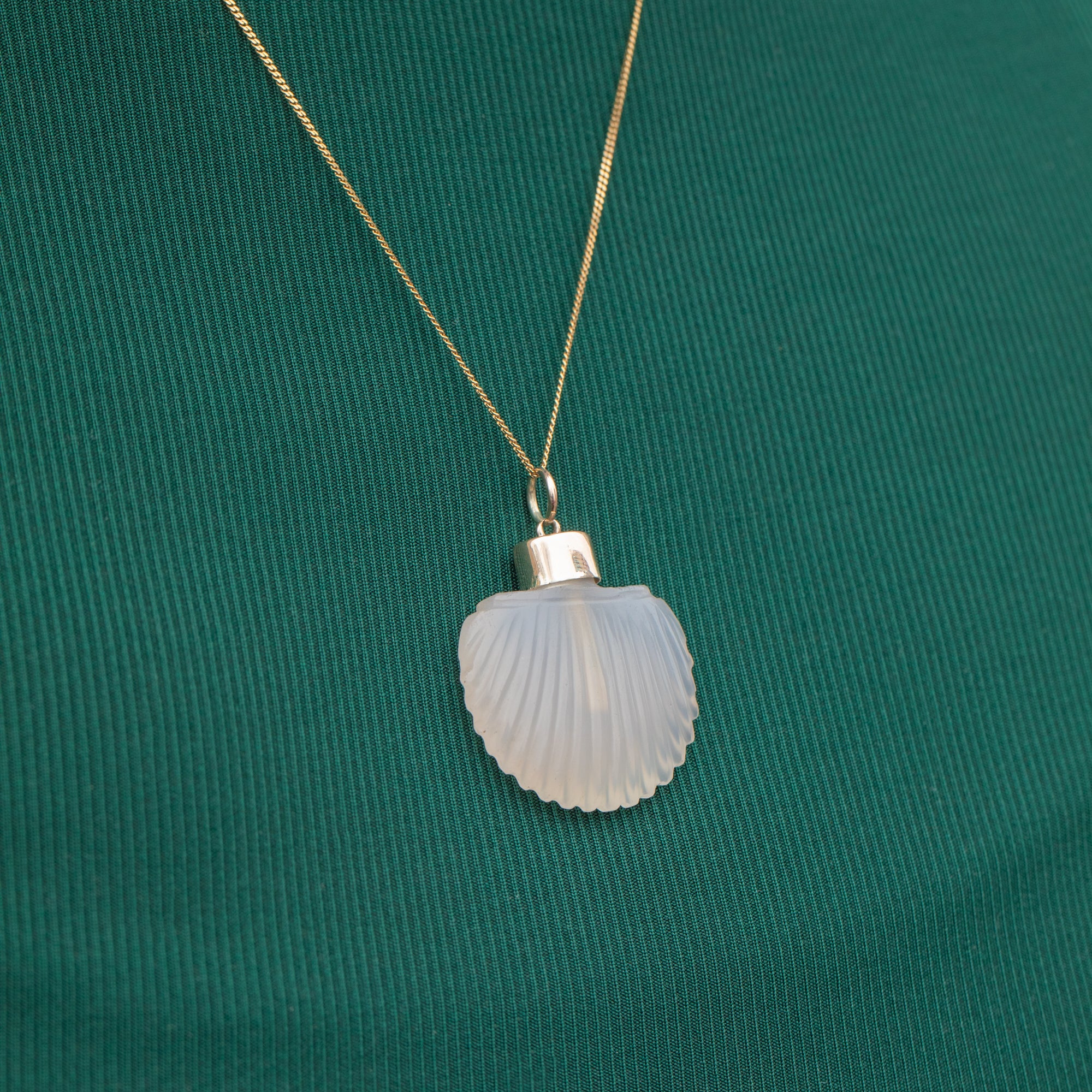 This Georgian 9ct Gold Chalcedony scallop shell scent bottle is adorable! Crafted from a gorgeous opaque Agate stone, this pendant is crafted beautifully with her shell engravings providing a lovely texture and depth.