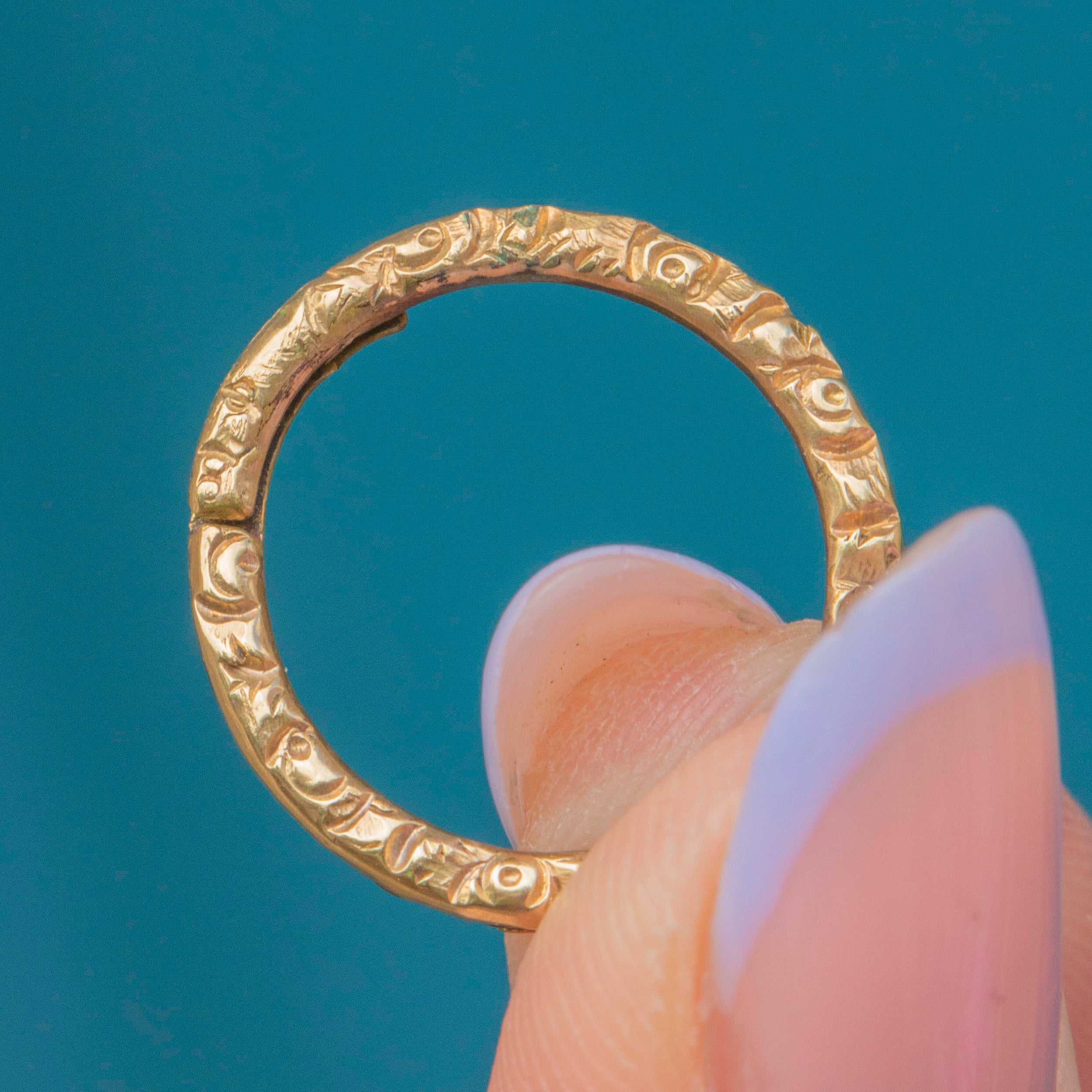 This is a lovely Georgian 9ct Gold chased split ring! Featuring stunning chased detailing adorning the entire circumference, this solid Gold split ring is the perfect antique piece for your collection.