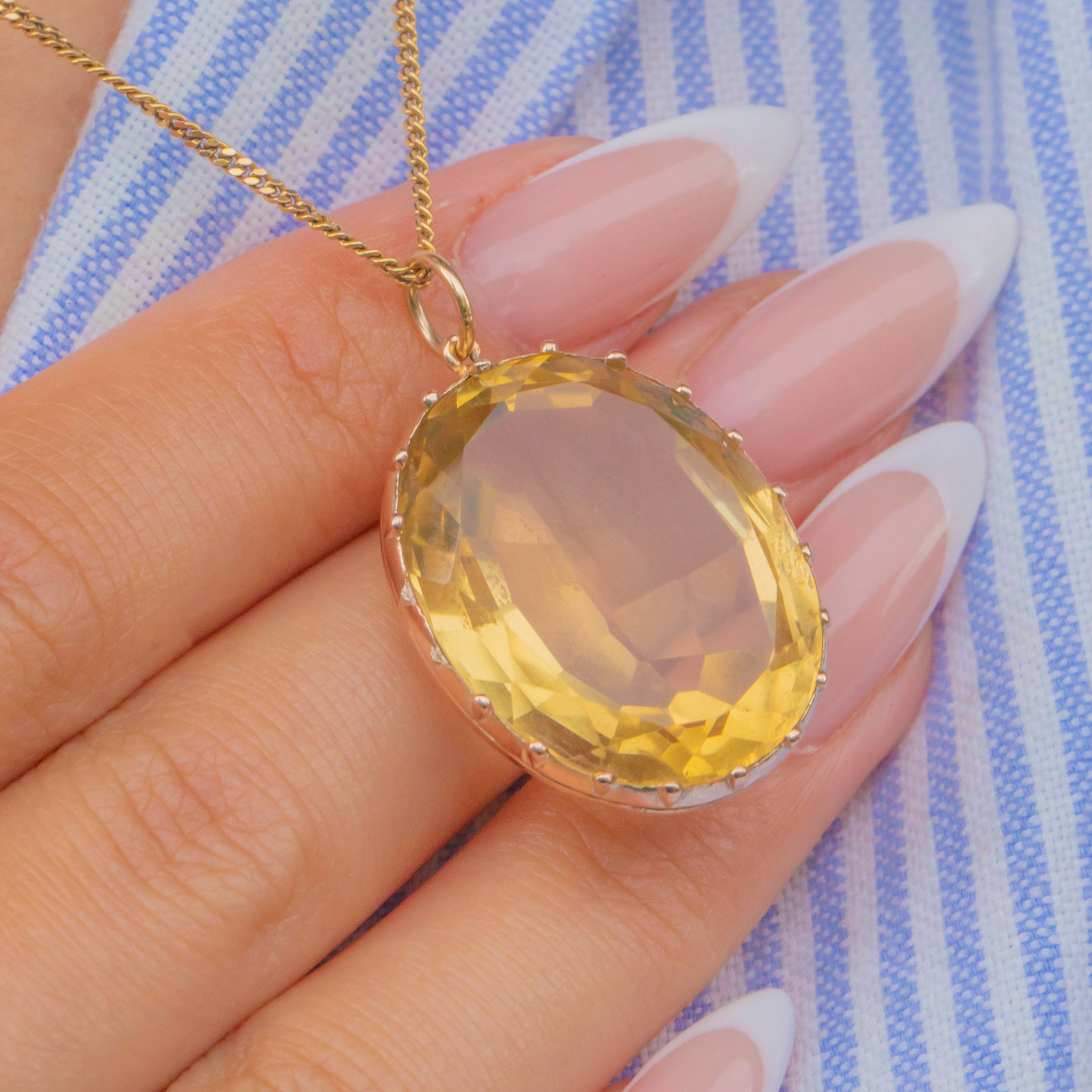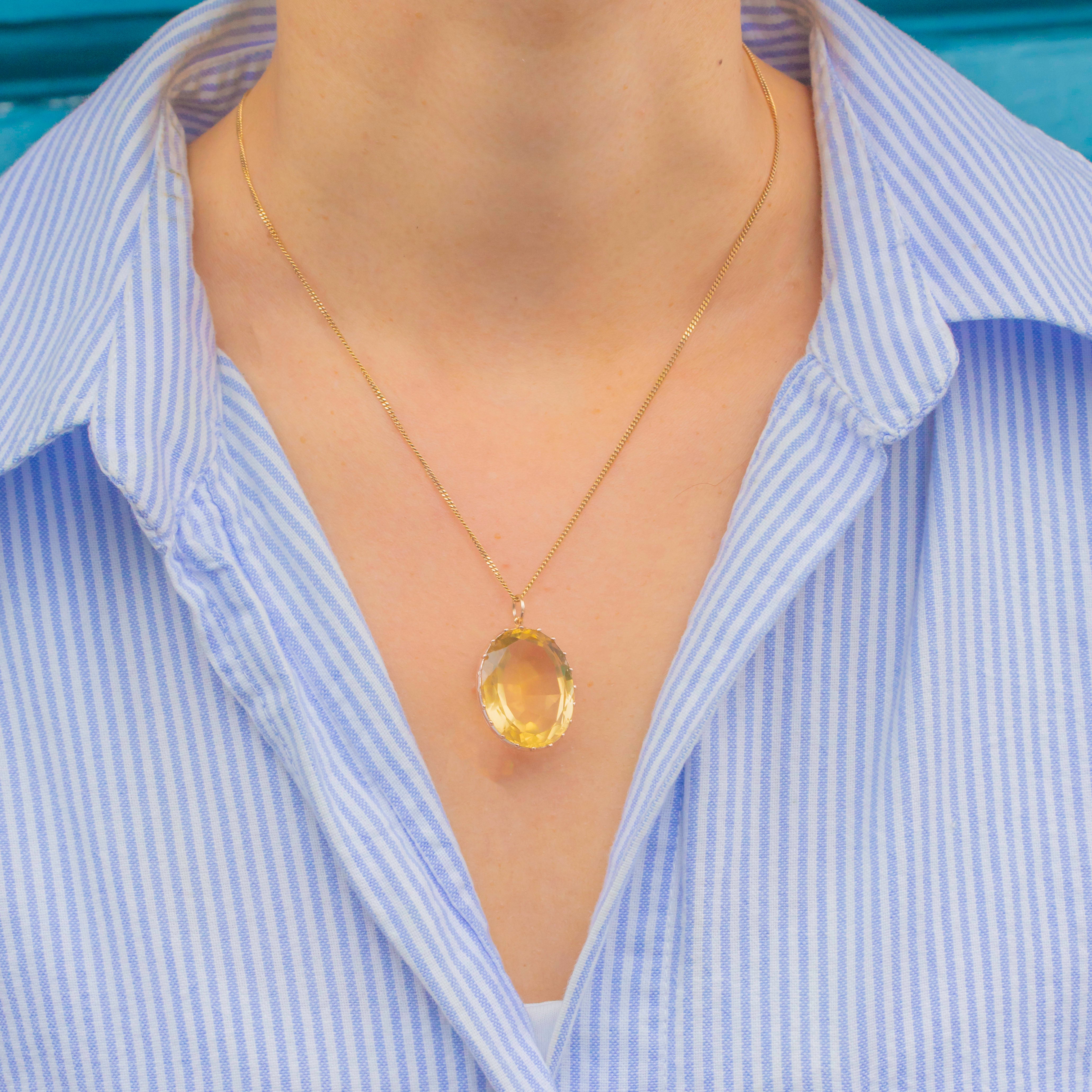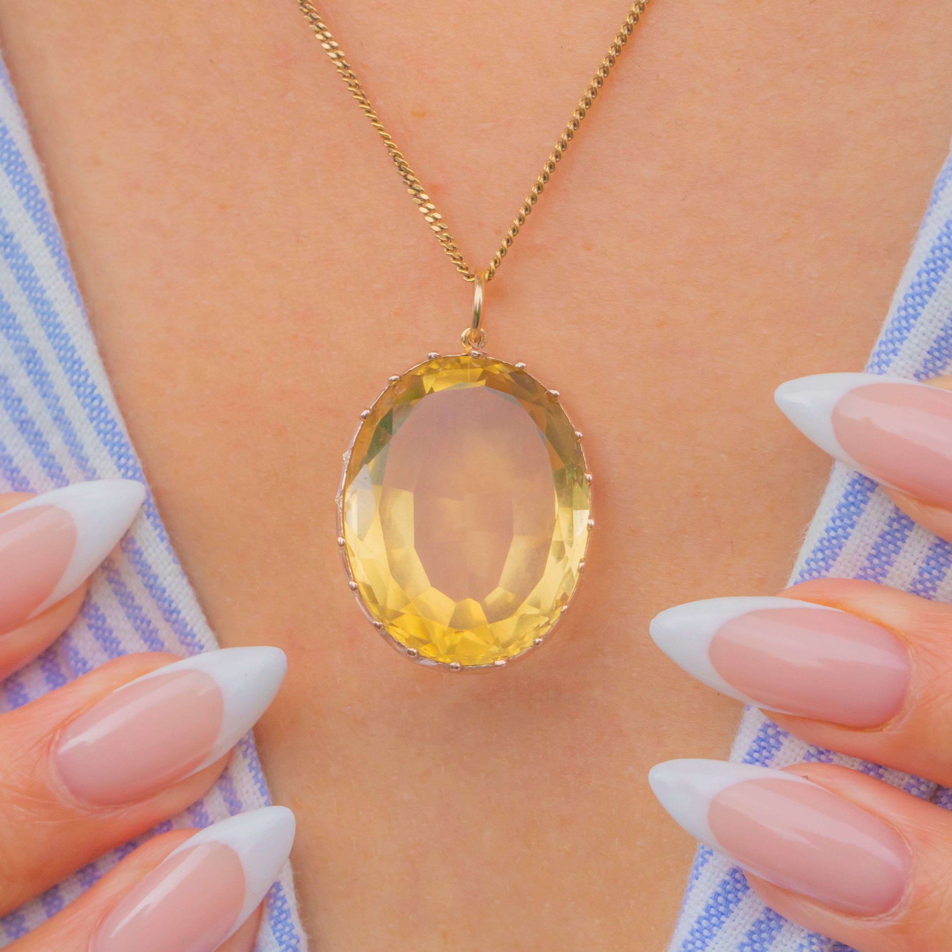 A radiant Georgian pendant showcasing a magnificent oval Citrine in warm, sunlit hues. The gemstone’s broad table and crisp, hand-cut facets deliver a lively play of light, beautifully framed by 9ct Gold claws for a bold yet elegant statement.