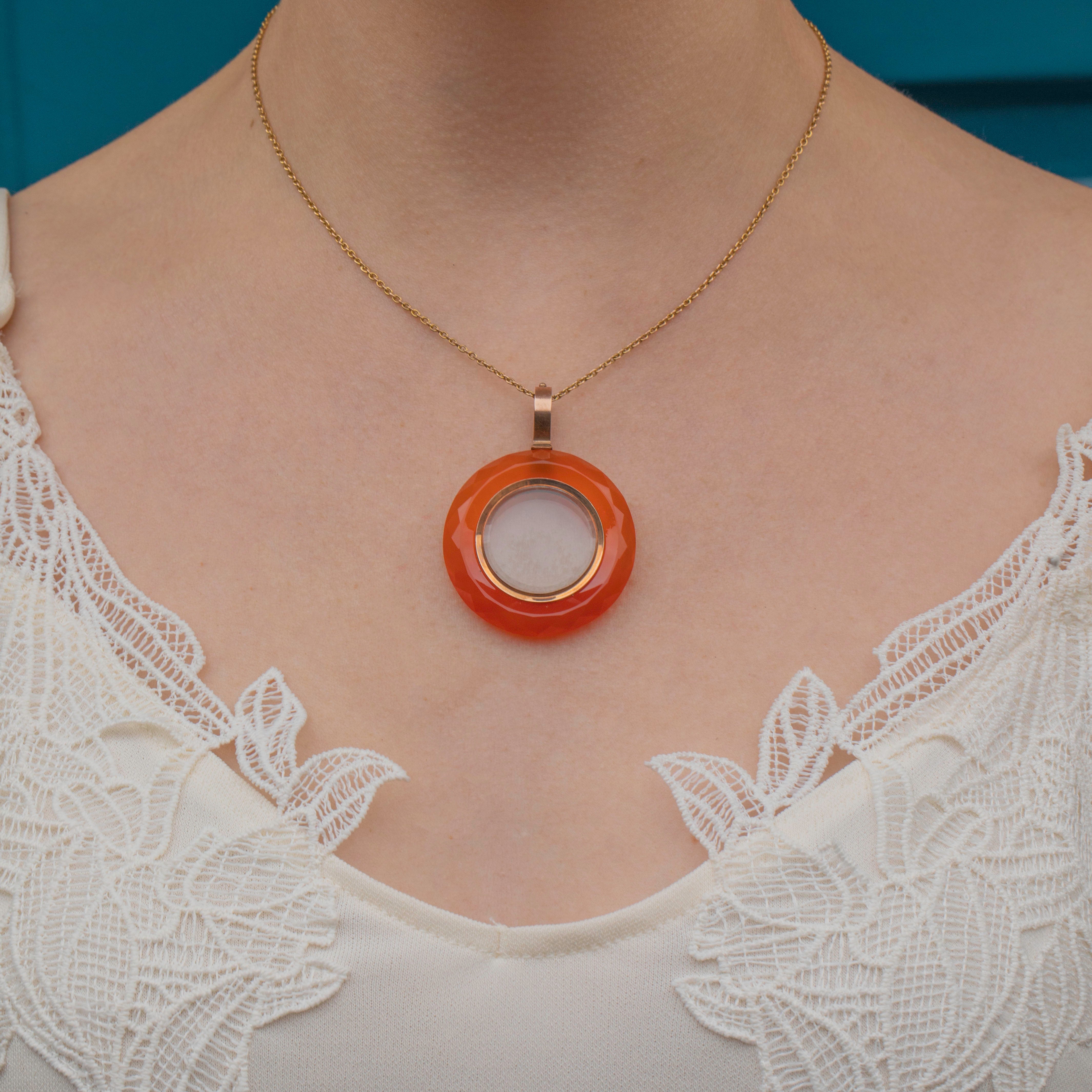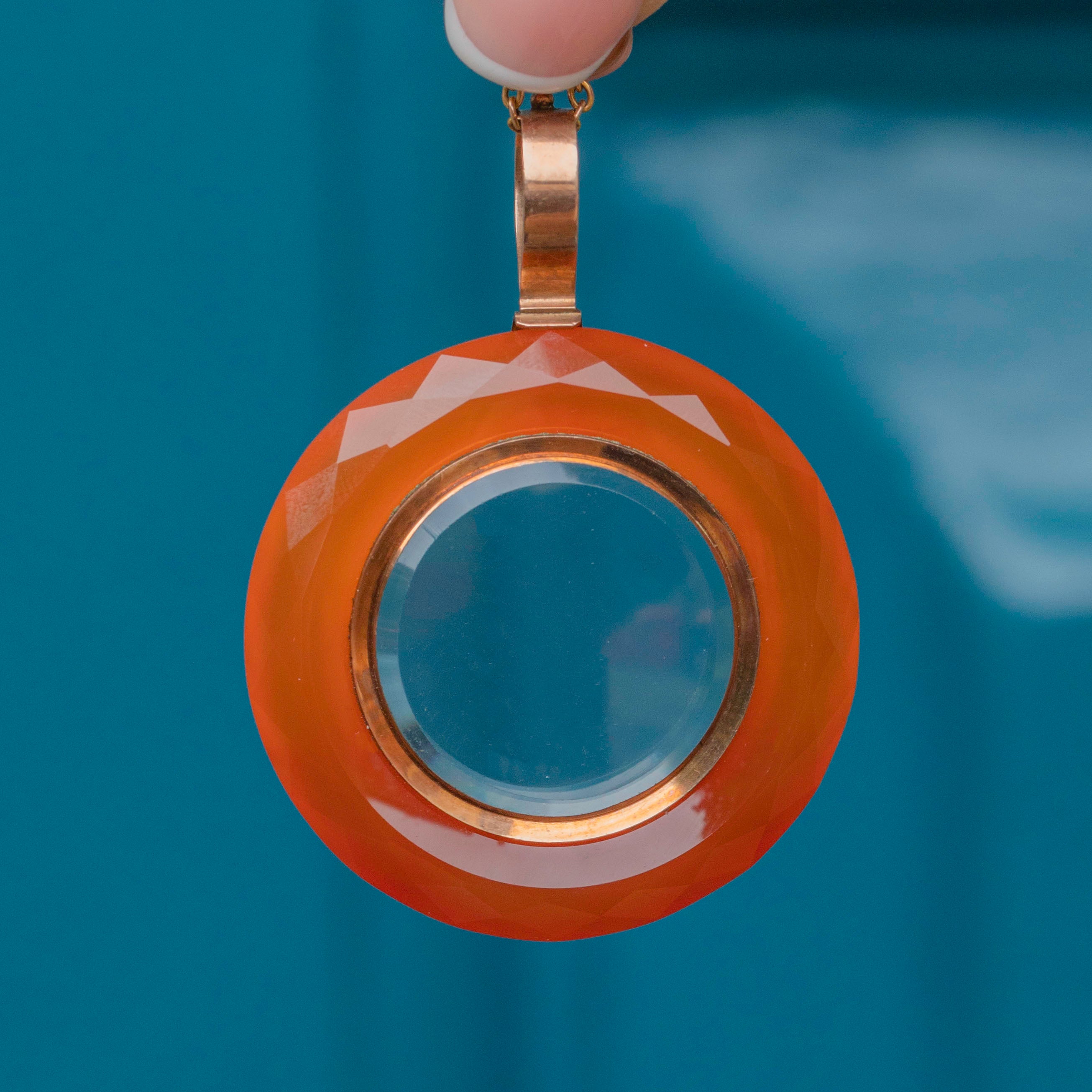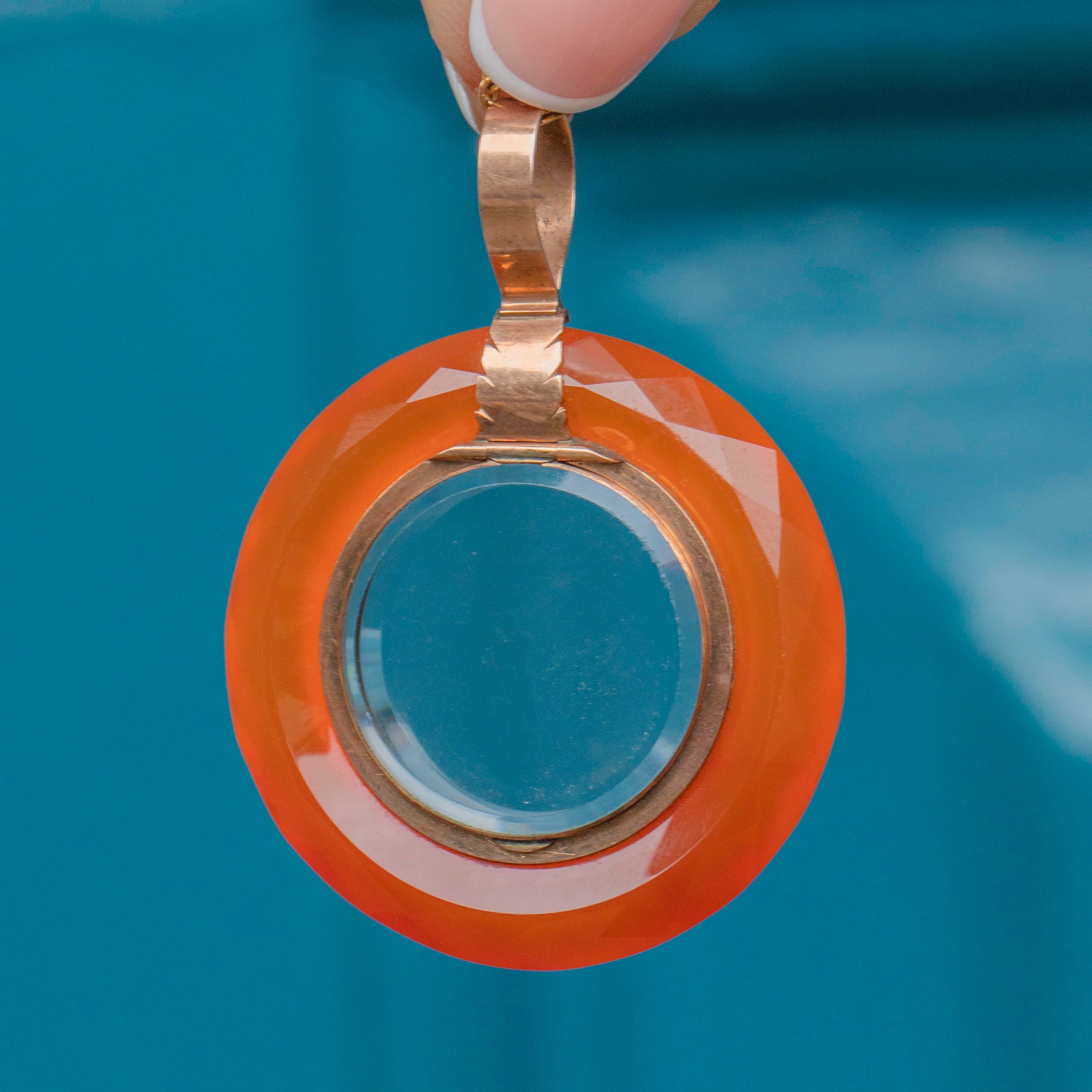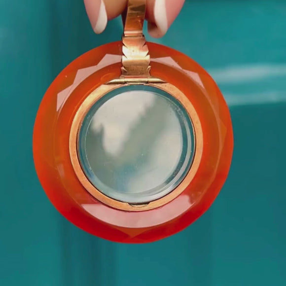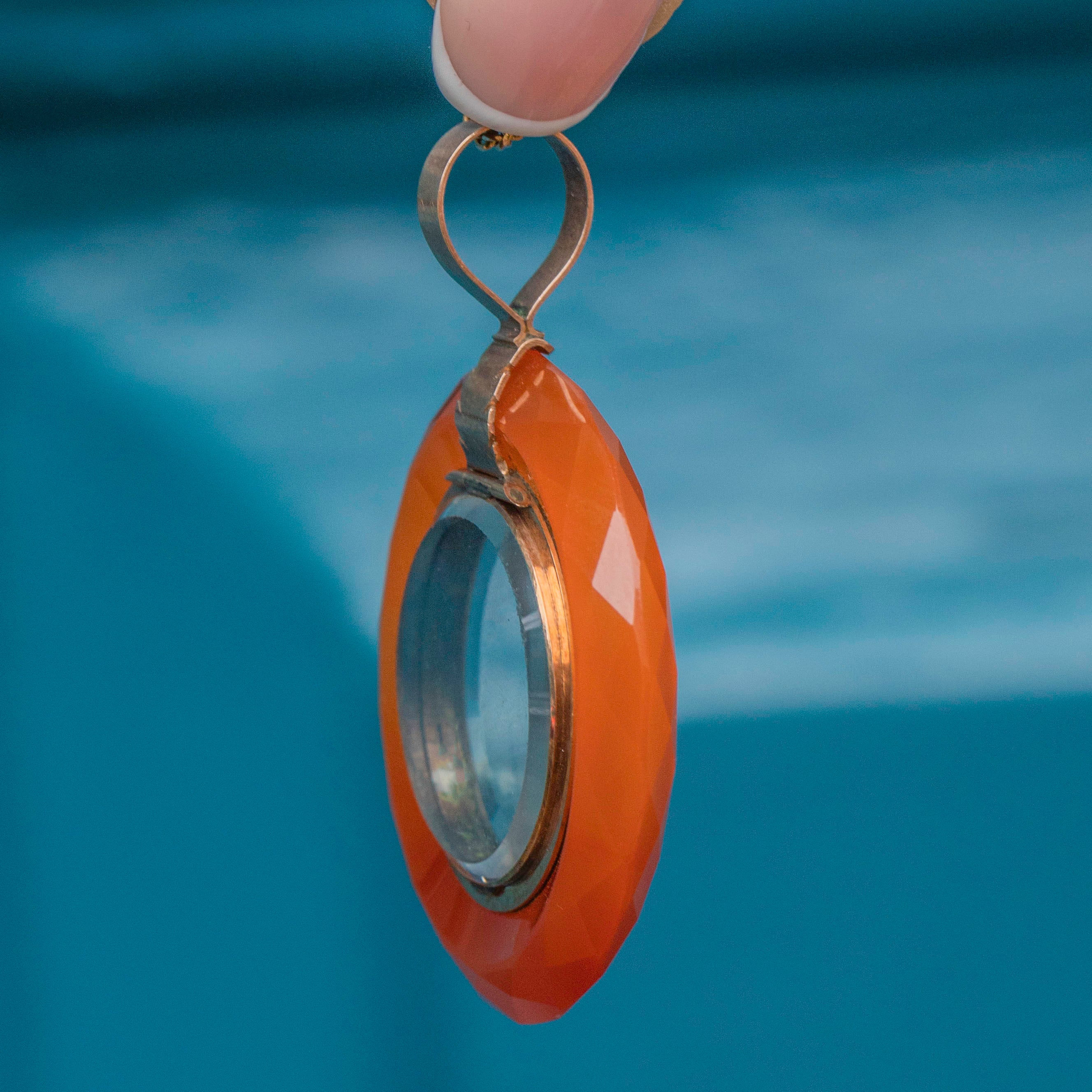 EXCELLENT. This Georgian 9ct Gold faceted Carnelian locket is in excellent condition. The Carnelian has been beautifully faceted and is free from any signs of wear. The locket has retained both glass panels, and the door opens to allow for the lucky owner to place photos, flowers, or gems inside! The bale has some minor discolouration but it has remained sturdy and will securely suspend from a chain of choice. This unique Georgian locket will make a coveted addition to your collection!