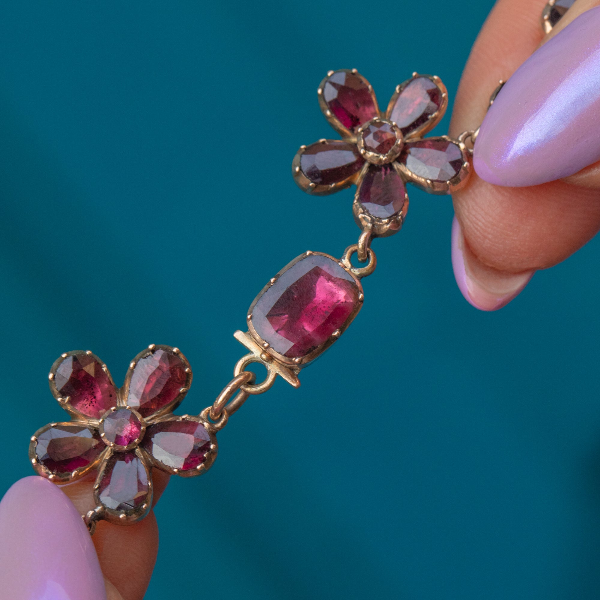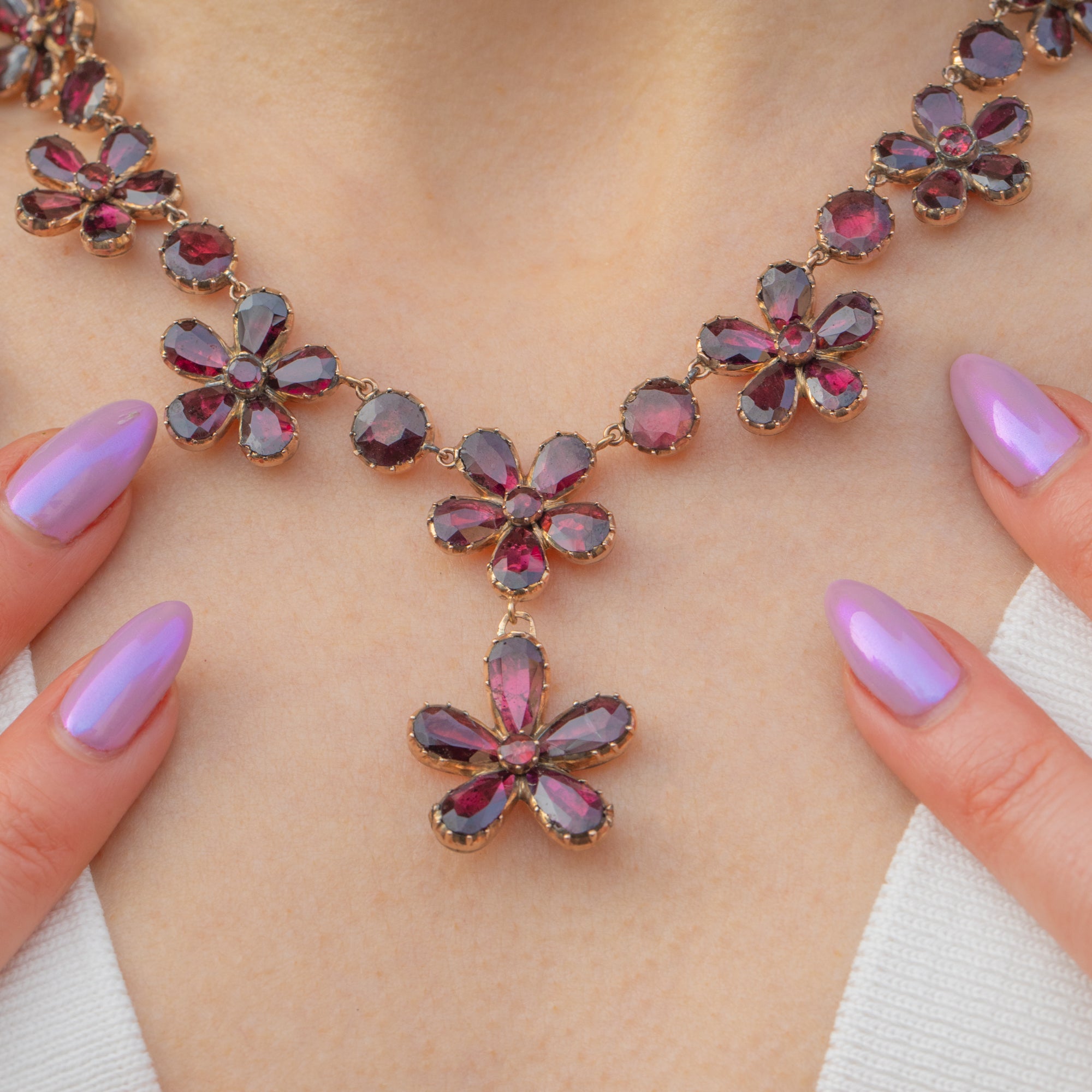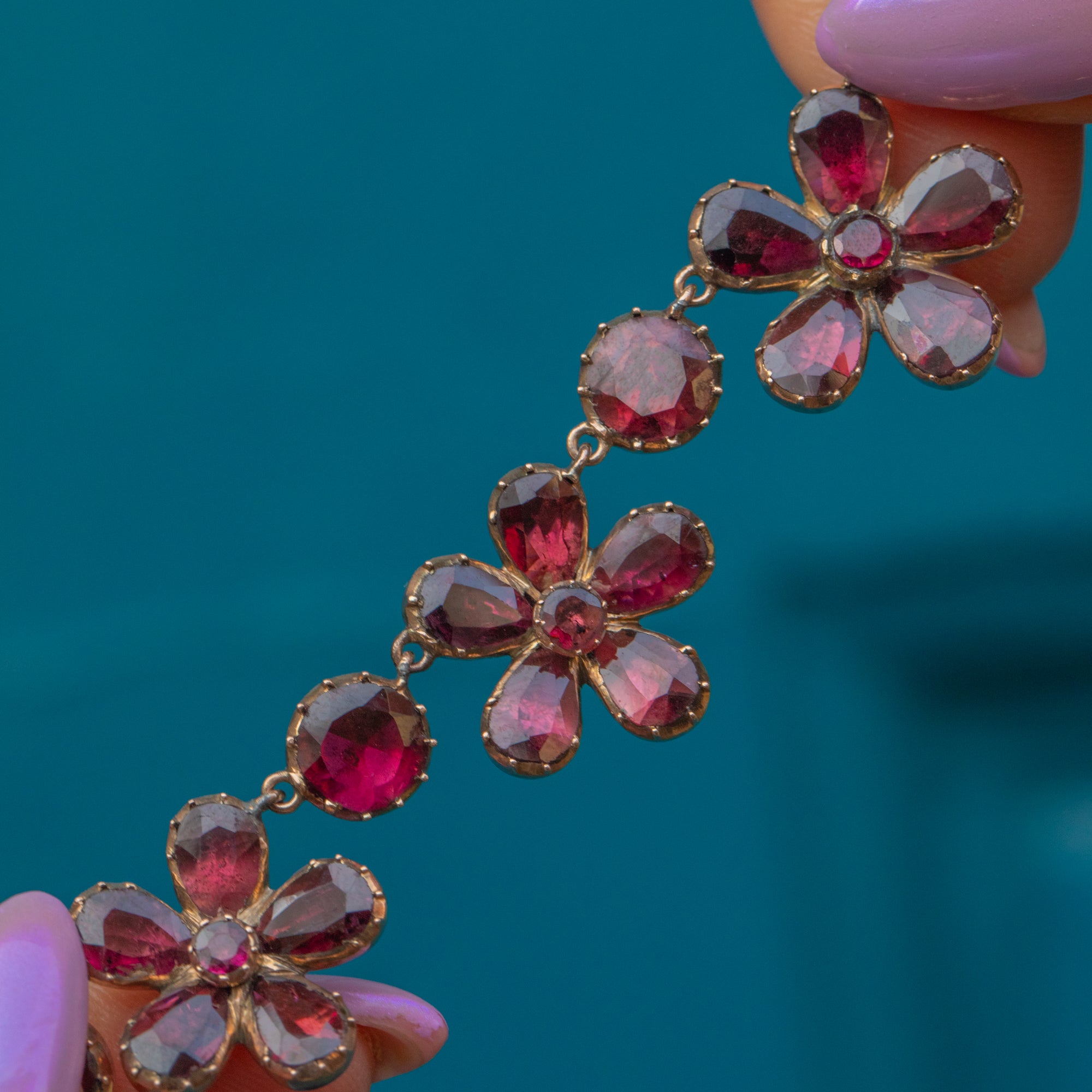 Featuring 18 graduating Garnet pansies, which boast an impressive 19.60ct combined, this antique necklace is rich in colour and saturation, with each Garnet radiating juicy deep fuchsia and plum hues. They are set within warm 9ct Gold settings, providing a lovely lustre and warm finish to this antique beauty.