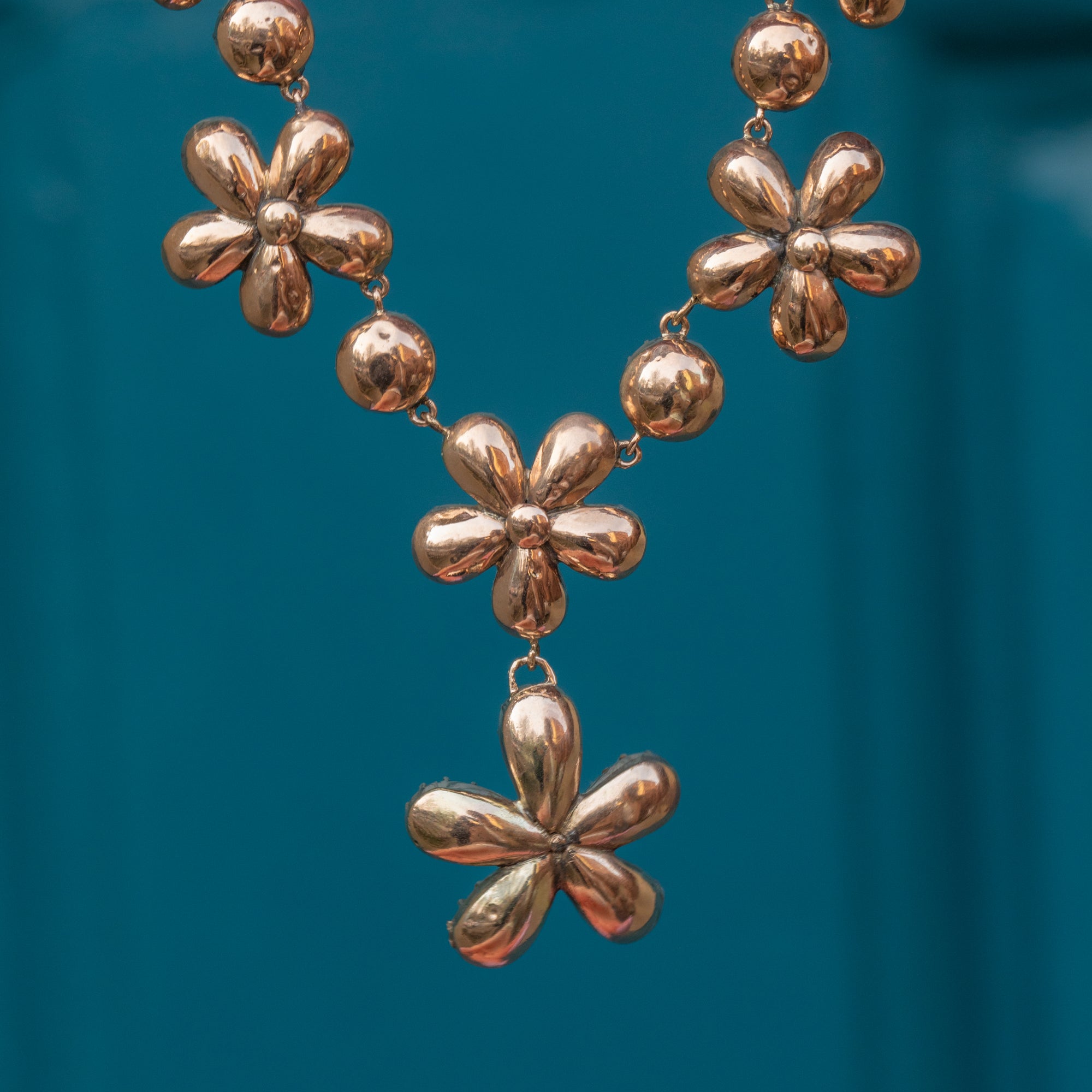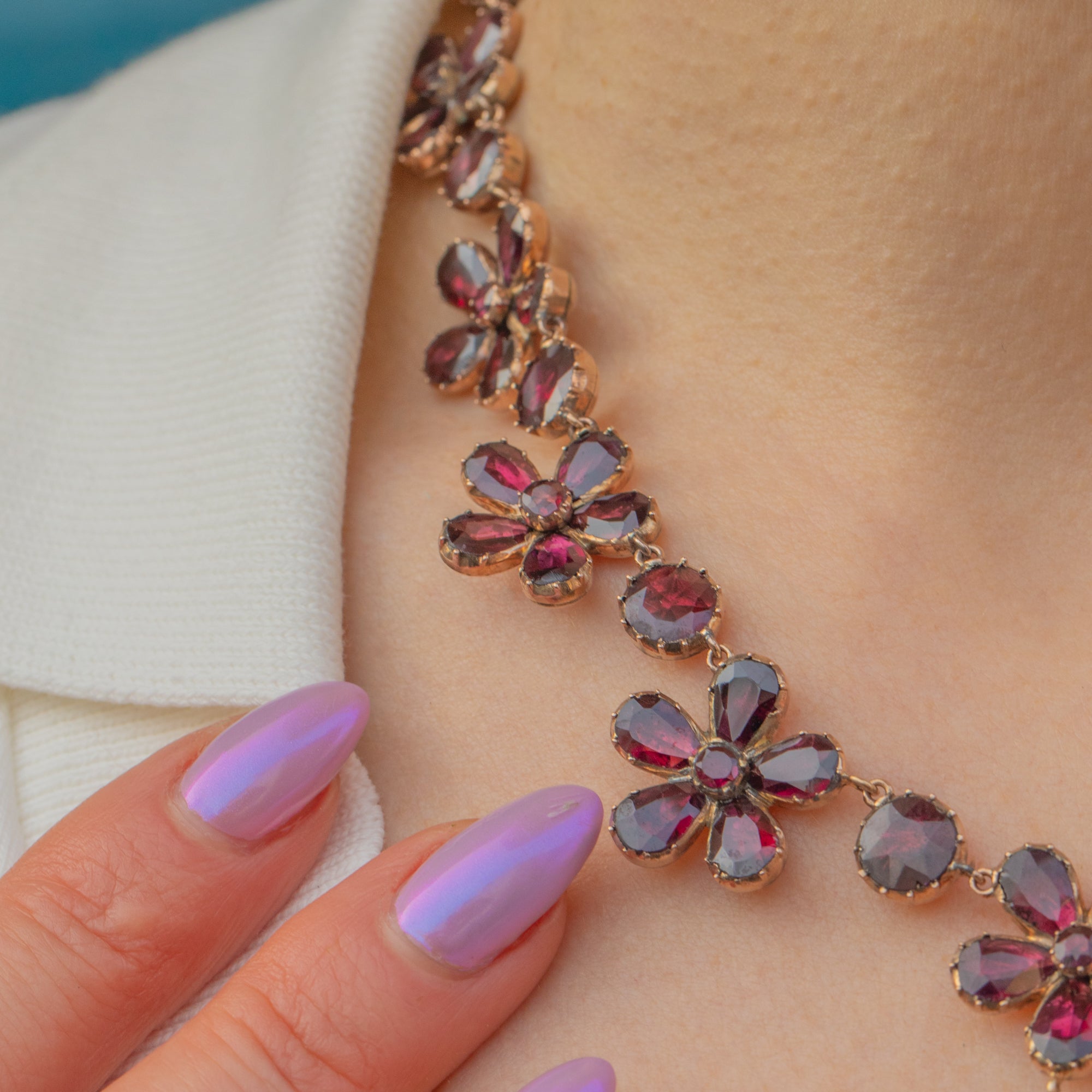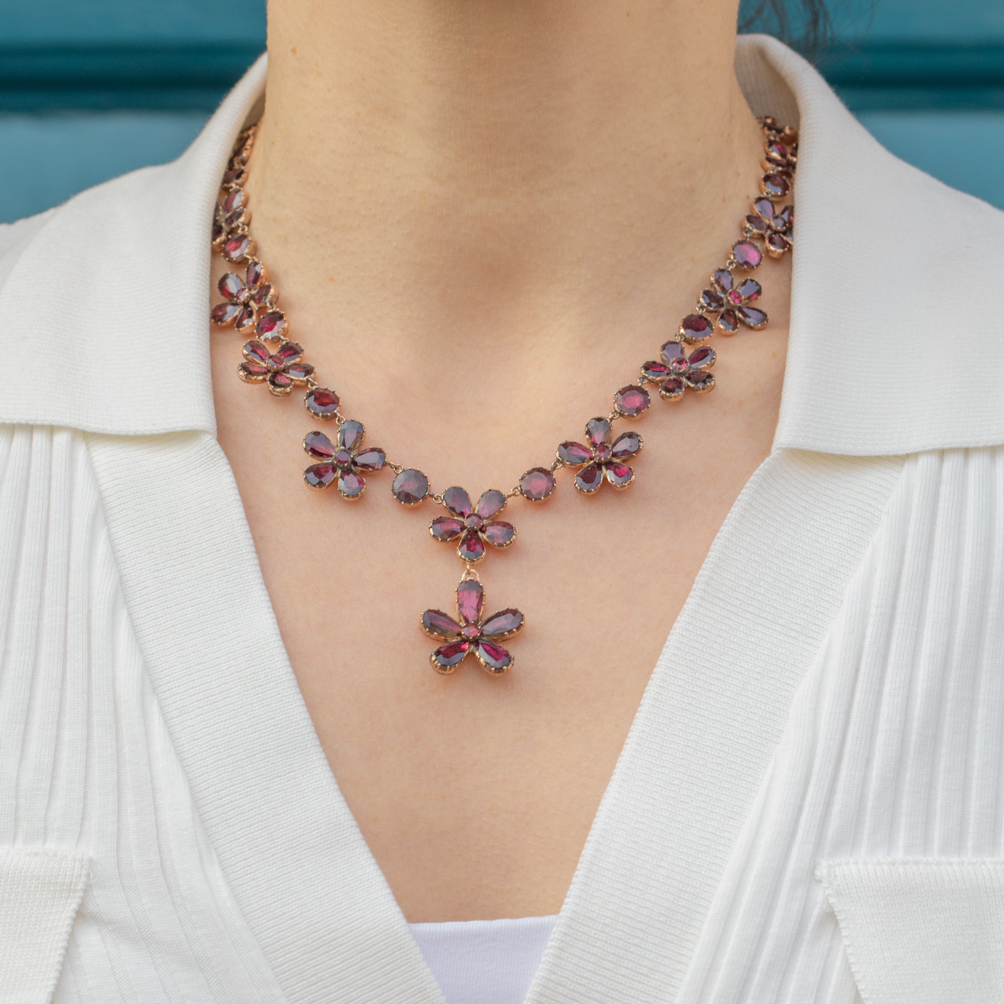 Featuring 18 graduating Garnet pansies, which boast an impressive 19.60ct combined, this antique necklace is rich in colour and saturation, with each Garnet radiating juicy deep fuchsia and plum hues. They are set within warm 9ct Gold settings, providing a lovely lustre and warm finish to this antique beauty.